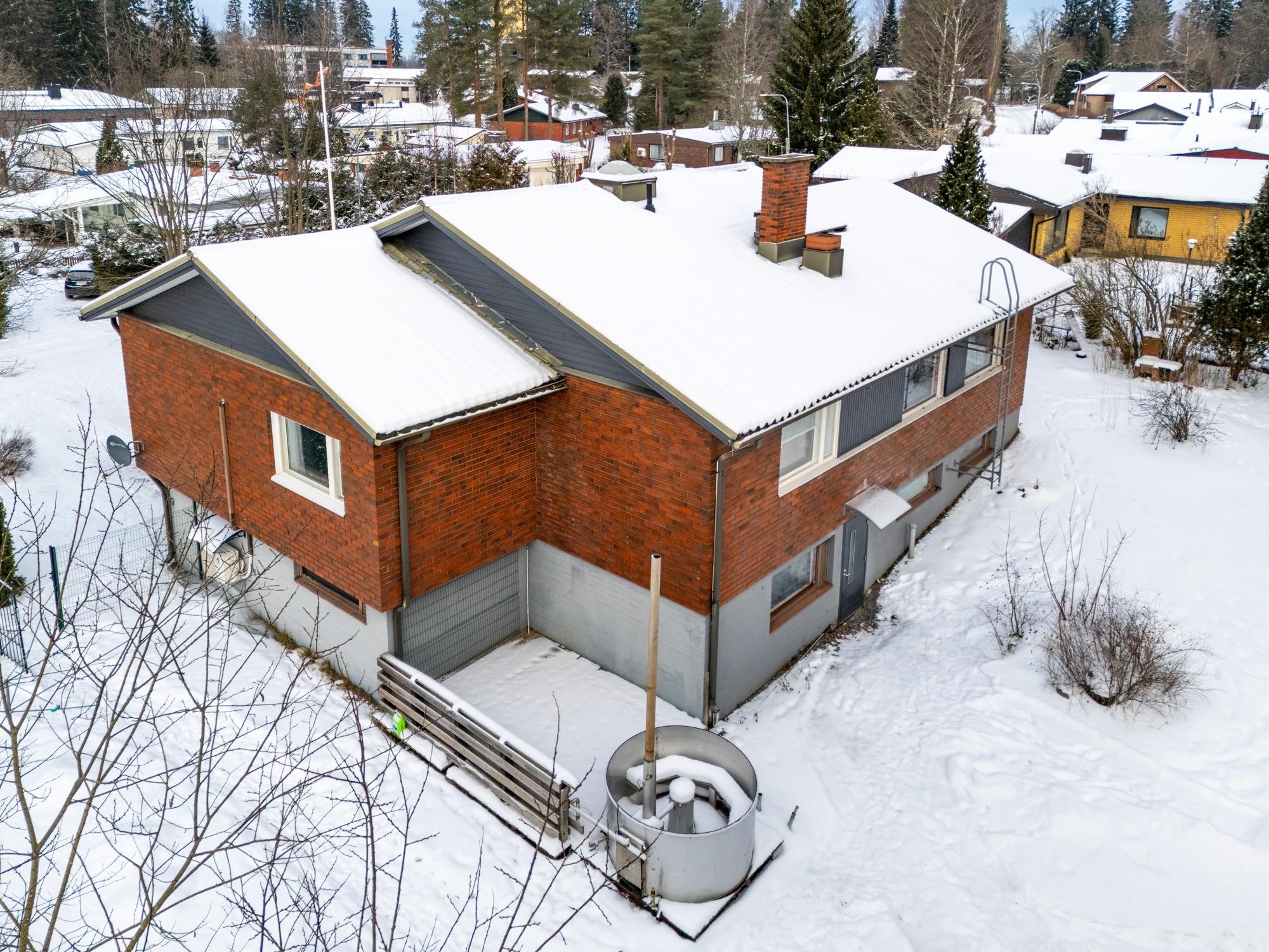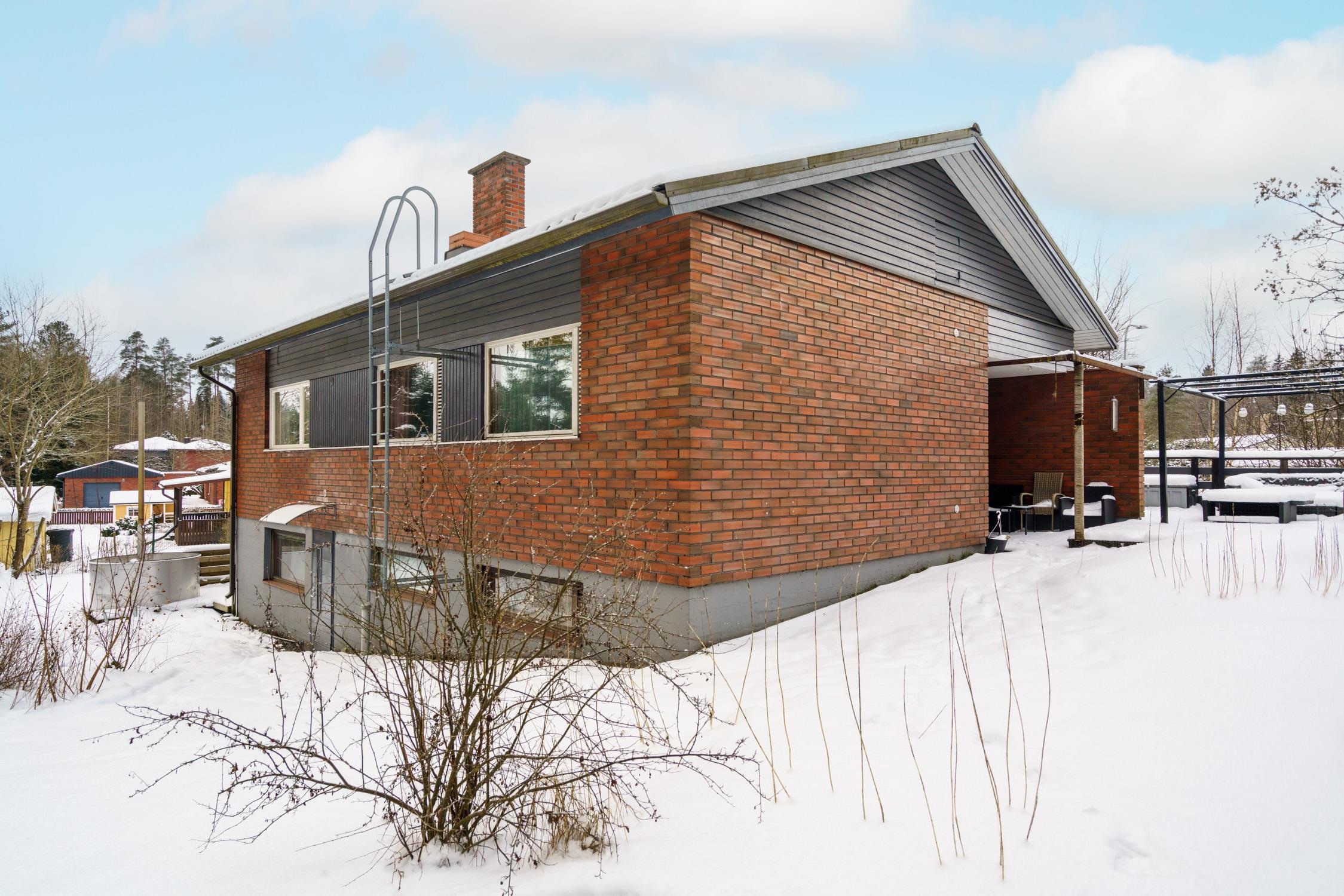 - 154 m2Asuintilojen pinta-alaan on laskettu mukaan rakennuspiirustusten mukainen asuinkerroksen huoneistoala 142m² sekä kellarikerroksesta pesuhuone ja sauna n. 12m² (pinta-ala arvioitu rakennuspiirustuksista). Vuoden 1972 asemapiirroksen mukaan asuinkerroksen huoneistoala on 142m² ja kerrosala 160,2m². Rakennus- ja huoneistorekisteriotteen mukaan huoneistoala 140m² ja kerrosala 240m².
