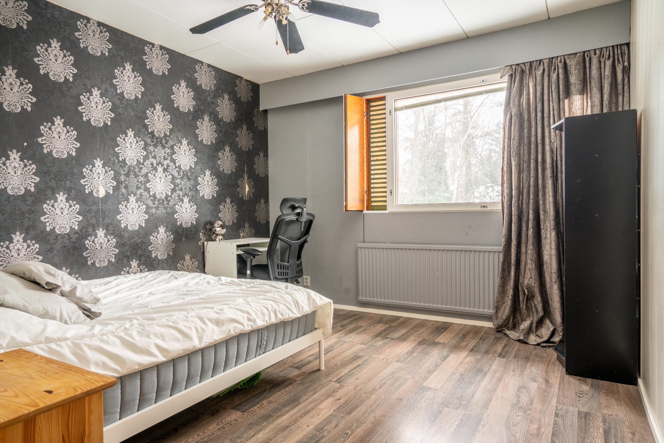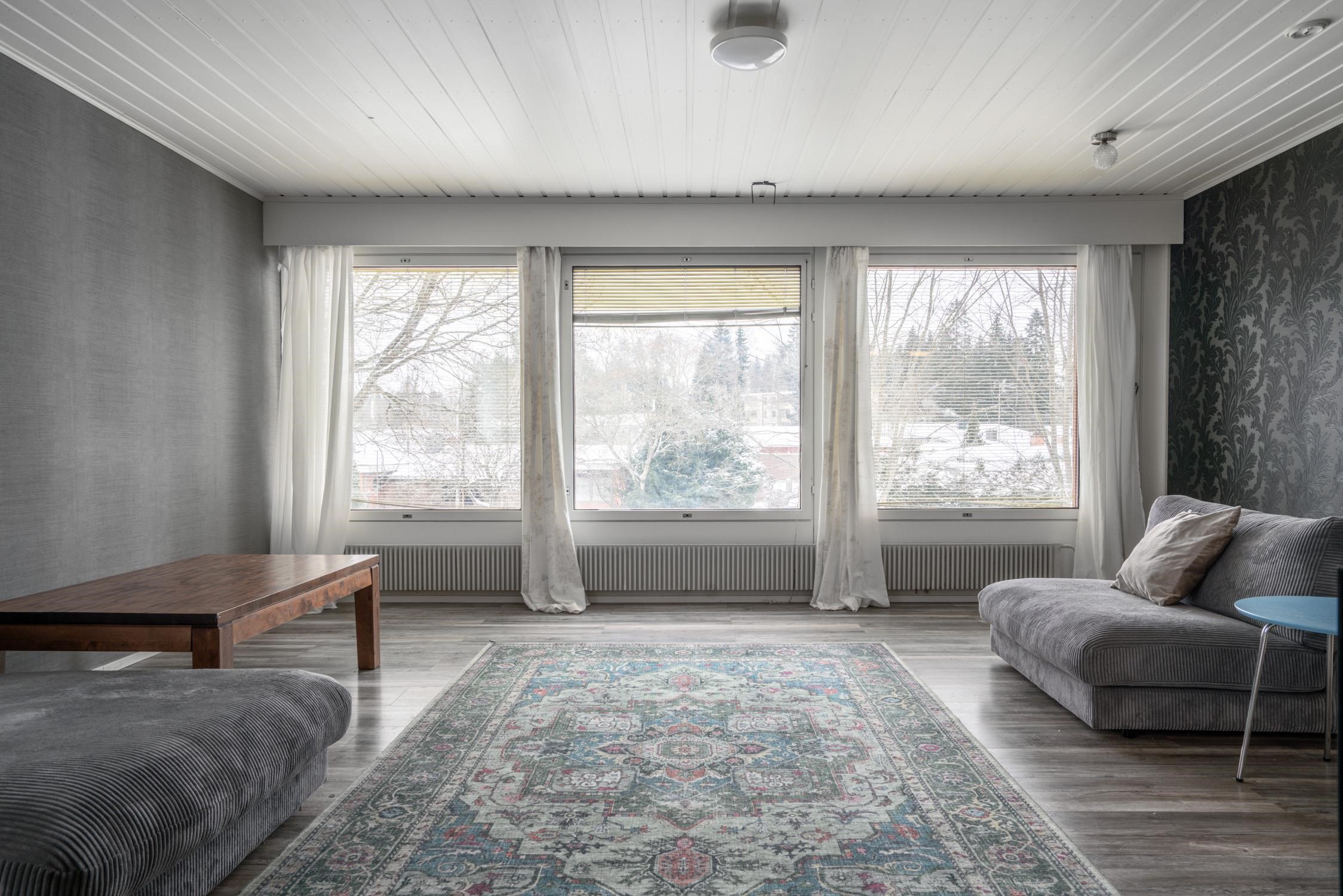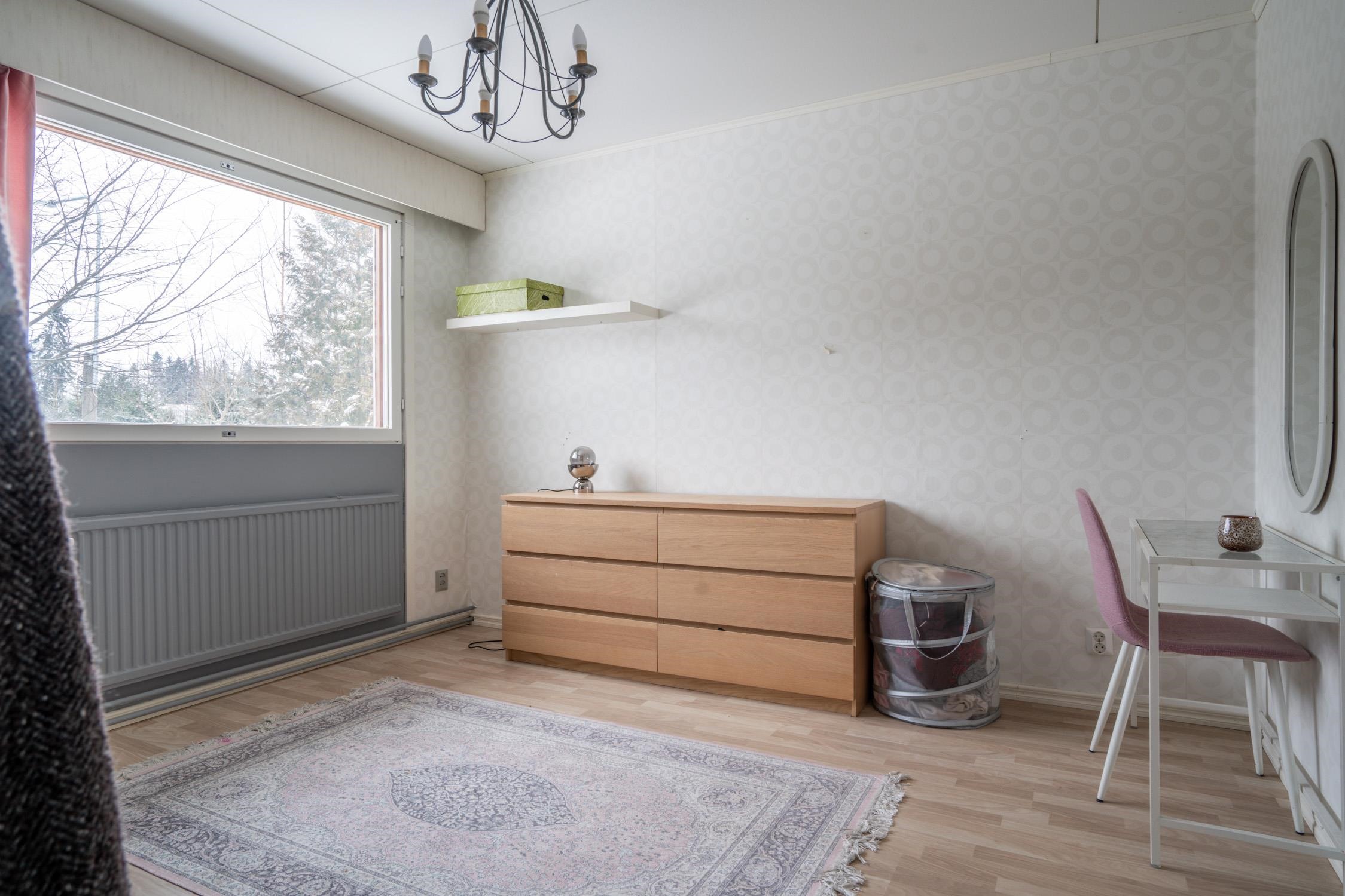 Keittiö: Laminaatti, tapetti. Olohuone: Laminaatti, tapetti. Makuuhuone 1: Laminaatti, tapetti. Makuuhuone 2: Laminaatti, tapetti. Makuuhuone 3: Laminaatti, tapetti. Kodinhoitohuone: Laminaatti, maali. Sauna: Laatta, paneeli. Kylpyhuone: Laatta, laatta. Wc: laatta, laata ja maali.