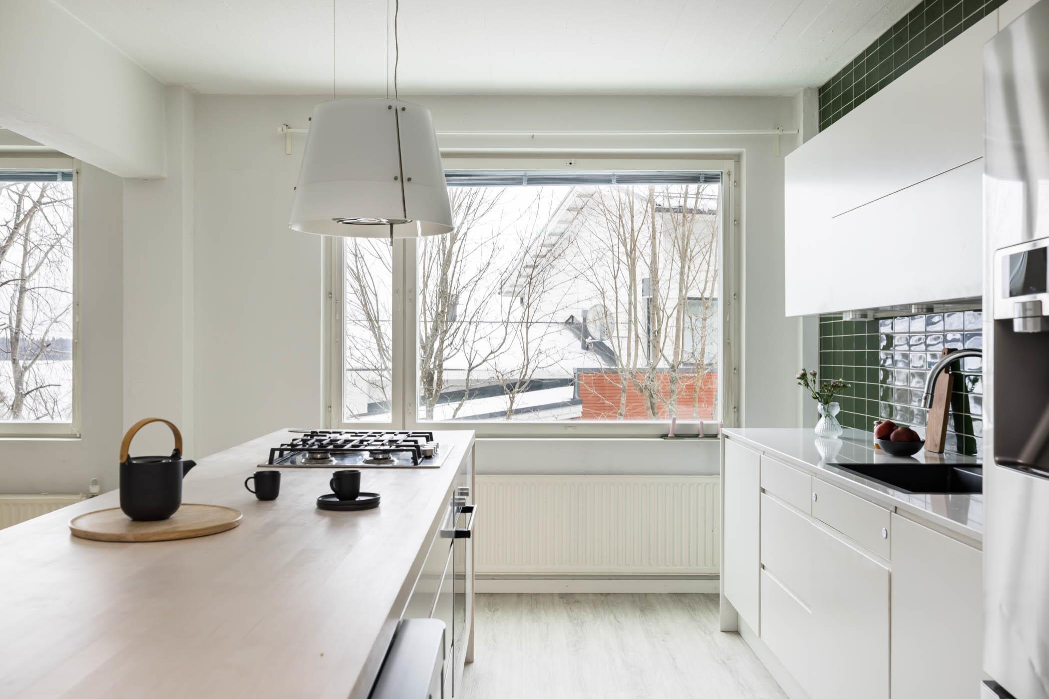 - Kauniisti remontoitu keittiö on (uusittu noin 2019) on kodin sydän. Reilunkokoinen saareke toimii mainiosti tilanjakajana keittiön ja olohuoneen välillä. Isossa saarekkeessa on erillisuuni, kaasuliesitaso ja liesituuletin (aktiivihiilisuodatin lieden yläpuolella). Keittiön kaapistoissa on hyvin säilytystilaa ja työtasoja. Keittiössä on integroitu mikroaaltouuni ja astianpesukone. Saarekkeessa on reilusti säilytystilaa ja pistorasia. Keittiössä on pesukoneliitäntä. Keittiö on uusittu kokonaan 2015.