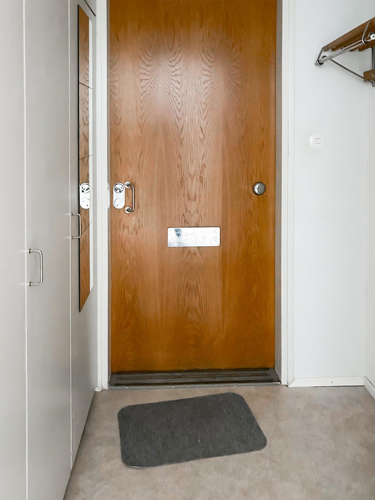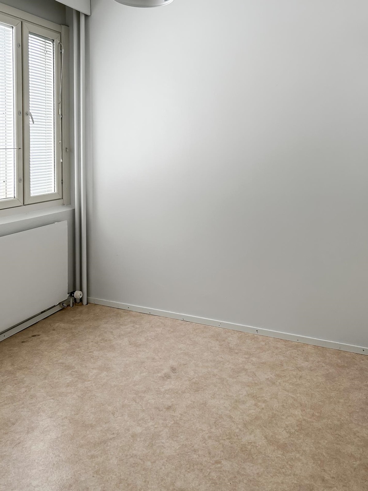Keittiö: maalia seinissä, muovimatto lattiassa. Olohuone: tapettia seinissä, muovimatto lattiassa. Kylpyhuone: laatoitettu. Eteinen: maalia seinissä, muovimatto lattiassa.