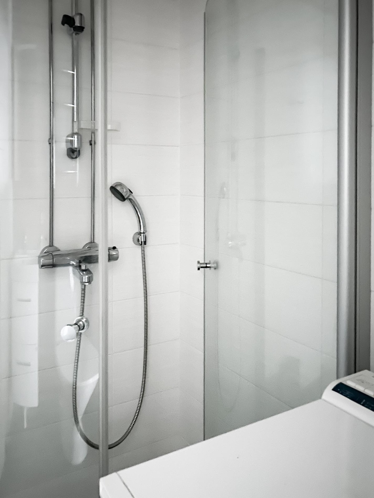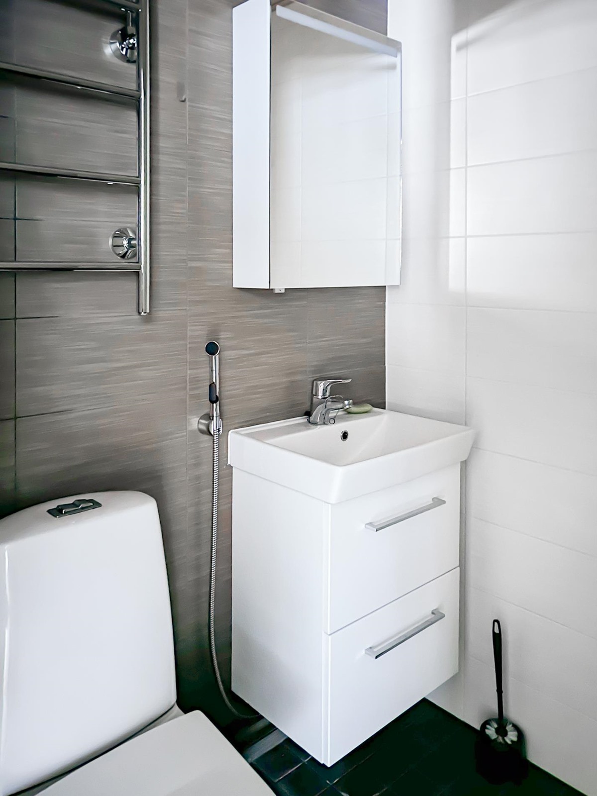 - Kylpyhuone jossa wc, suihku, suihkukaappi, peilikaappi, allaskaappi, pesukoneliitäntä, lattialämmitys, kiinteät valaisimet.