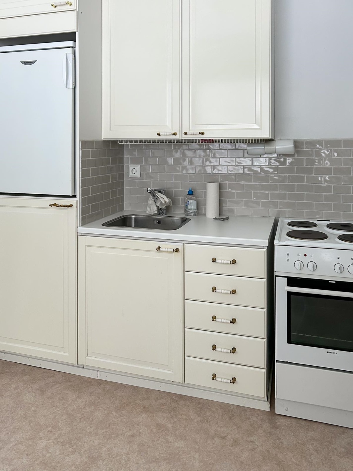 - Jääkaappi jossa pakastinlokero, sähköliesi, kaapistot, kiinteät valaisimet.