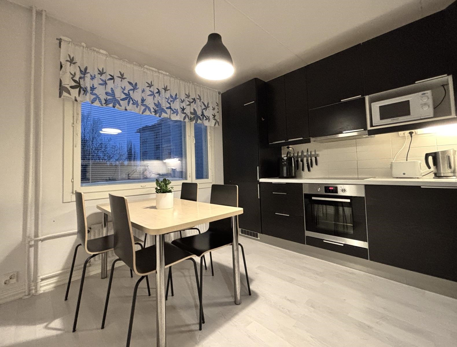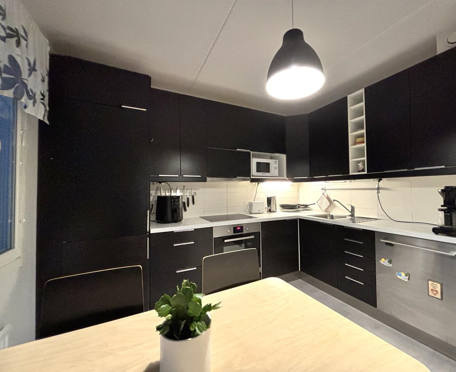 - Keittiön varusteet: jääkaappipakastin, induktioliesitaso, kiertoilmauuni, liesituuletin, astianpesukone, tummat kaapistot. Keittiöremontti tehty vuonna 2010, keittiön laminaattilattia uusittu 2022