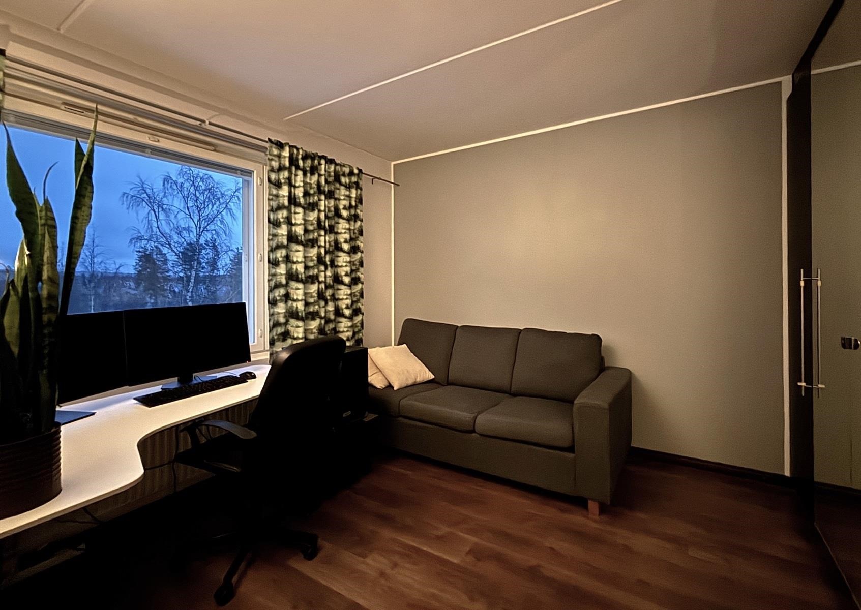 Keittiössä laminaattilattia, seinät maalattu ja kaapistojen välitilassa kaakelit. Olohuoneen lattiassa on laminaatti, seinissä maalattu lasikuitutapetti/kuviotapetti. Makuuhuoneissa on laminaattilattiat ja maalatut seinät. Kylpyhuone/wc:ssä on laattalattia, seinissä kaakelit, jotka maalattu.