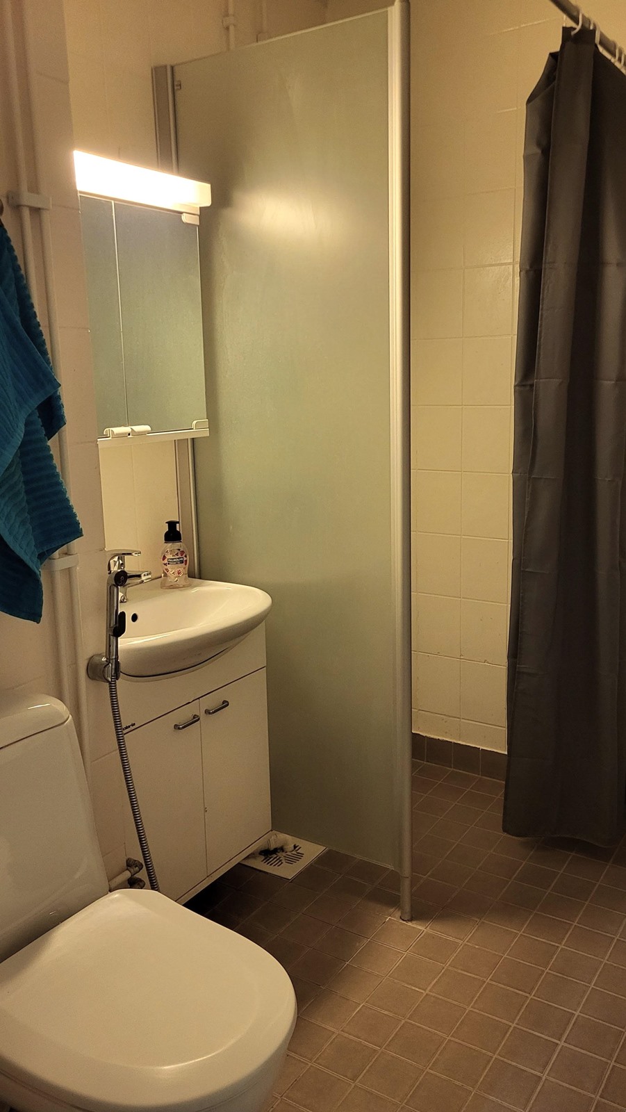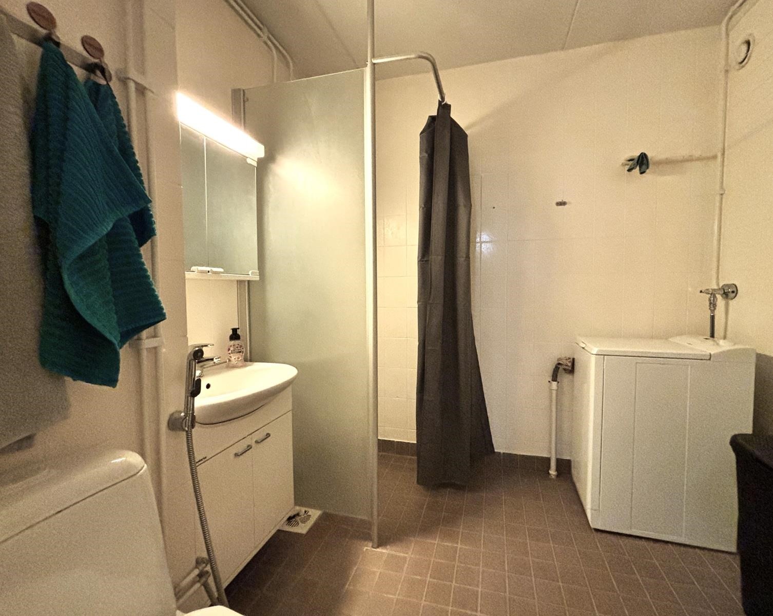 - Kylpyhuone/wc:ssä on suihku, suihkuseinä, peilikaappi, allaskaappi, pesukoneliitäntä ja lattialämmitys.