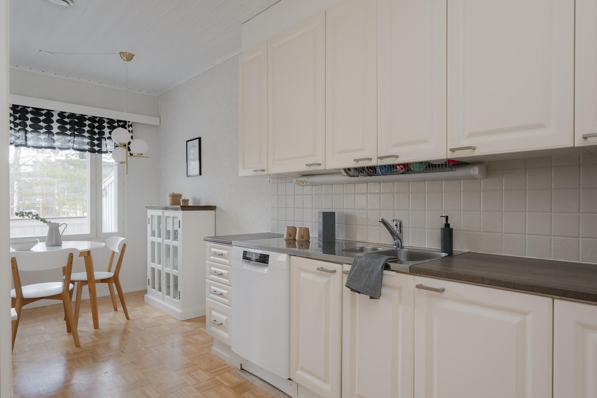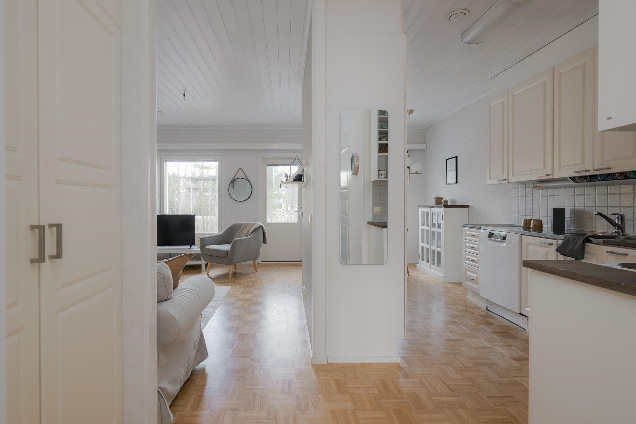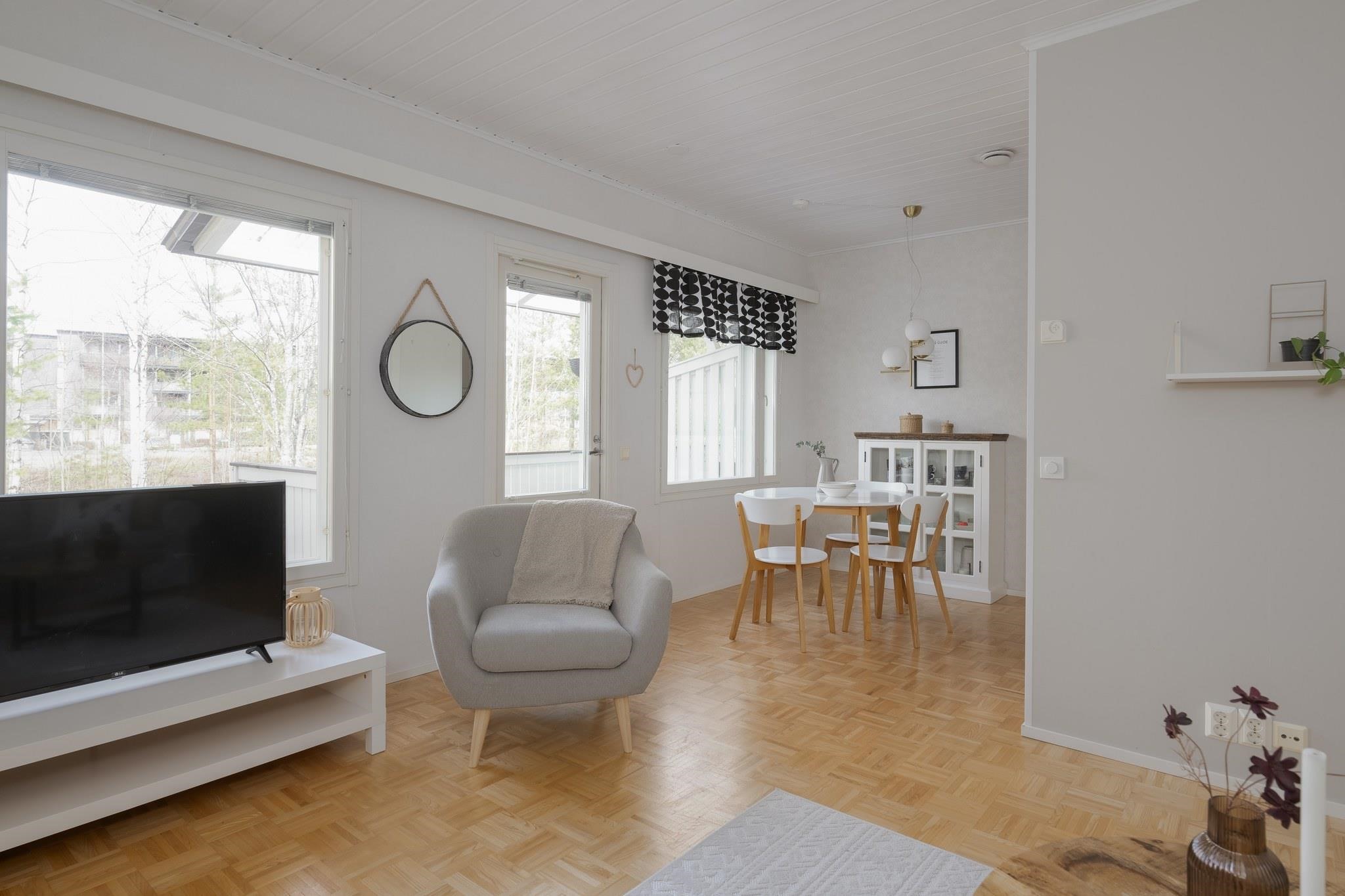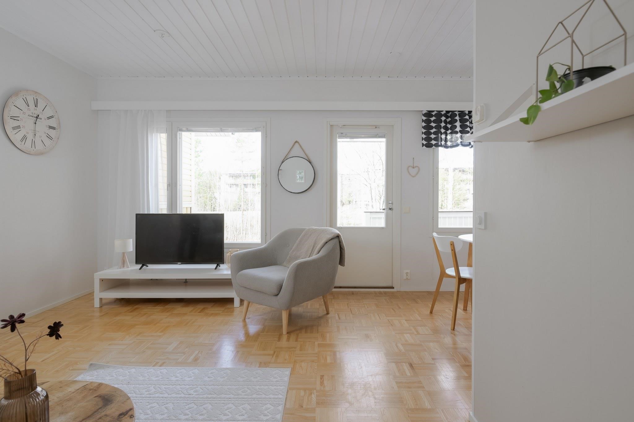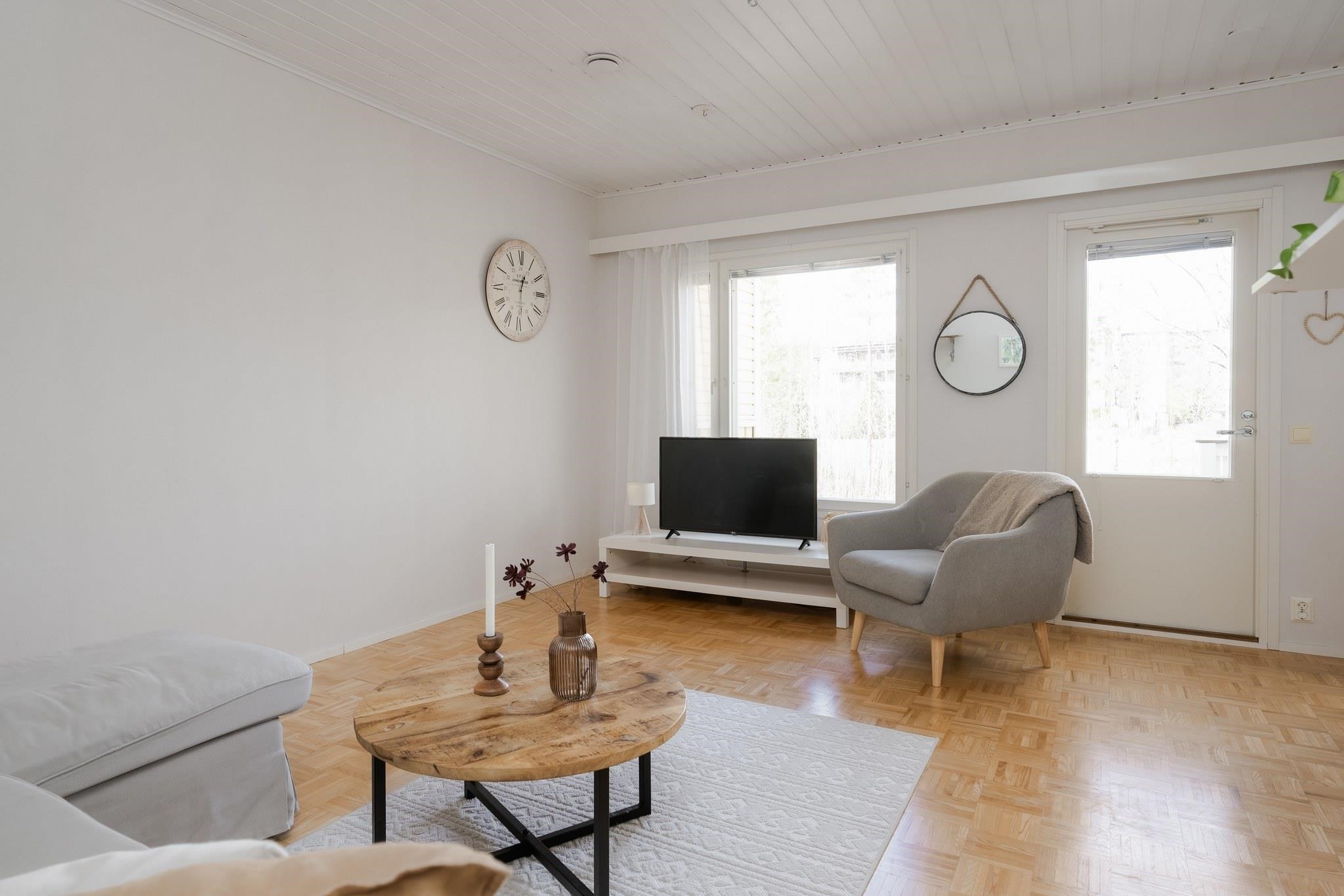 Piha rajoittuu upean vehreään puistoalueeseen, joten lapset voivat touhuilla ulkona turvallisesti. Kodin pintoja on päivitetty ja paneelikatto saanut valkean sävyn. Olohuone on tilava ja keittiö kivasti rajattu seinäkkeellä. Asunnon isot ikkunat tuovat kivasti valoa myös keittiön ruokailutilaan. Kylpyhuoneremontti on juuri valmistunut ja samalla uusittiin saunan panelointi ja asennettiin Harvian pilarikiuas.