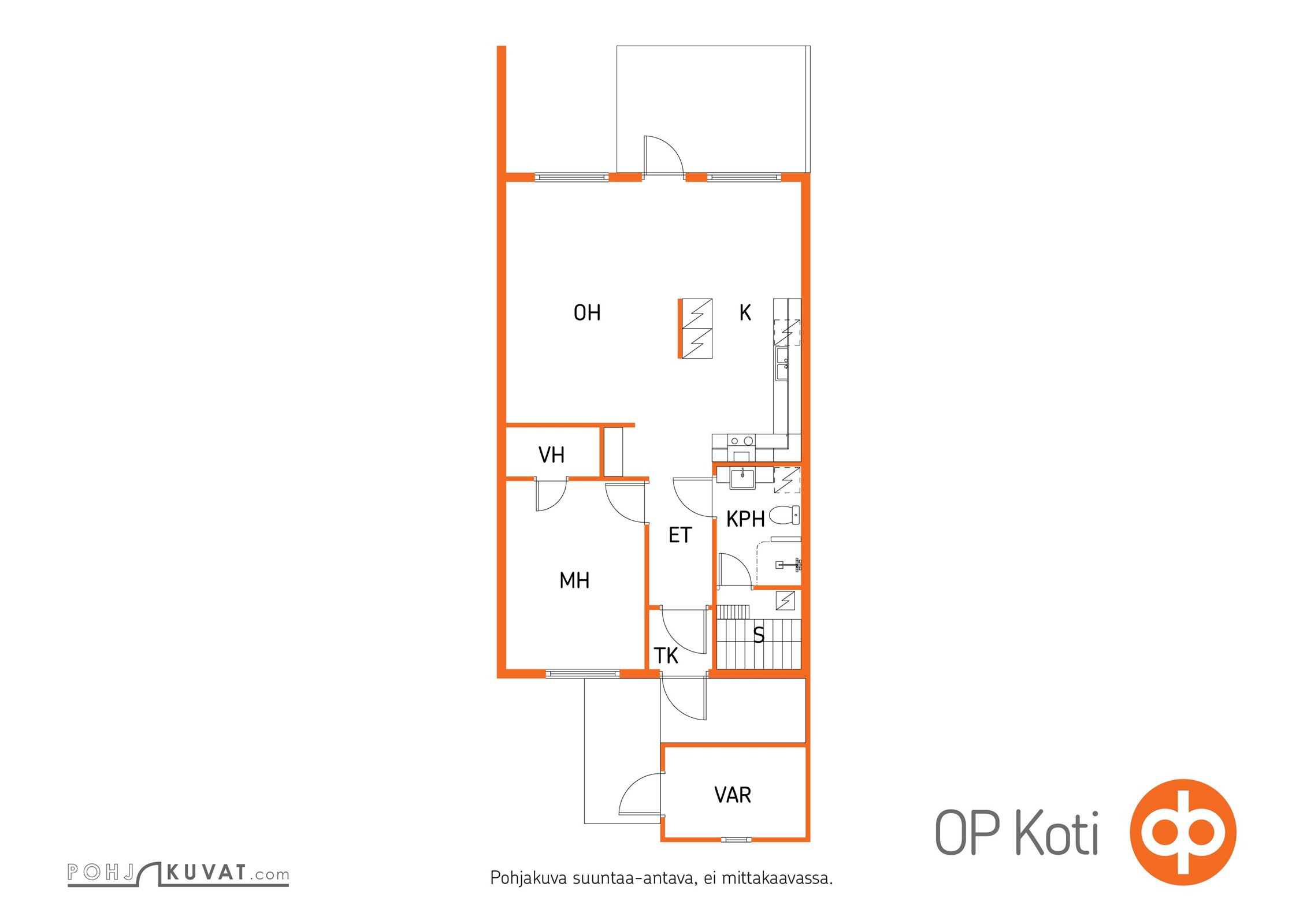 - Keittiö, olohuone, terassi luoteeseen, makuuhuone kaakkoon
