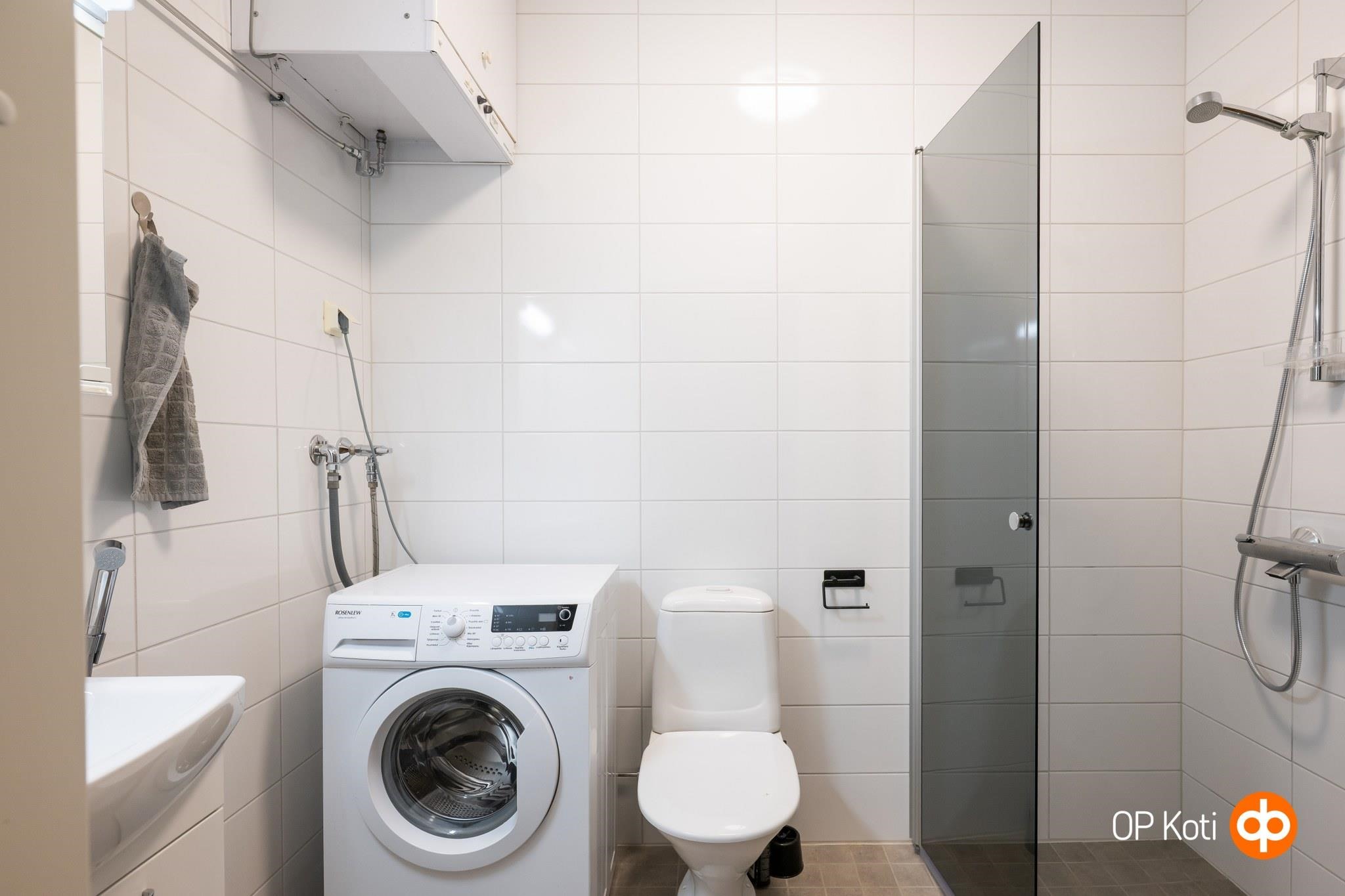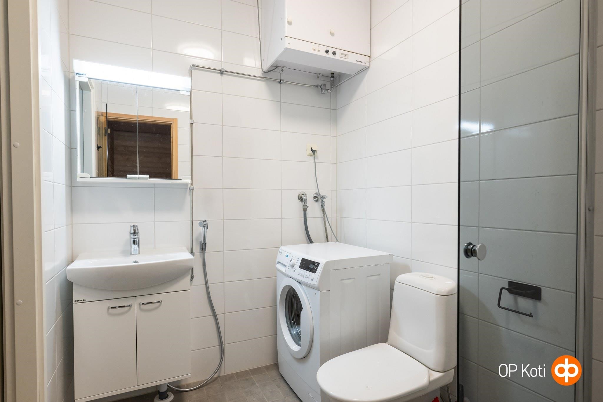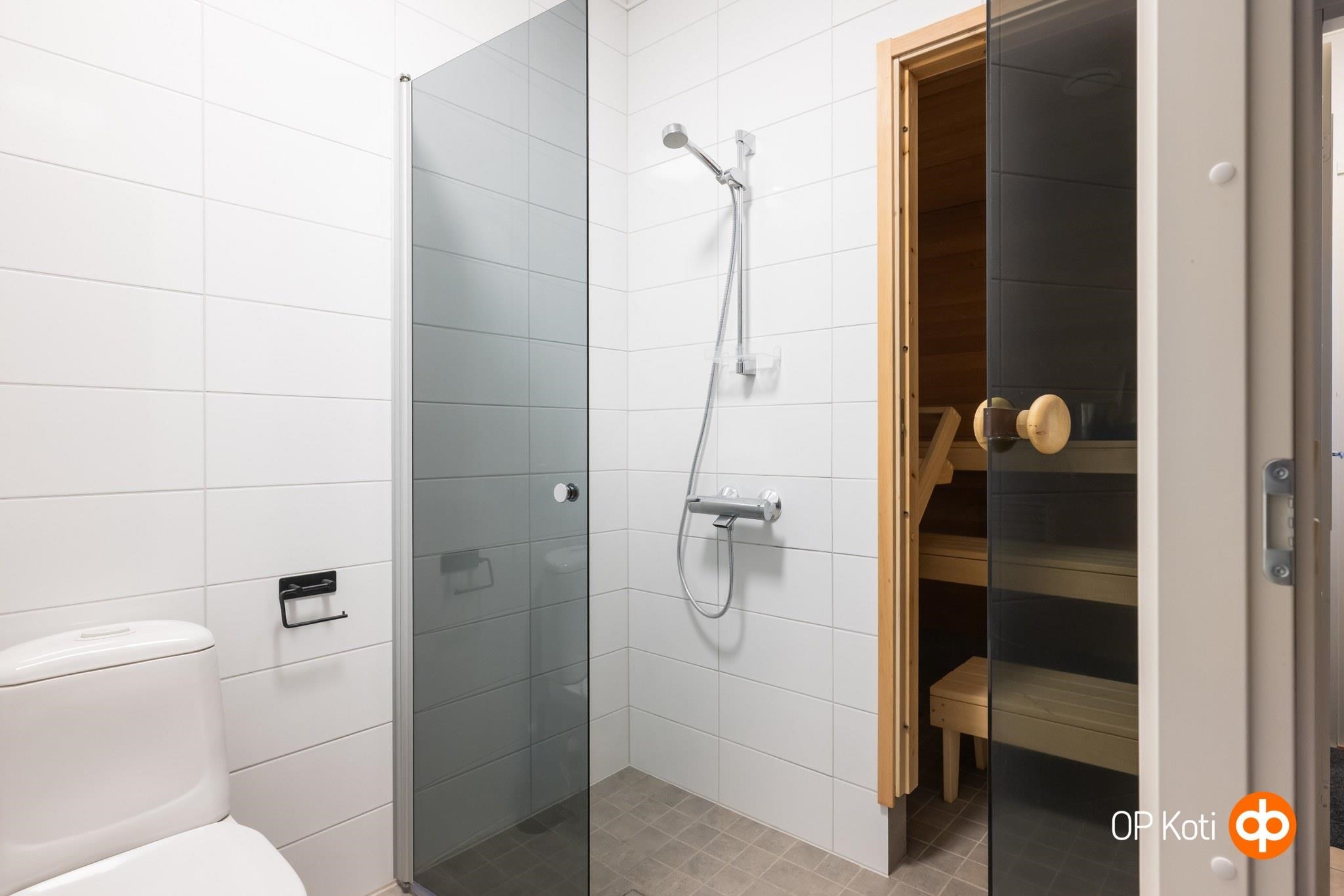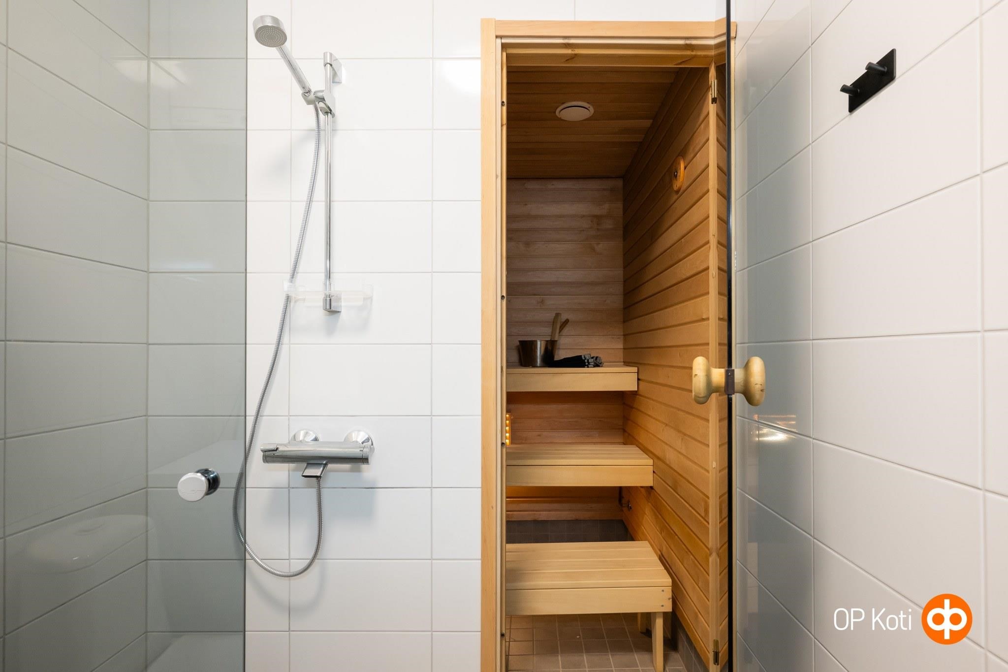- Sauna, sähkökiuas (12/2025 Harvia pilarikiuas), kylpyhuone, suihku, suihkuseinä, peilikaappi, kaapit, allaskaappi, pesukoneliitäntä, kiinteät valaisimet. Saunan panelointi uusittu 12/2025