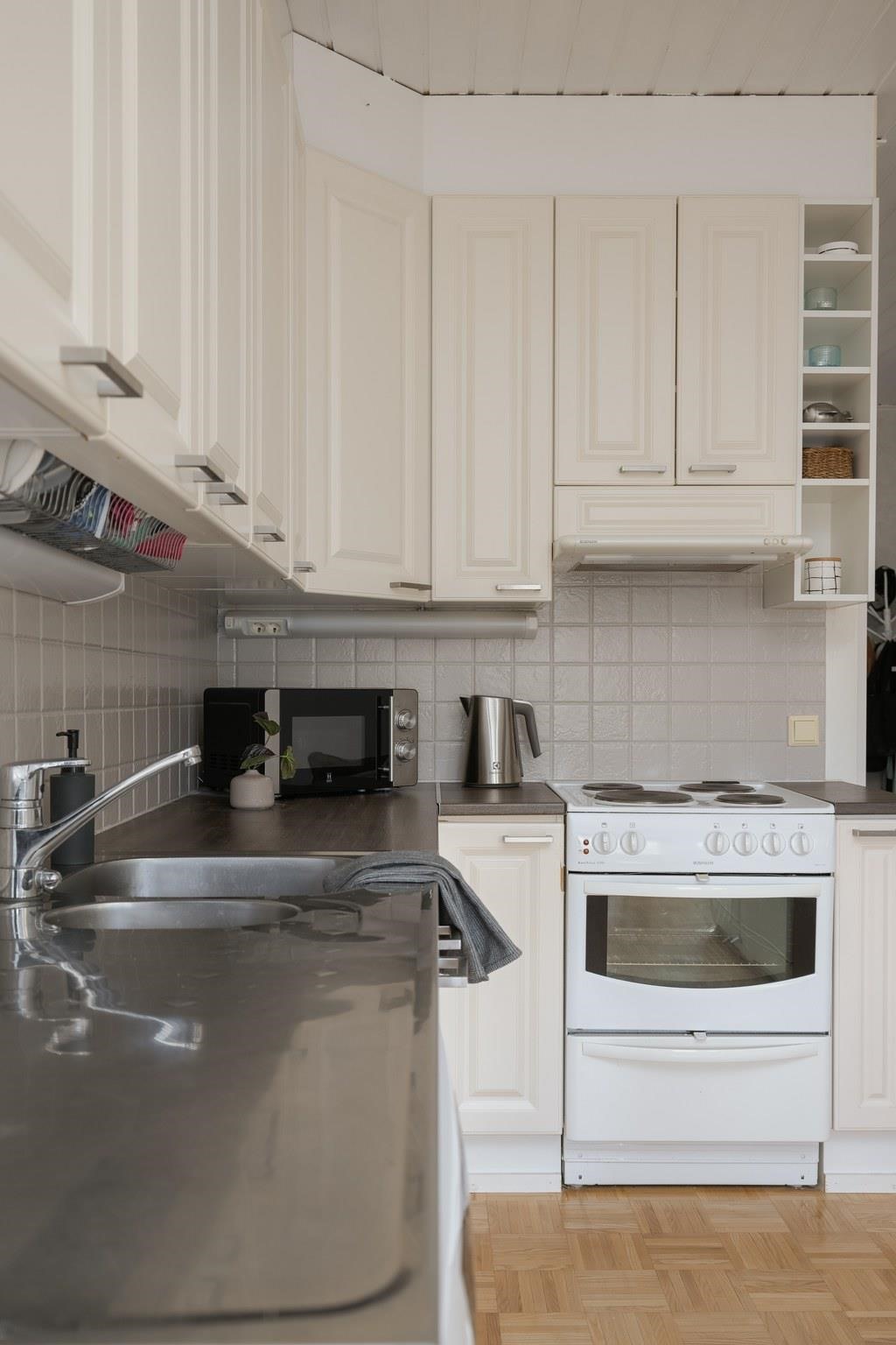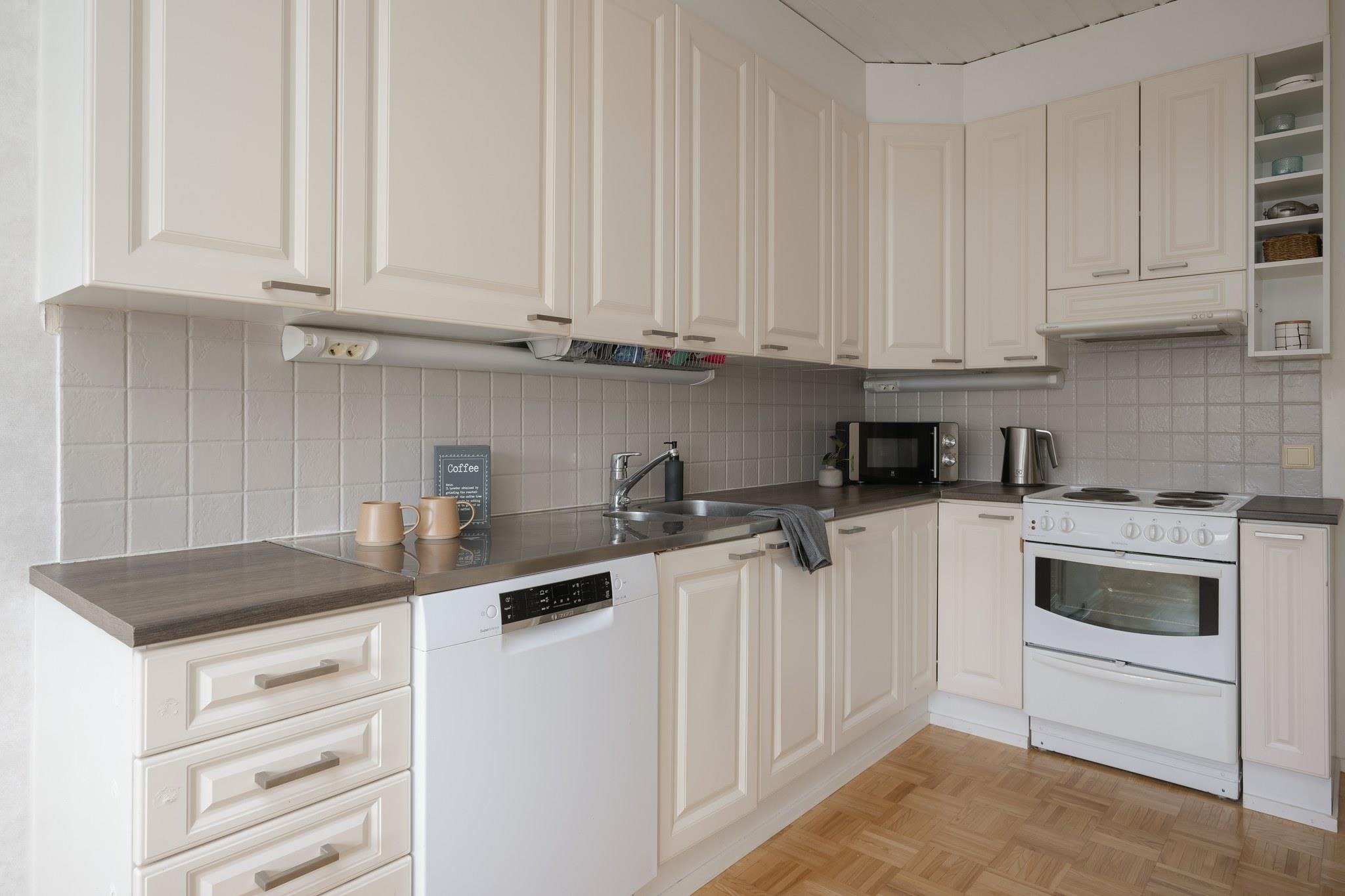 - Jääkaappi, jääkaappipakastin, sähköliesi, liesikupu, astianpesukone (2021), kaapistot, kiinteät valaisimet.