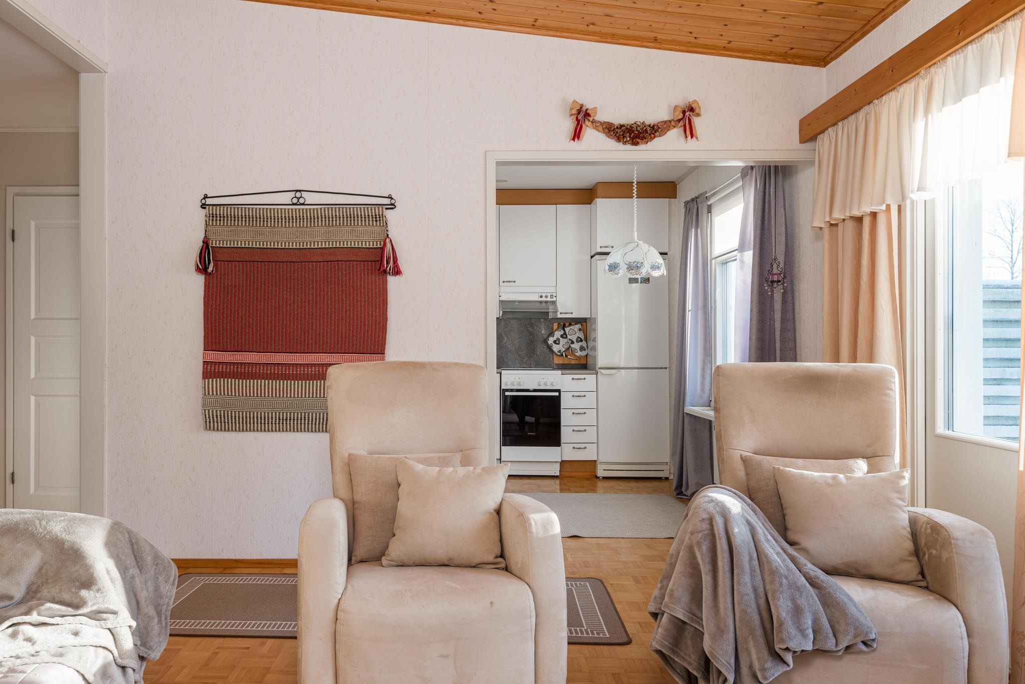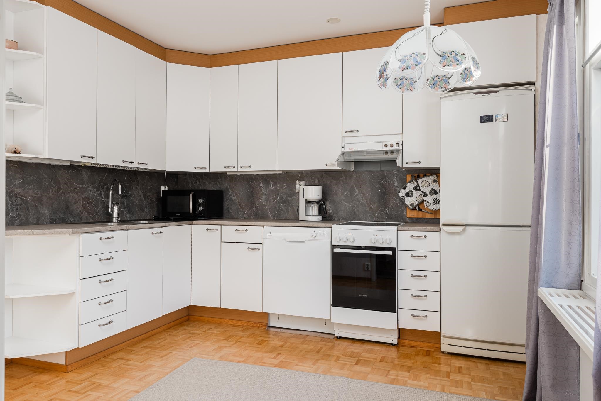 - Jääkaappipakastin, keraaminen liesi, liesituuletin, astianpesukone, kaapistot, kiinteät valaisimet.