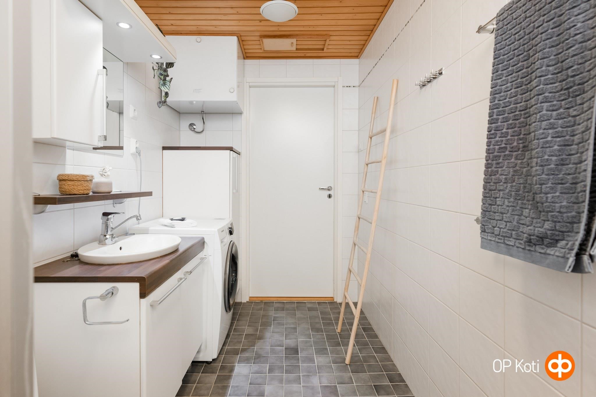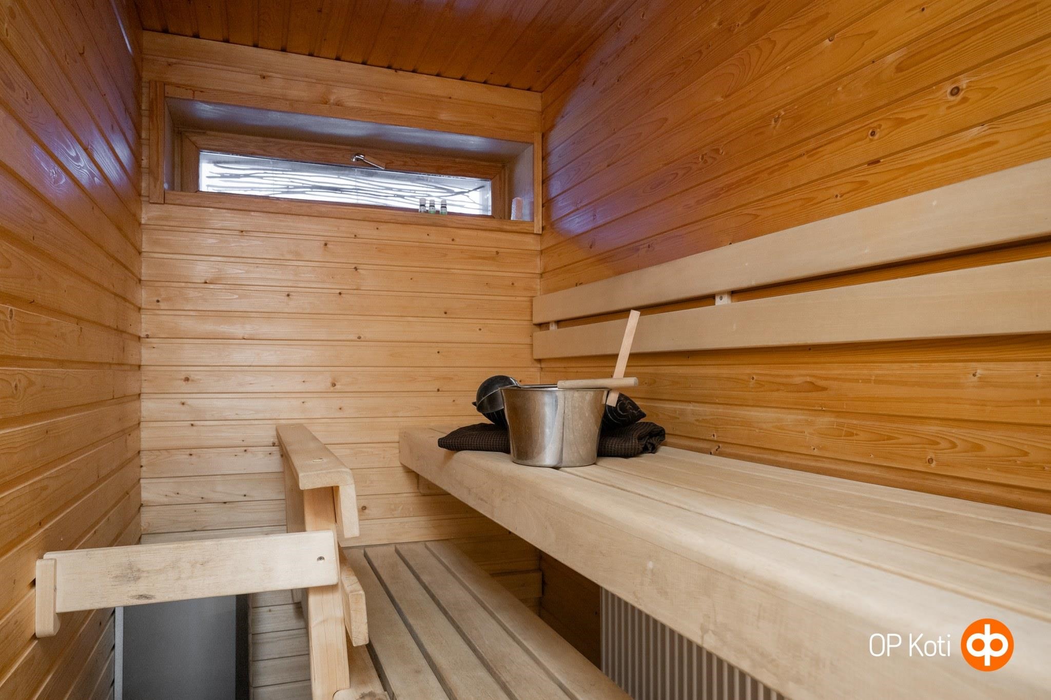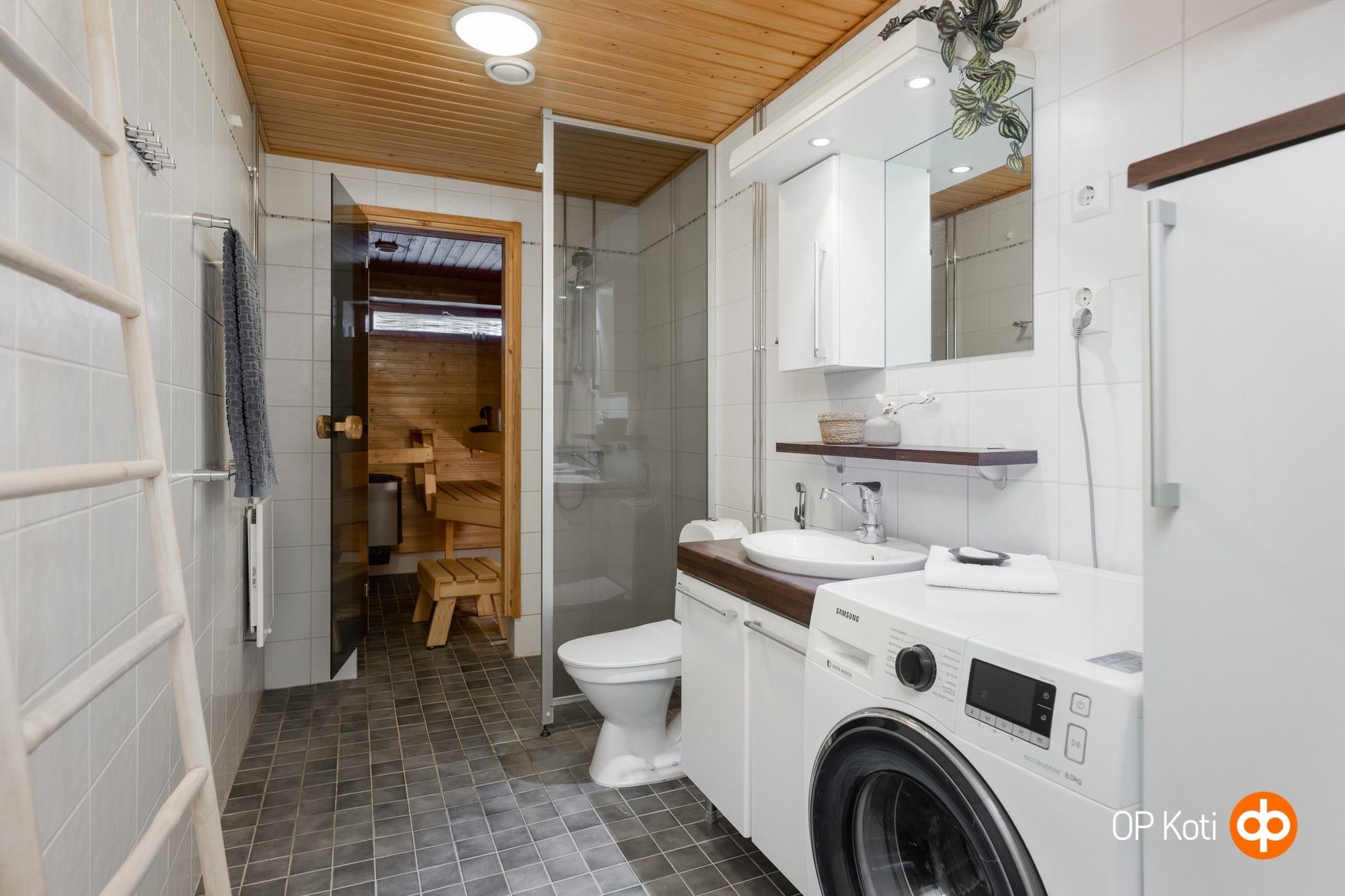 - Sauna, sähkökiuas, kylpyhuone, suihku, suihkuseinä, peilit, peilikaappi, kaapit, allaskaappi, pesukoneliitäntä, lattialämmitys (sähköinen), kiinteät valaisimet. Pyykinpesukone . Saunassa ikkuna