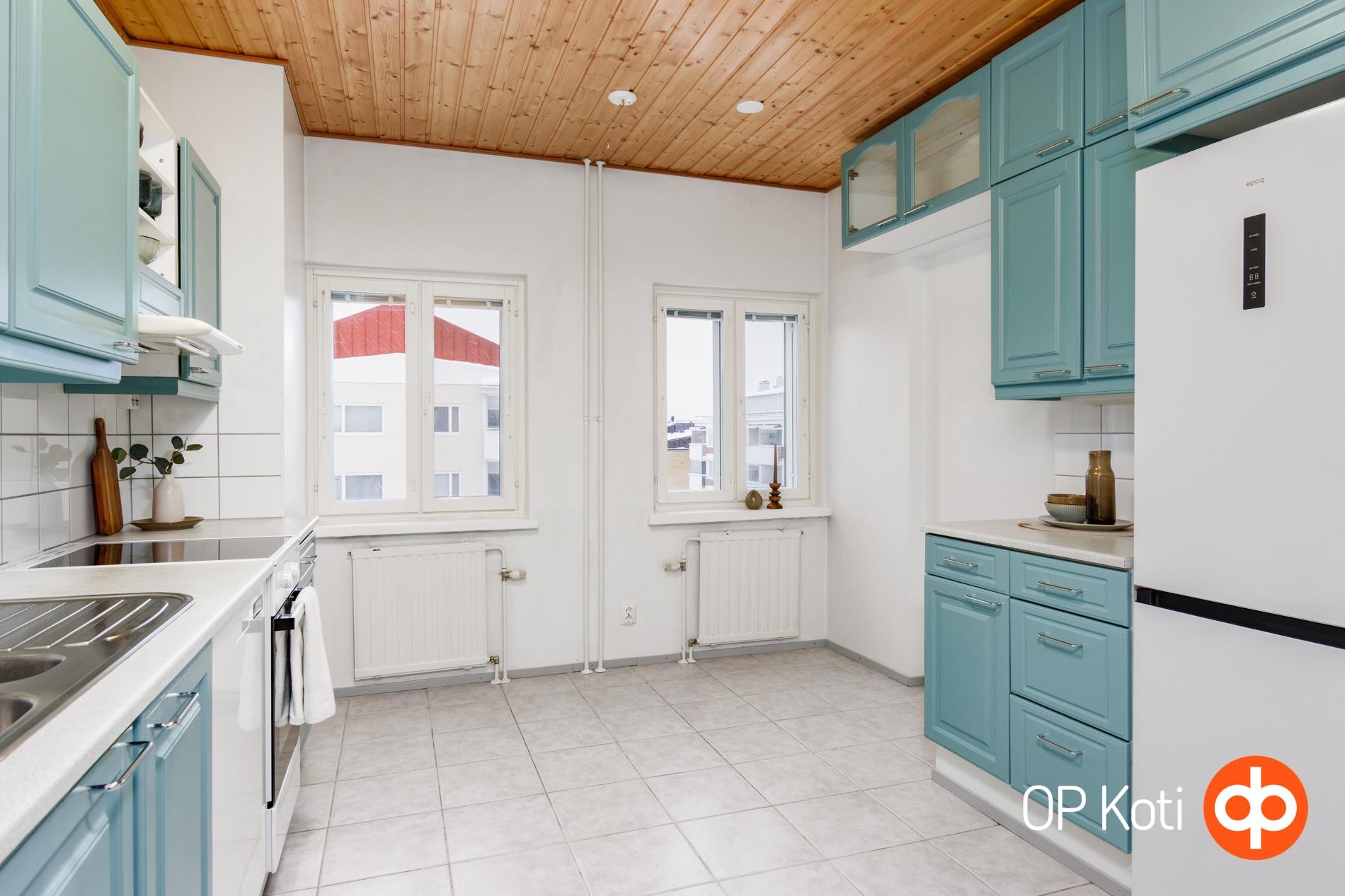 Keittiö on tilava ja inspiroiva paikka kokkailla, ja ikkunoista avautuva näkymä Puijon tornille tuo keittiöön oman ainutlaatuisen tunnelmansa. Valoisa olohuone kokoaa perheen ja ystävät yhteen, ja sieltä on käynti mukavalle parvekkeelle, jossa voi nauttia kaupungin tunnelmasta ja rauhallisista hetkistä.