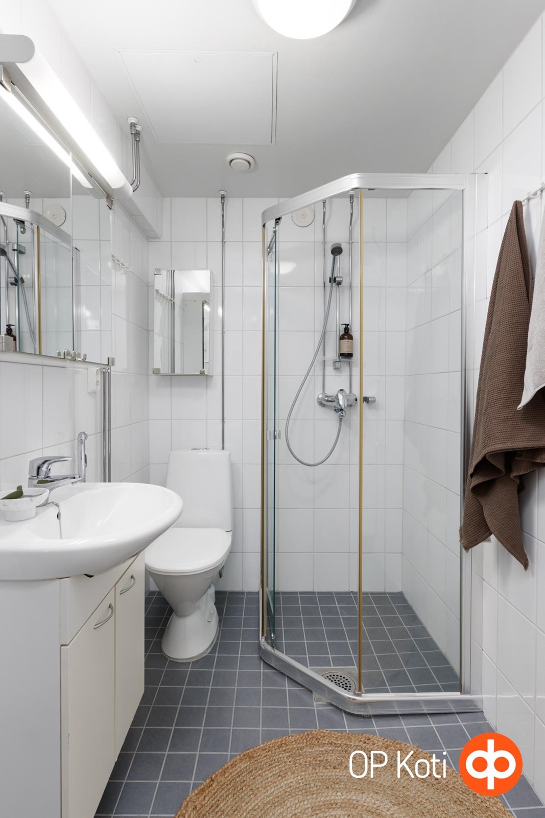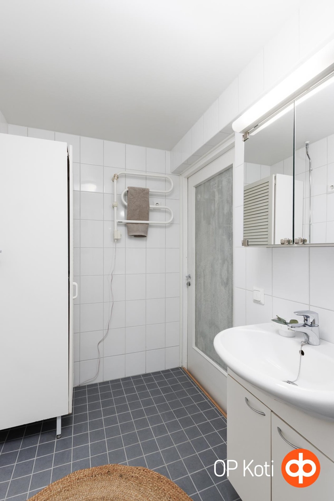 - Kylpyhuone, suihku, suihkukaappi, peilit, pesukoneliitäntä, lattialämmitys, kiinteät valaisimet.