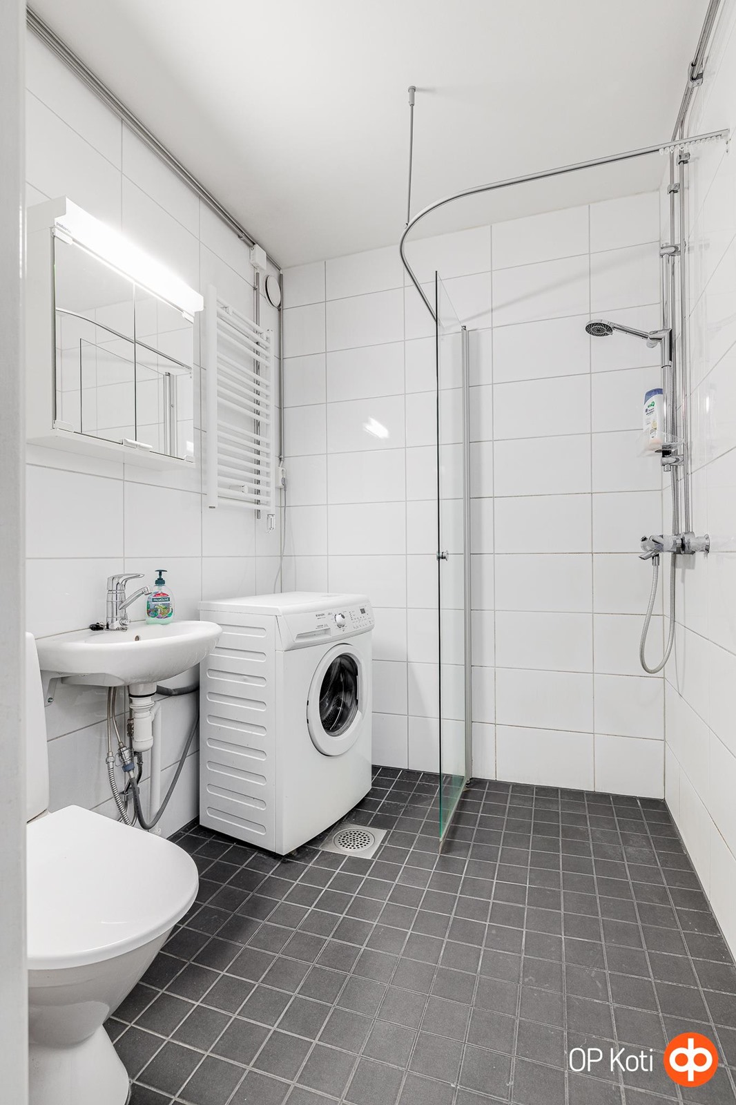 - Kylpyhuone, suihku, suihkuseinä, peilikaappi, pesukoneliitäntä, kiinteät valaisimet, Pyyhekuivain vesikiertoinen. Kylpyhuone on uusittu täysin vuonna 2017.