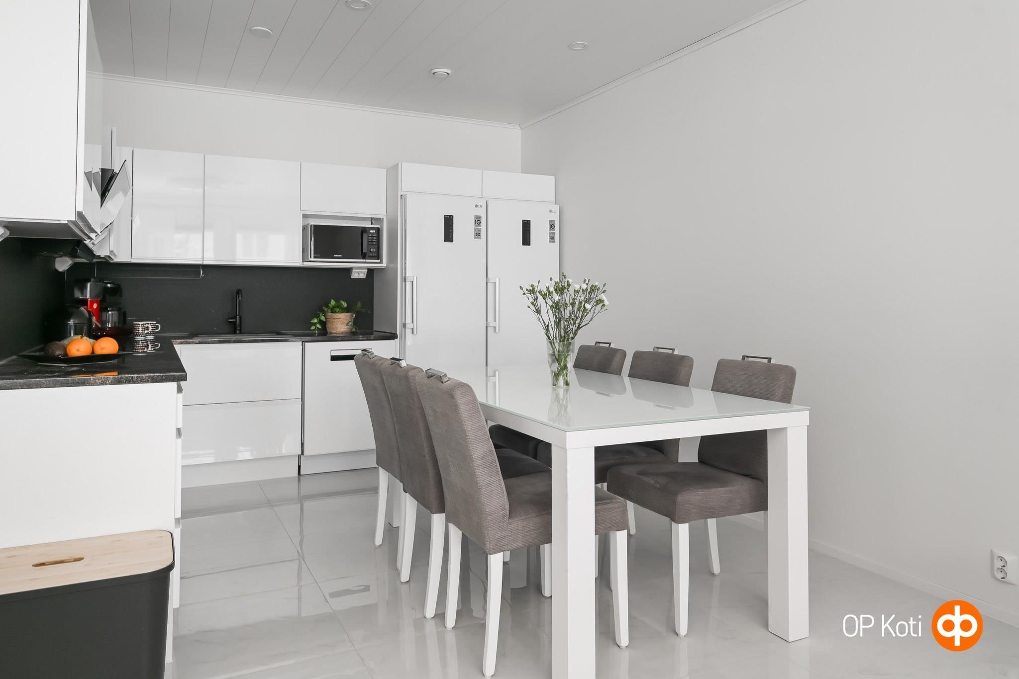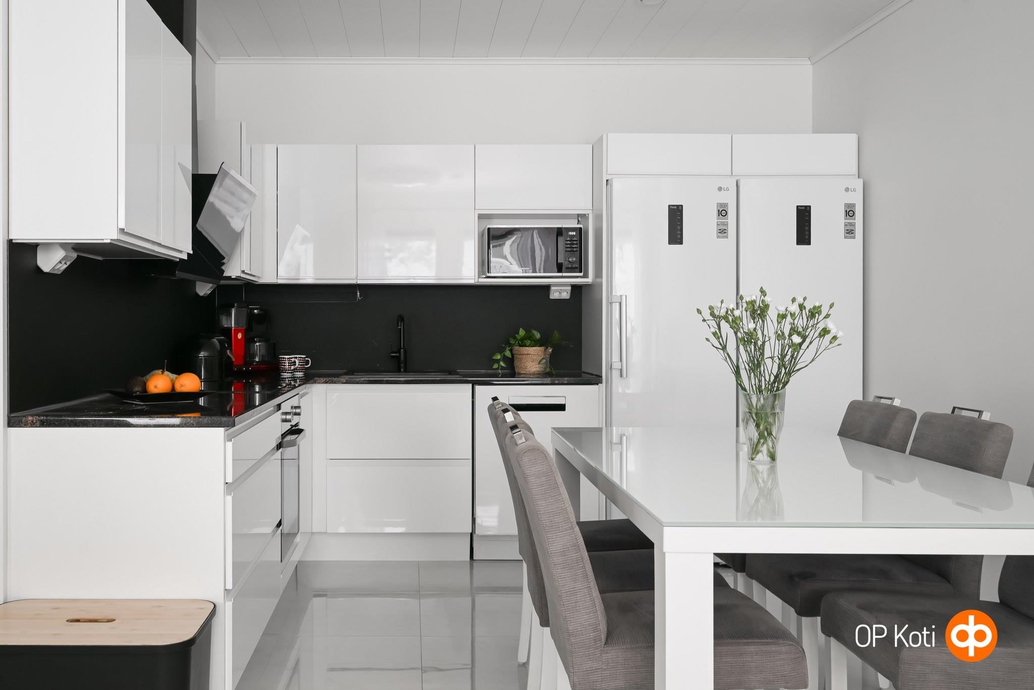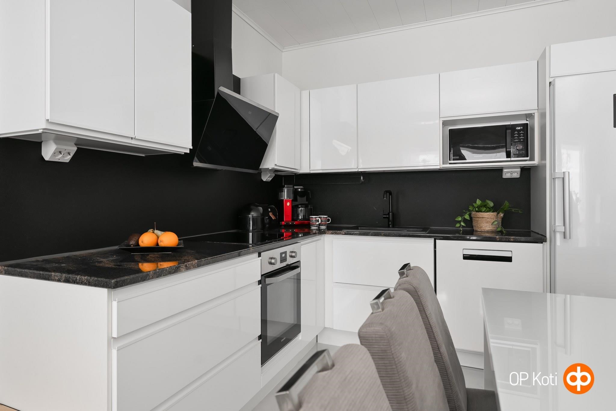 - Jääkaappi LG täyskorkea, pakastekaappi LG täyskorkea, erillisuuni Samsung, induktioliesi Samsung, liesituuletin Franke, astianpesukone Beko, kaapistot, kiinteät valaisimet Led välitilassa, pöytätasojen materiaali kivitasot. Puusepänliike Astikainen keittiö