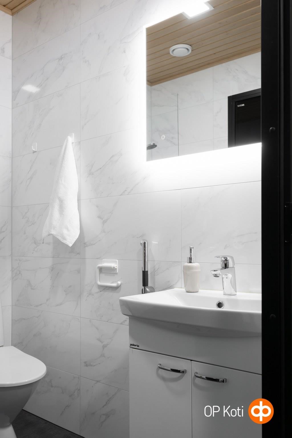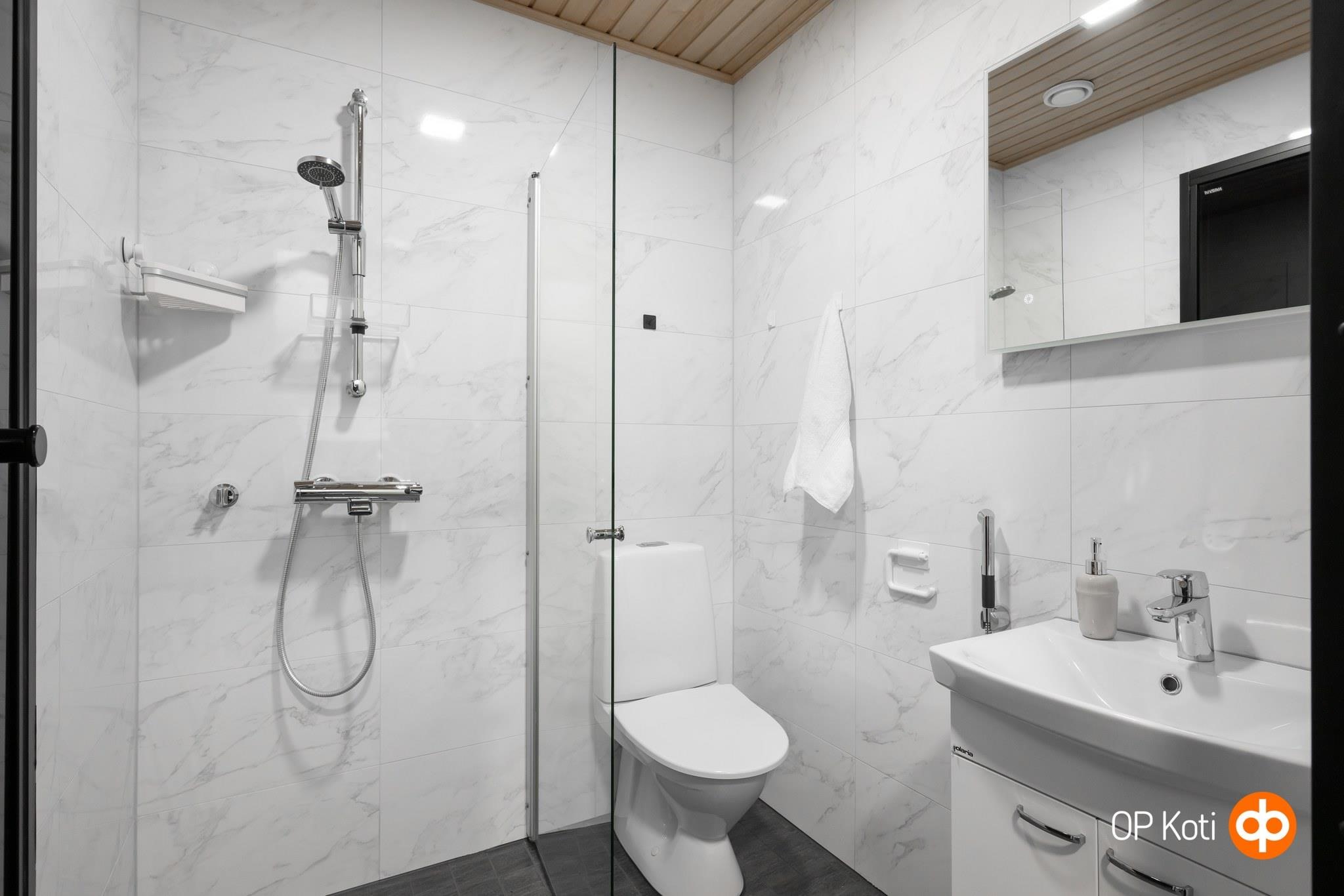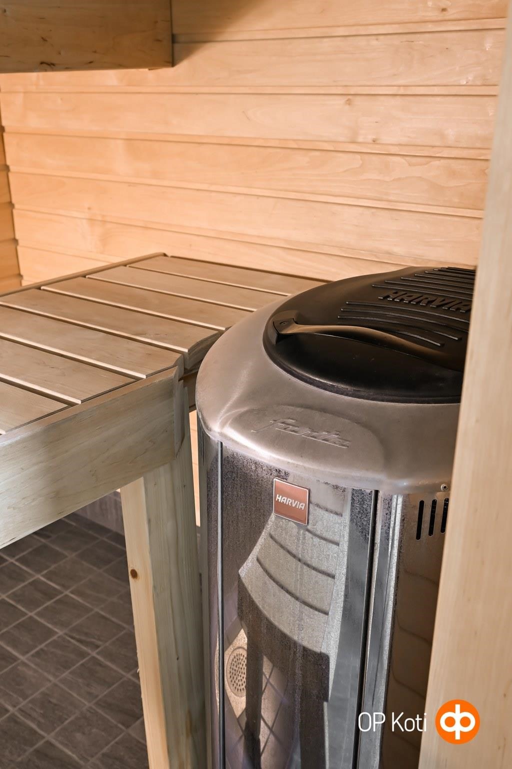 - Sauna, sähkökiuas Harvia Forte (hetivalmis), kylpyhuone, erillinen wc, suihku, suihkuseinä kääntyvä, peilit valopeili kph ja wc, allaskaappi, pesukoneliitäntä khh, lattialämmitys, kiinteät valaisimet wc,khh,kph,s. kodinhoitohuoneeseen jää oskarinoksa ja pyyhekoukut seinään