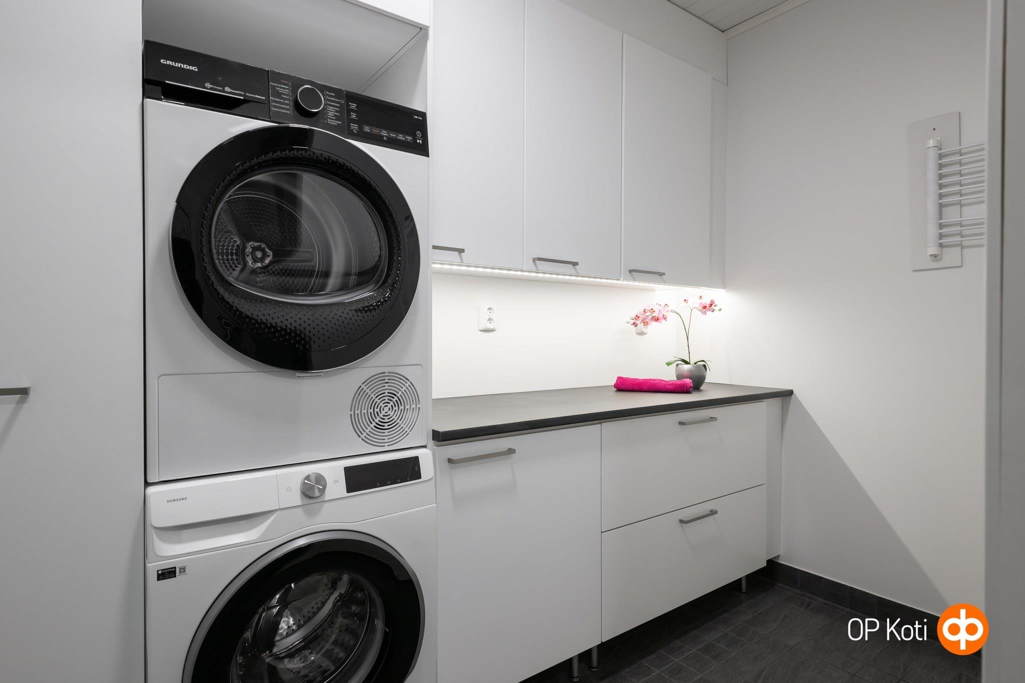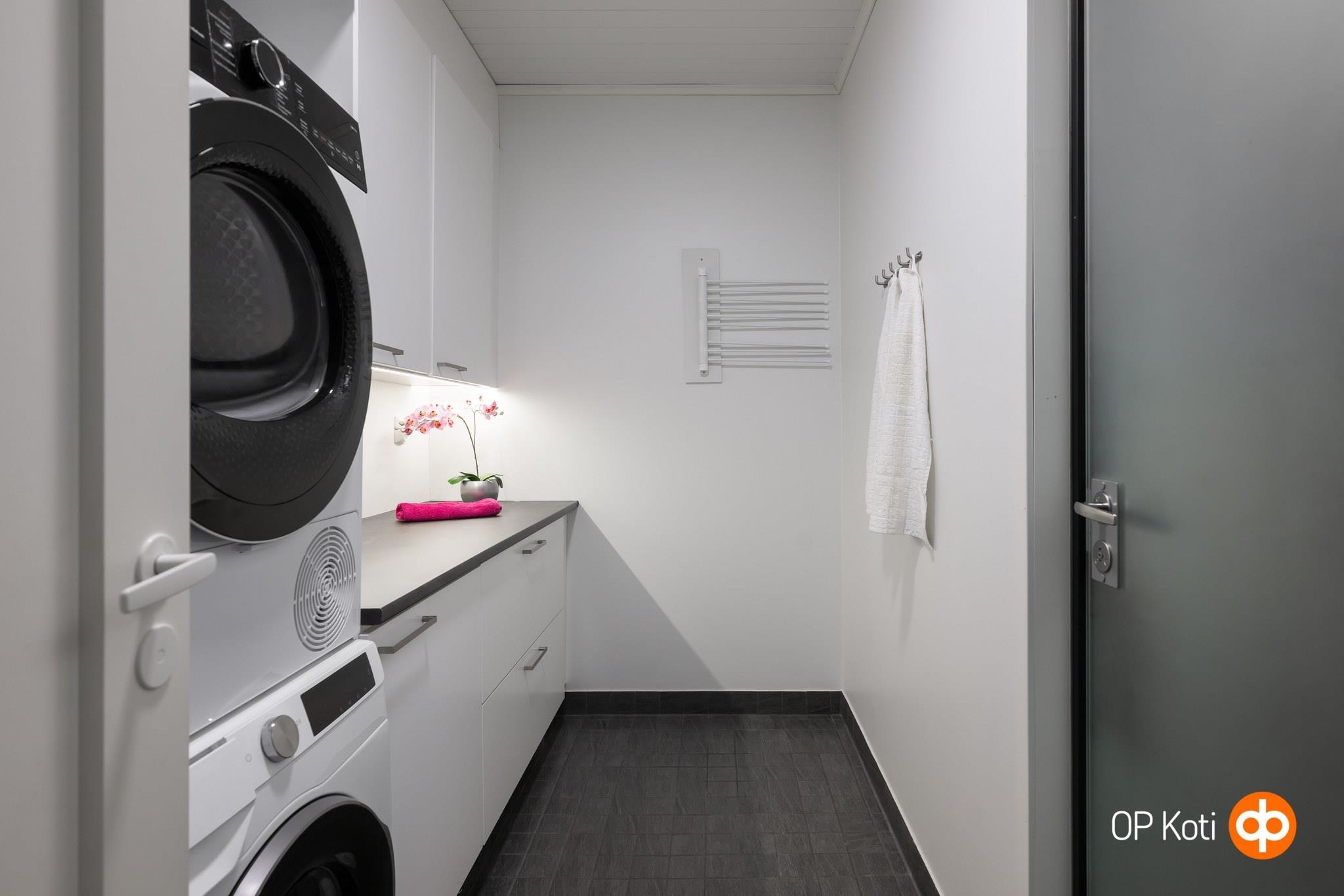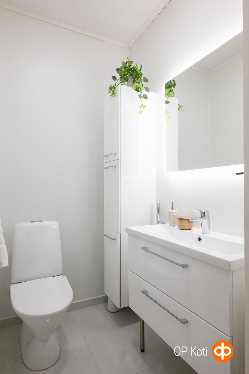 - Sauna, sähkökiuas Harvia Forte (hetivalmis), kylpyhuone, erillinen wc, suihku, suihkuseinä kääntyvä, peilit valopeili kph ja wc, allaskaappi, pesukoneliitäntä khh, lattialämmitys, kiinteät valaisimet wc,khh,kph,s. kodinhoitohuoneeseen jää oskarinoksa ja pyyhekoukut seinään