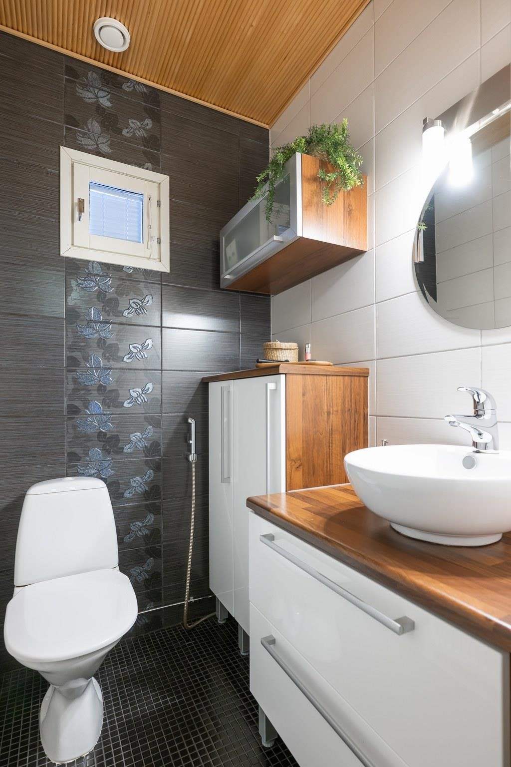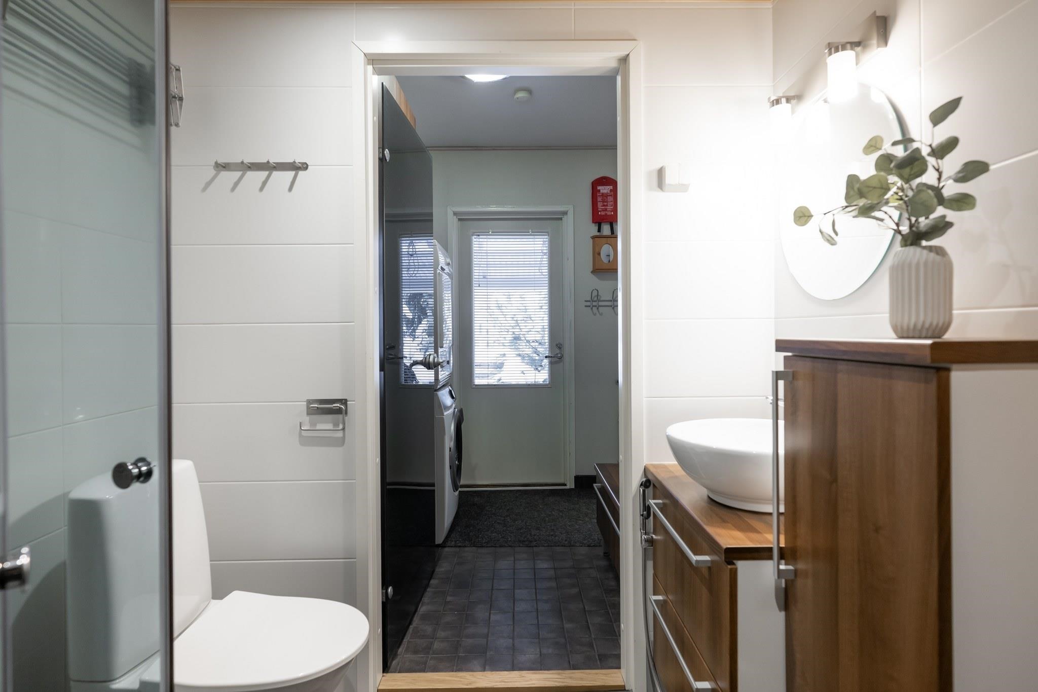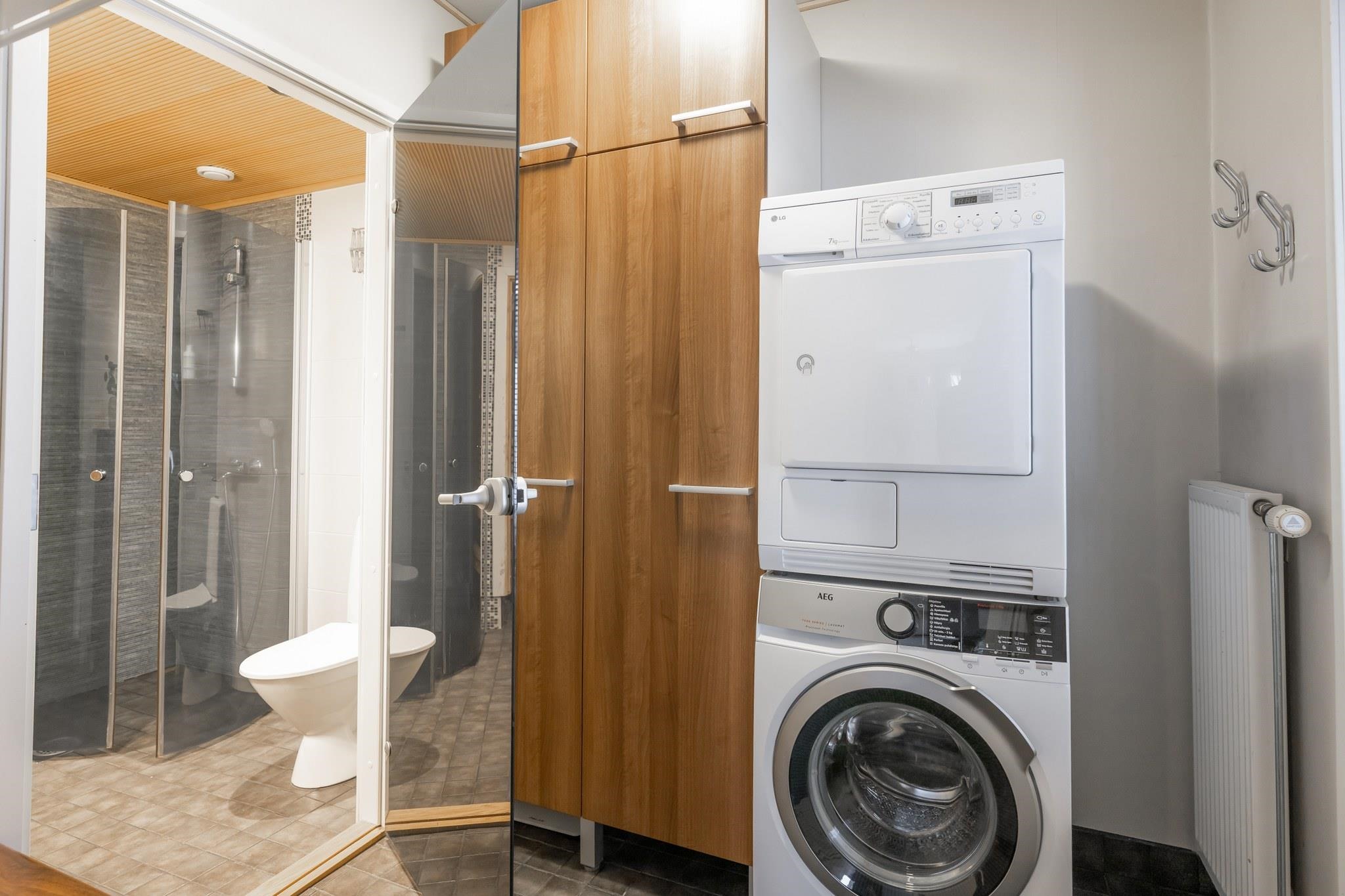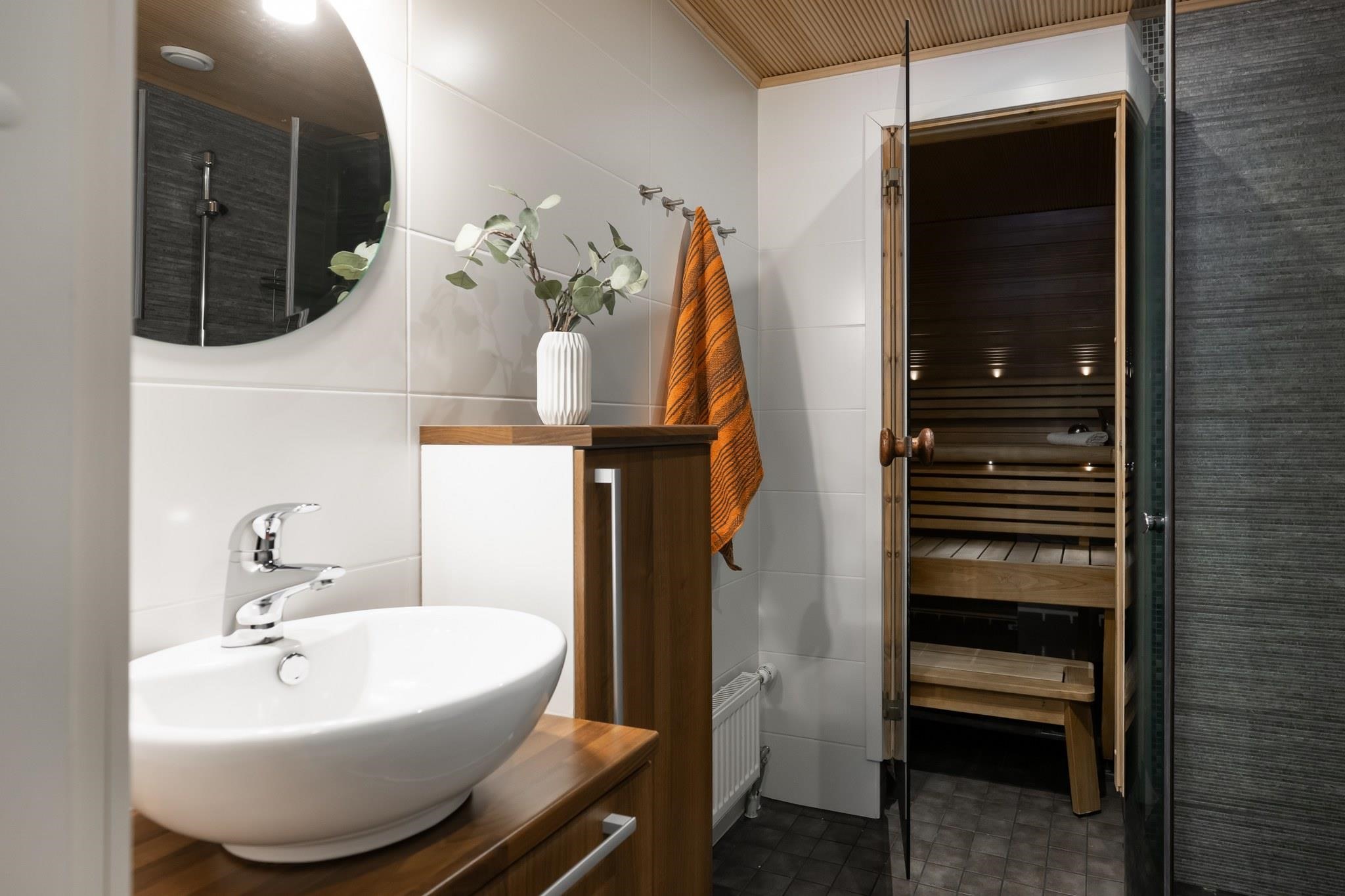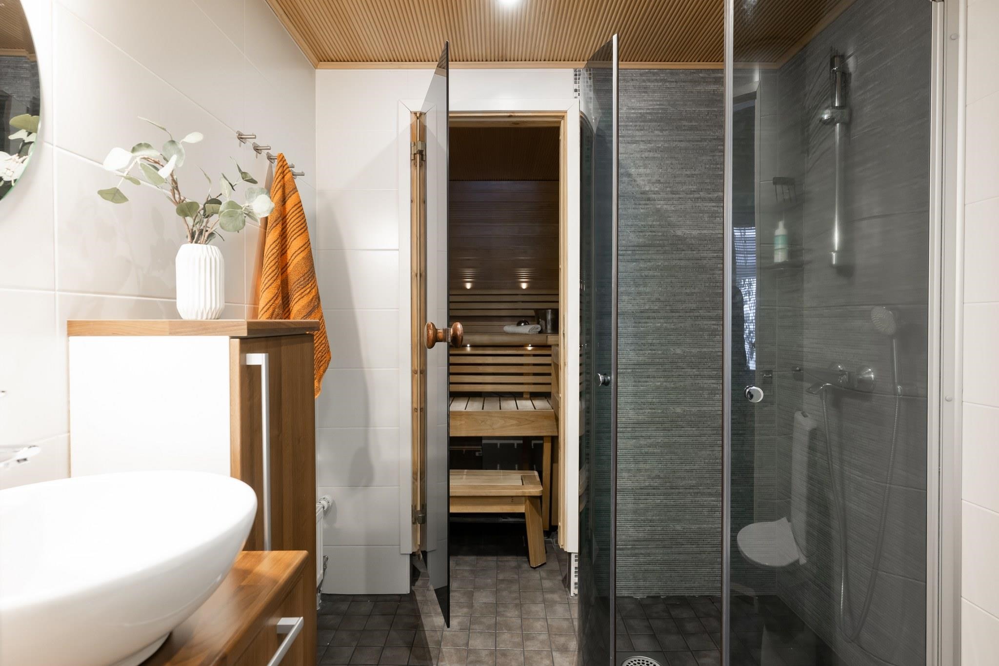 - Sauna, sähkökiuas, kylpyhuone, erillinen wc, suihku, suihkuseinä (kaarevat / taitettavat suihkuseinät), kaapit (pystykaappi erill.wc), allaskaappi (erill.wc), pesukoneliitäntä (kodinhoitohuone).