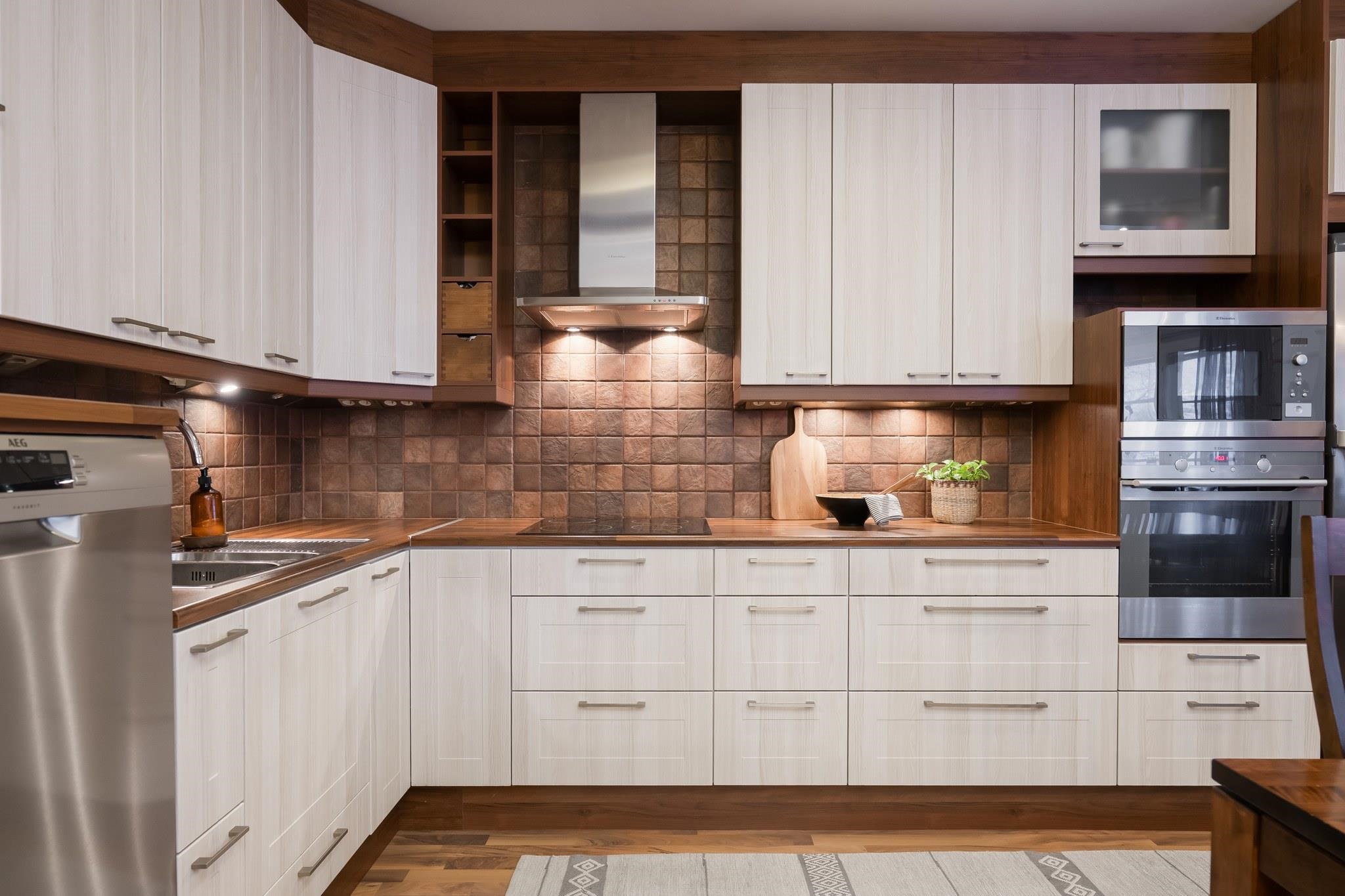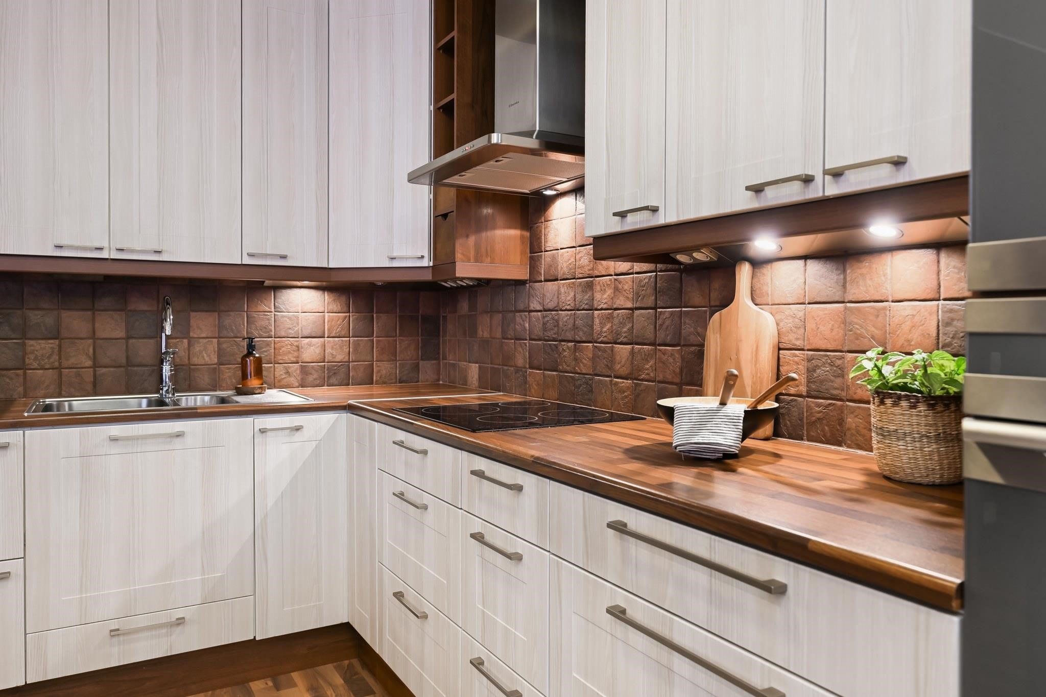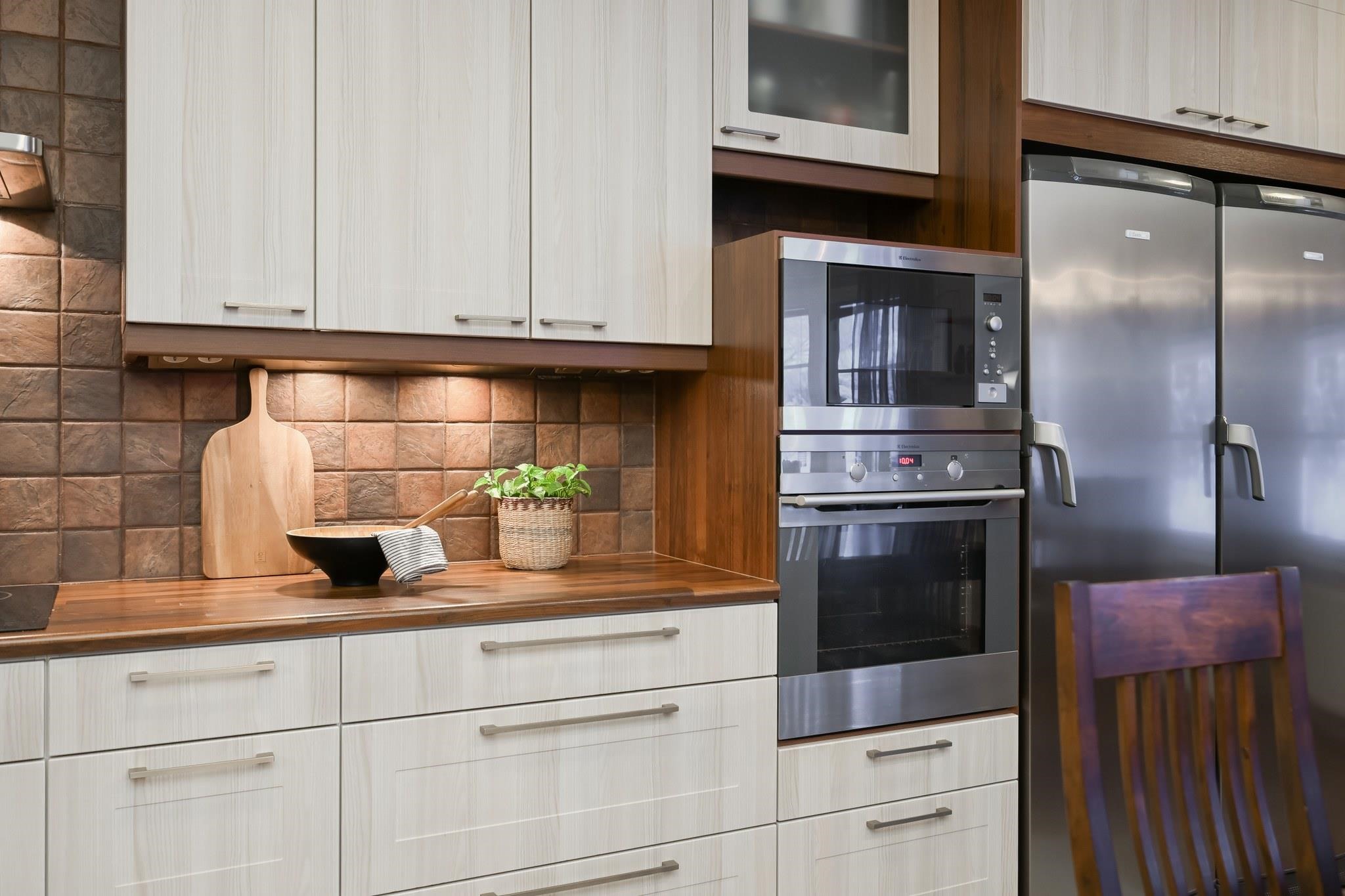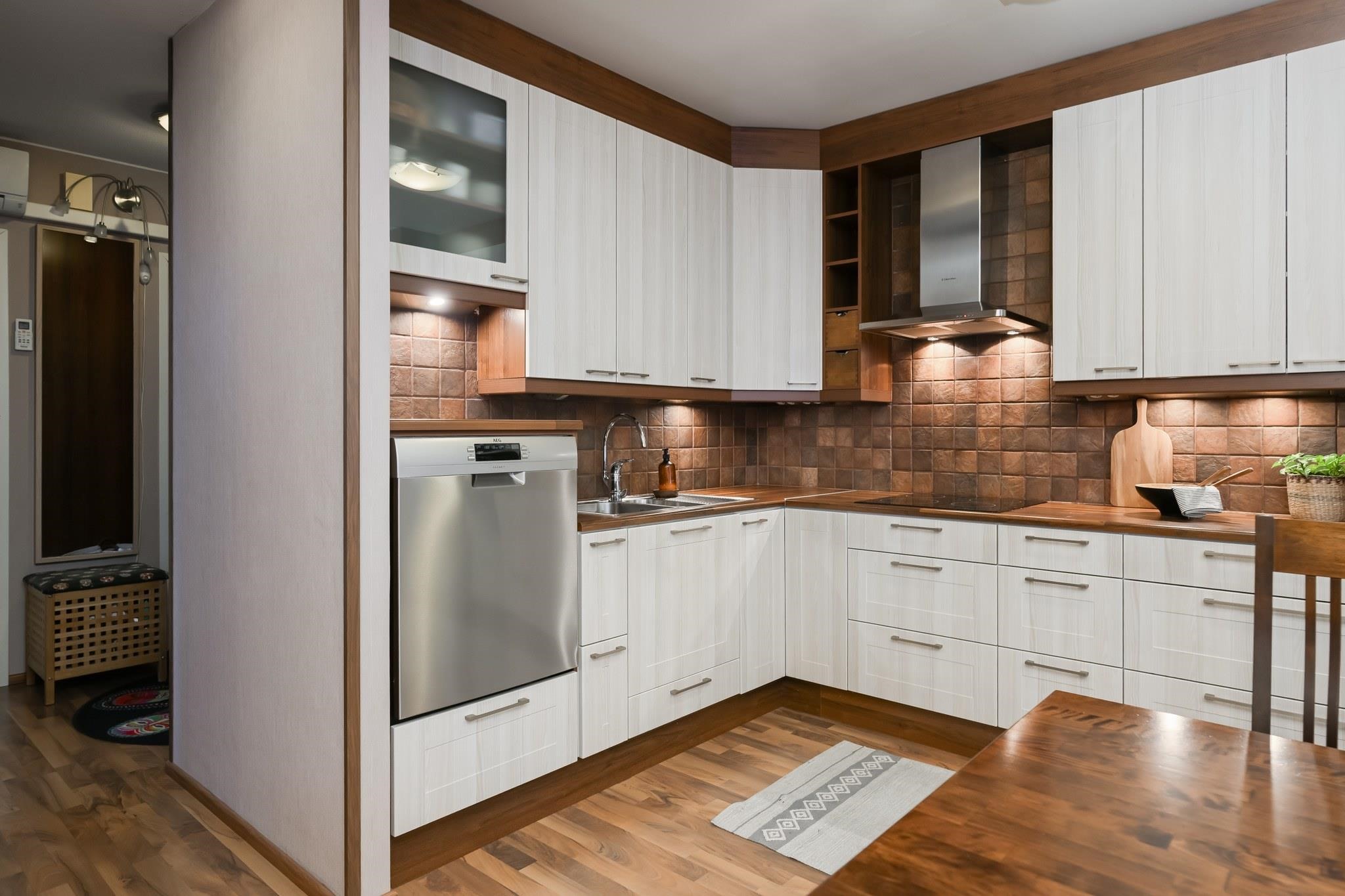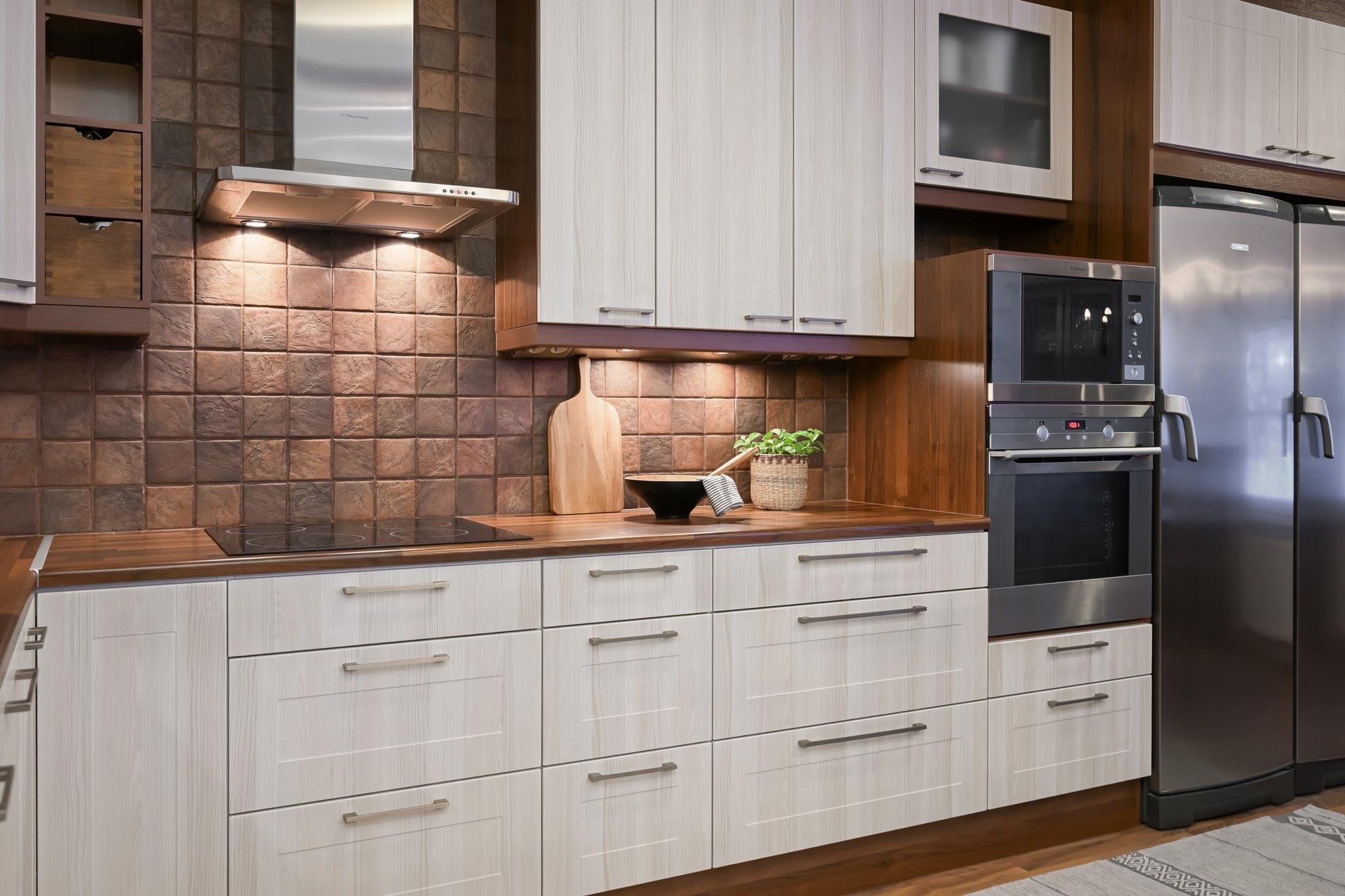 - Jääkaappi, pakastekaappi, erillisuuni, keraaminen liesi, liesituuletin, mikroaaltouuni, astianpesukone, kaapistot.