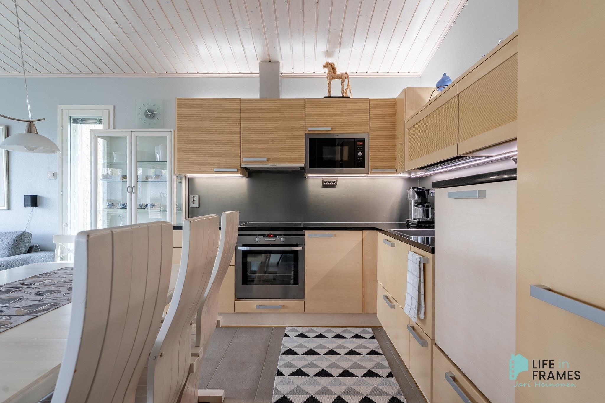 - Jääkaappipakastin, erillisuuni, keraaminen liesi, liesituuletin, mikroaaltouuni, astianpesukone, kaapistot, kiinteät valaisimet, pöytätasojen materiaali Kivi.