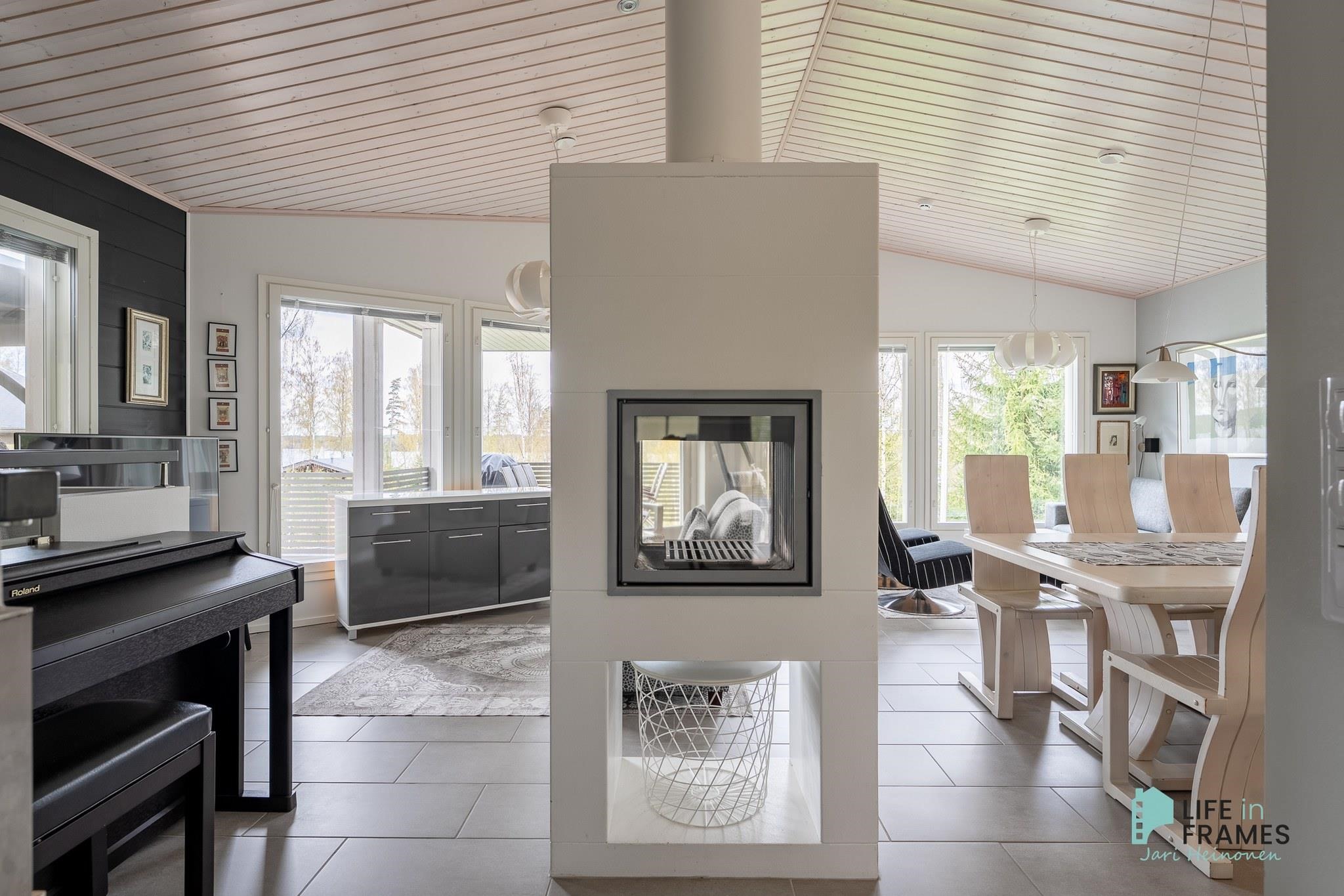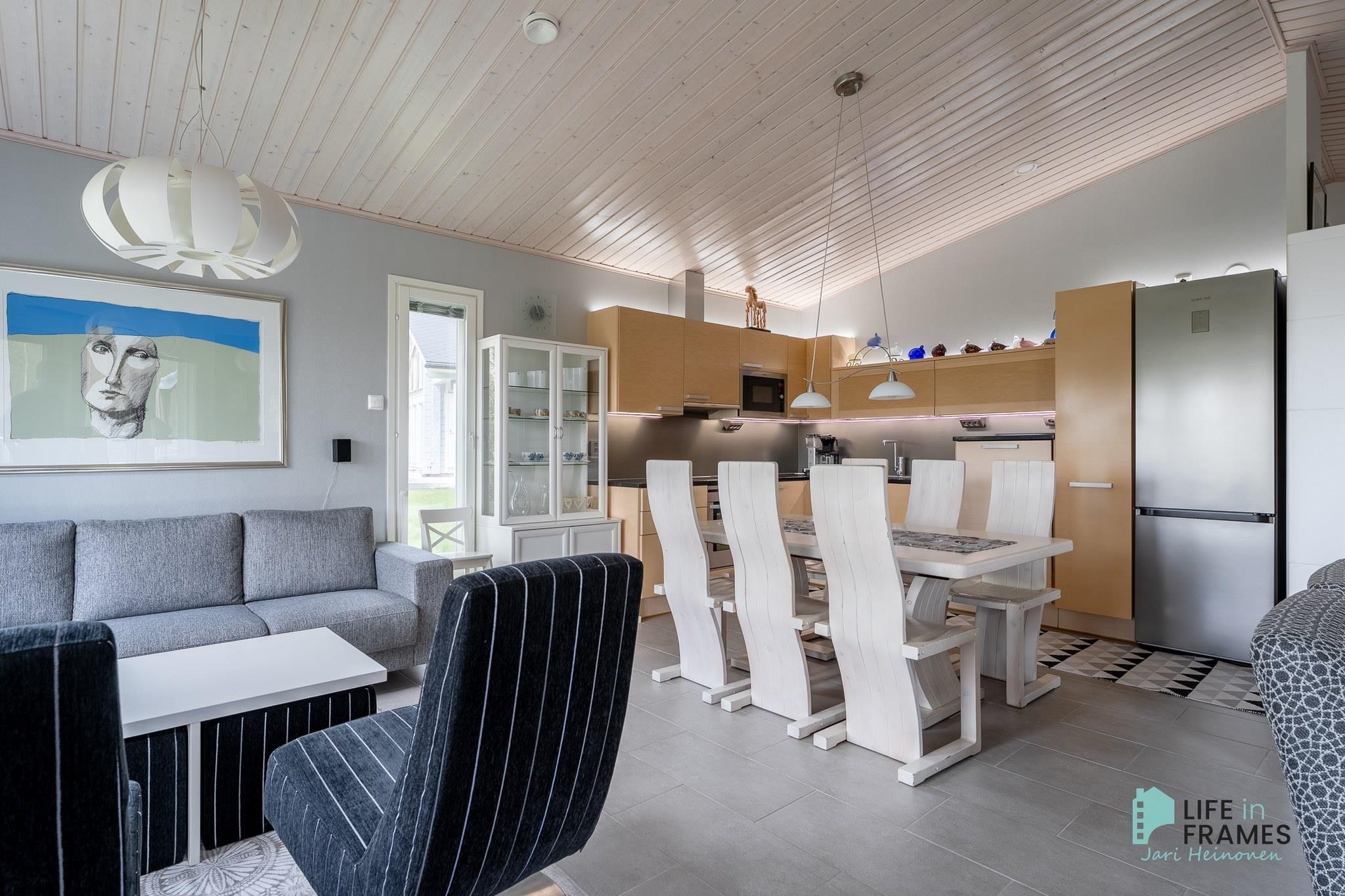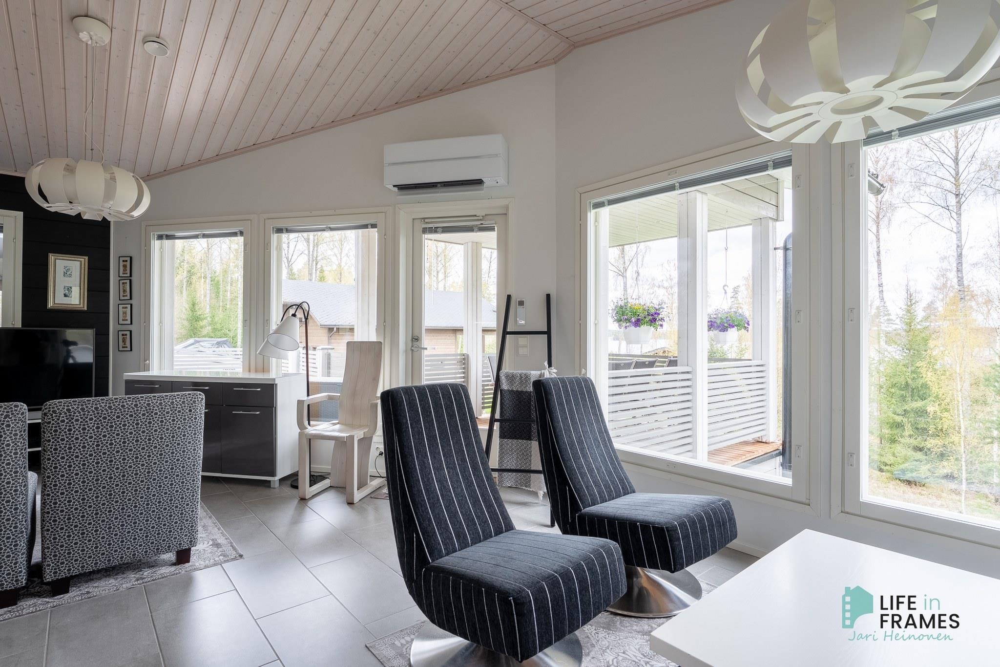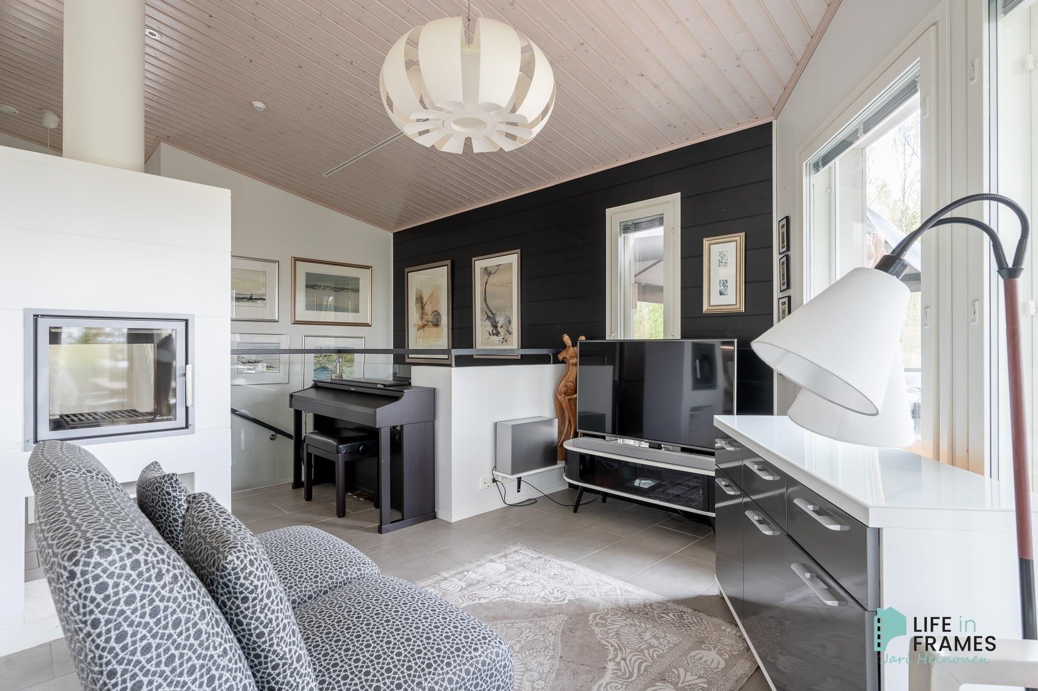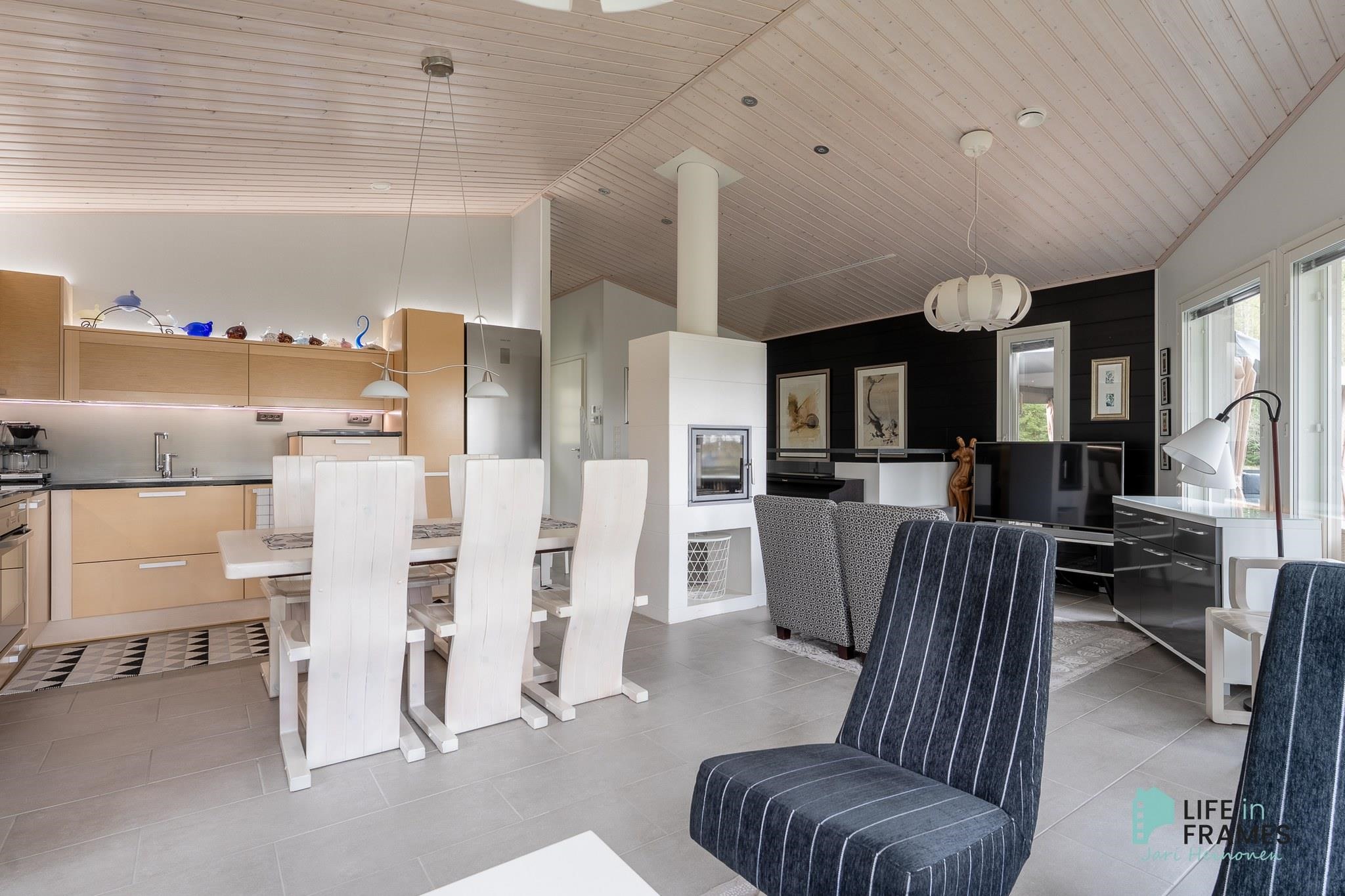 Ympärivuotiseen käyttöön sopiva huvila on hyvin tehty ja pidetty. Yläkerrasta löytyy moderni avoin keittiö-olohuone, josta on kulku katetulle parvekkeelle. Makuuhuoneista toinen sijaitsee yläkerrassa ja toinen alakerrassa. Alakerrassa on myös vaatehuone, joka on toiminut kolmantena makuuhuoneena. Lisäksi alakerrasta löytyy kodinhoitohuone, kylpyhuone, sauna ja kulku ulos isolle terassialueelle. Molemmissa kerroksissa on lattialämmitys ja erilliset wc:t. Yläkerran kiertoilmatakka tuo lämpöä ja tunnelmaa ja ilmalämpöpumppu takaa kesälläkin miellyttävän lämpötilan.