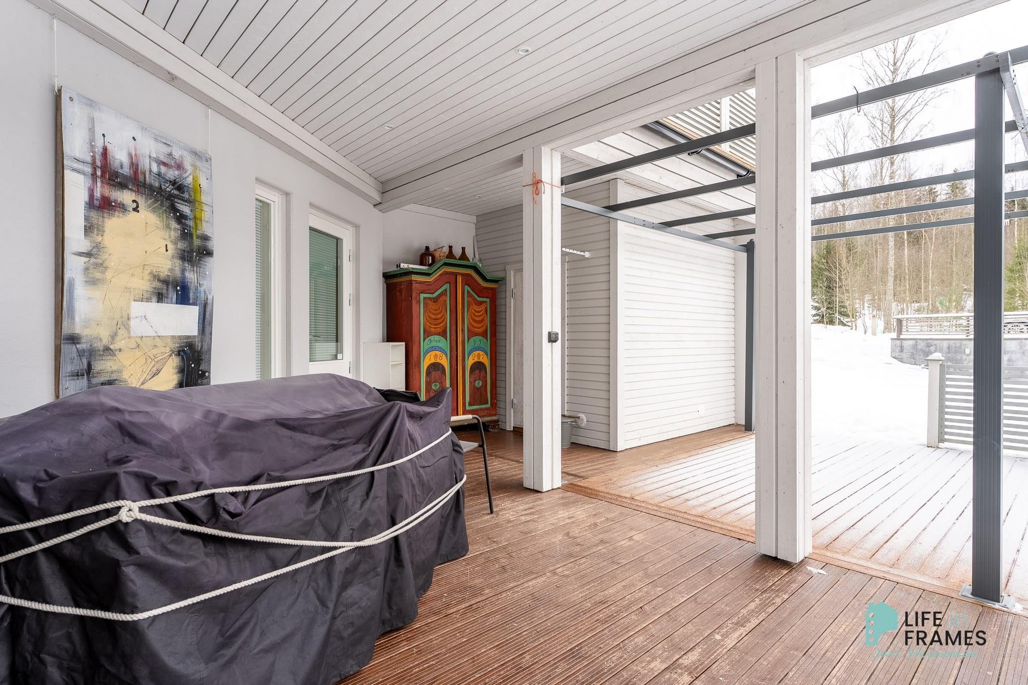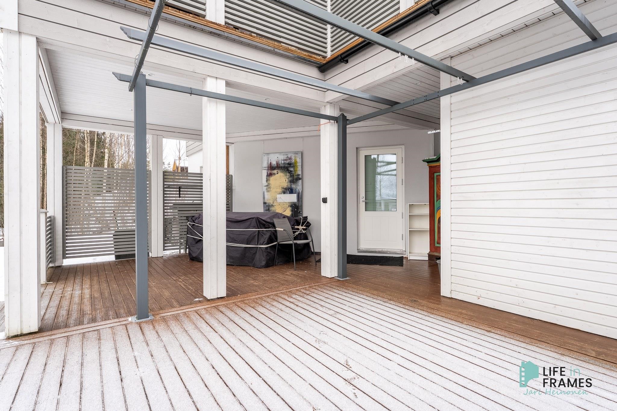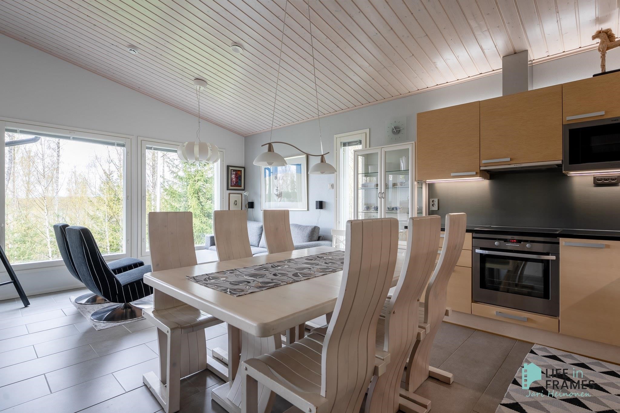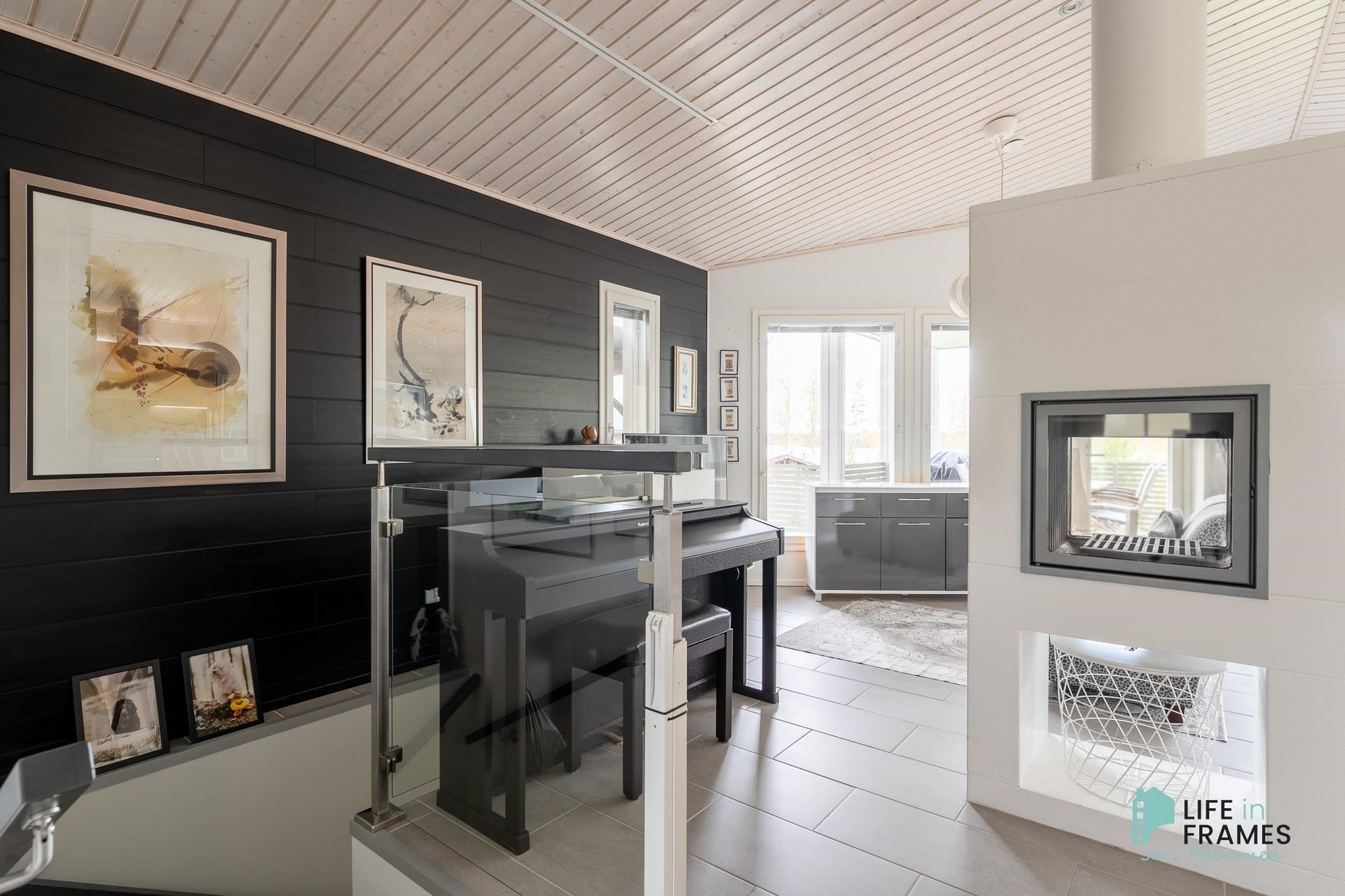 Ympärivuotiseen käyttöön sopiva huvila on hyvin tehty ja pidetty. Yläkerrasta löytyy moderni avoin keittiö-olohuone, josta on kulku katetulle parvekkeelle. Makuuhuoneista toinen sijaitsee yläkerrassa ja toinen alakerrassa. Alakerrassa on myös vaatehuone, joka on toiminut kolmantena makuuhuoneena. Lisäksi alakerrasta löytyy kodinhoitohuone, kylpyhuone, sauna ja kulku ulos isolle terassialueelle. Molemmissa kerroksissa on lattialämmitys ja erilliset wc:t. Yläkerran kiertoilmatakka tuo lämpöä ja tunnelmaa ja ilmalämpöpumppu takaa kesälläkin miellyttävän lämpötilan.