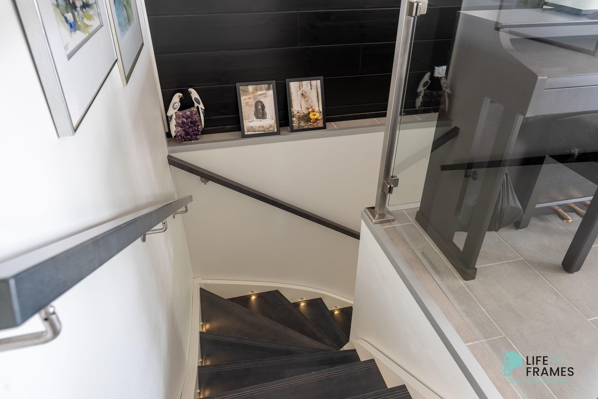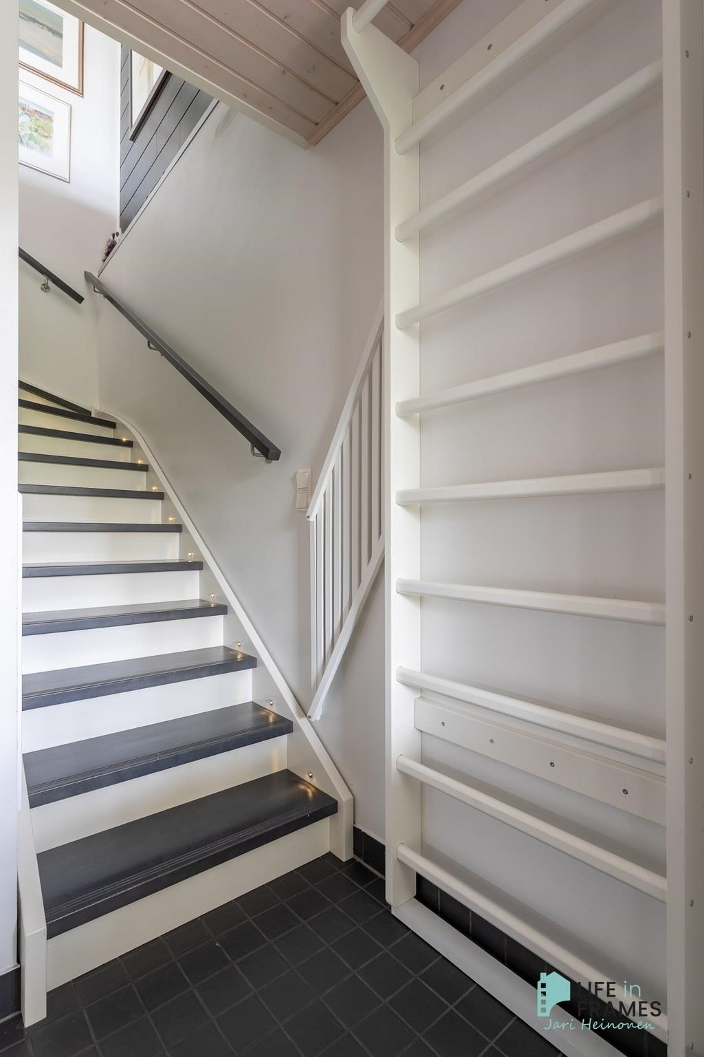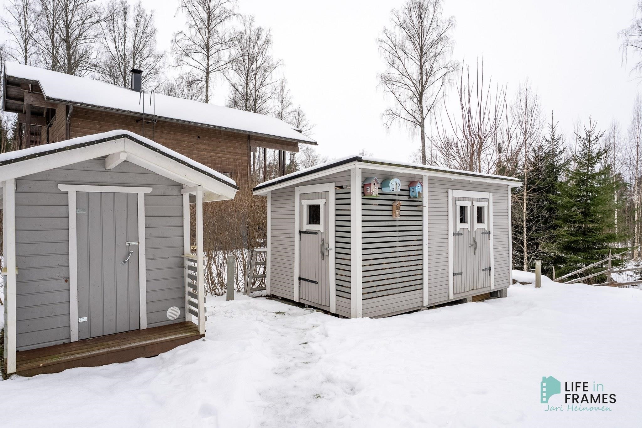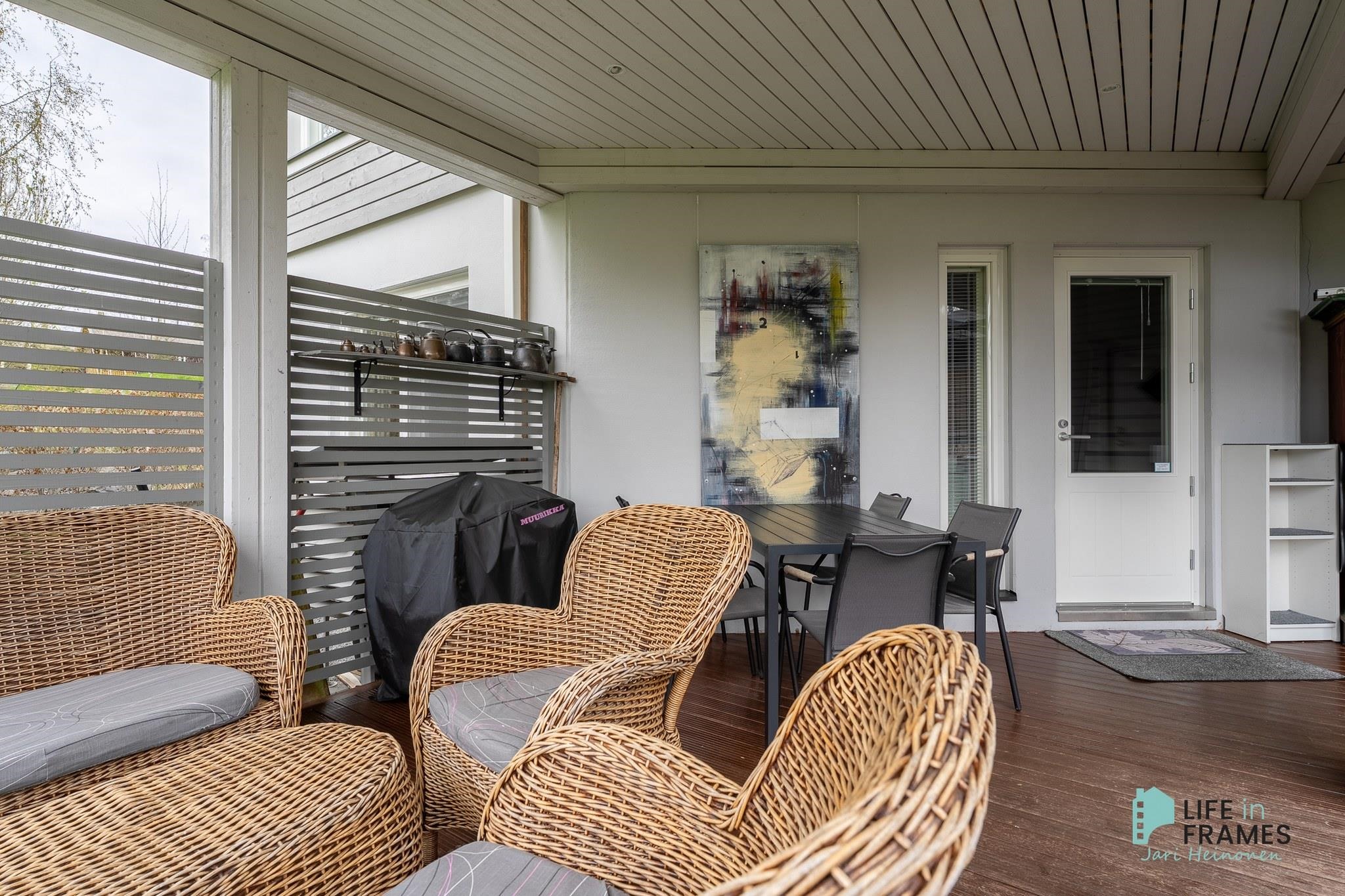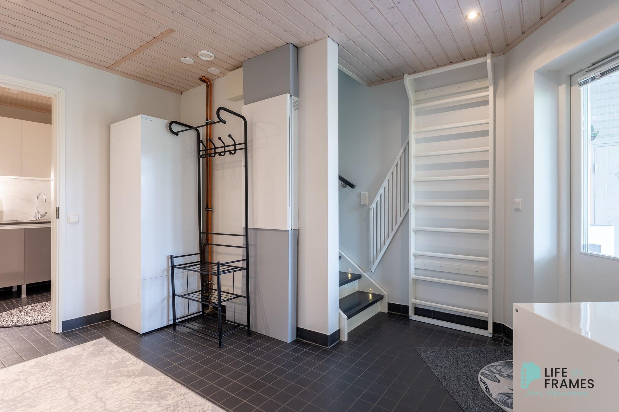 Ympärivuotiseen käyttöön sopiva huvila on hyvin tehty ja pidetty. Yläkerrasta löytyy moderni avoin keittiö-olohuone, josta on kulku katetulle parvekkeelle. Makuuhuoneista toinen sijaitsee yläkerrassa ja toinen alakerrassa. Alakerrassa on myös vaatehuone, joka on toiminut kolmantena makuuhuoneena. Lisäksi alakerrasta löytyy kodinhoitohuone, kylpyhuone, sauna ja kulku ulos isolle terassialueelle. Molemmissa kerroksissa on lattialämmitys ja erilliset wc:t. Yläkerran kiertoilmatakka tuo lämpöä ja tunnelmaa ja ilmalämpöpumppu takaa kesälläkin miellyttävän lämpötilan.