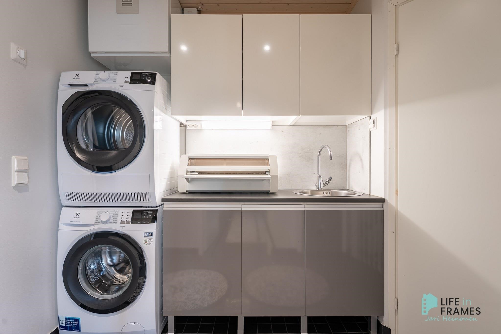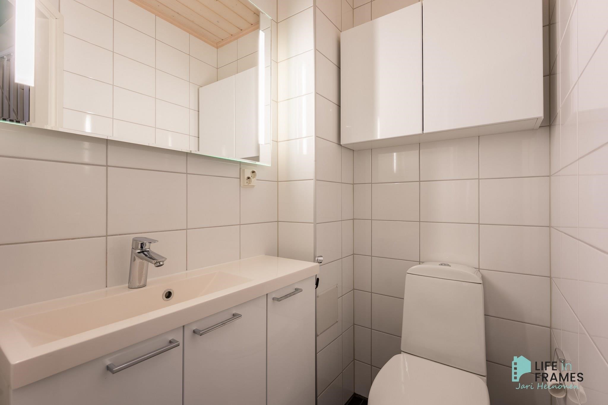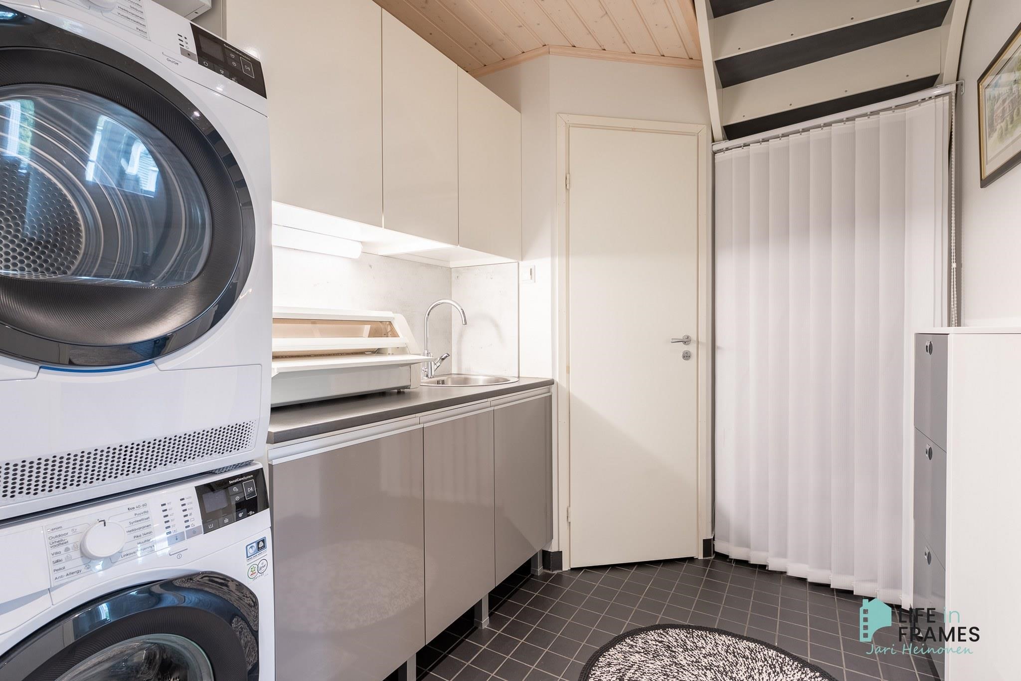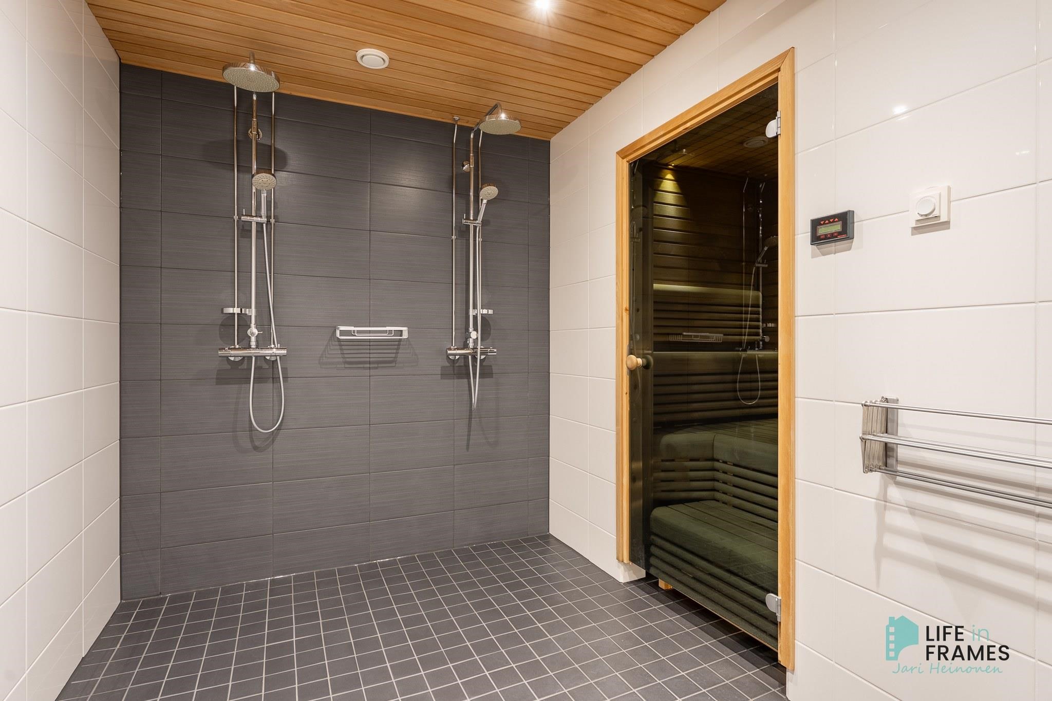 - Sauna, sähkökiuas, kylpyhuone, erillinen wc x 2, suihku x 2, peilit, pesukoneliitäntä, lattialämmitys, kiinteät valaisimet. Varaus kuivauskaapille