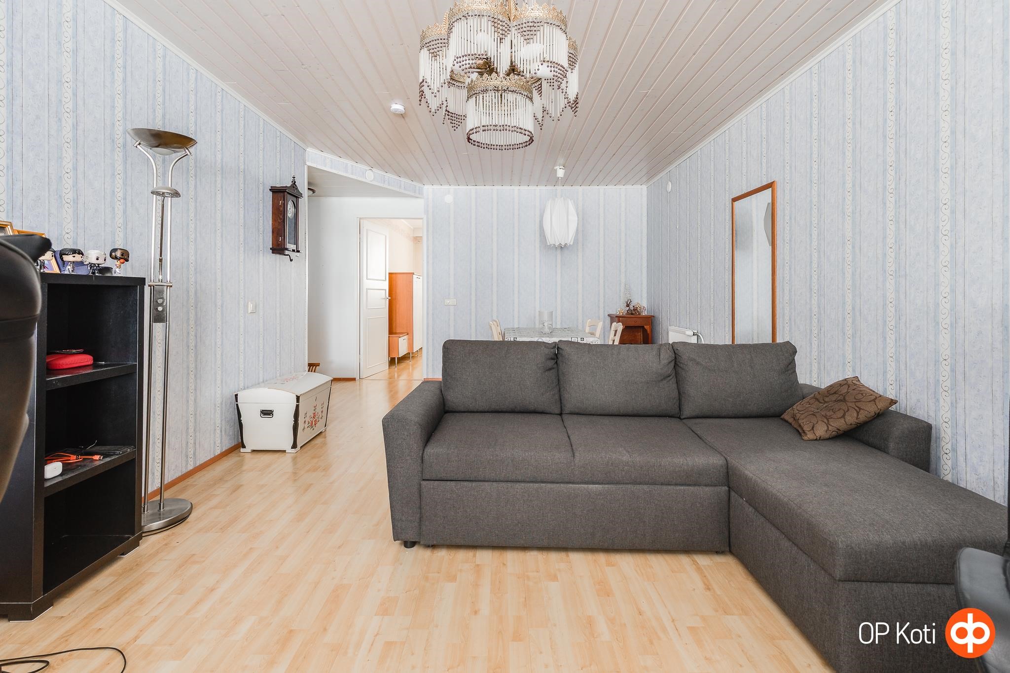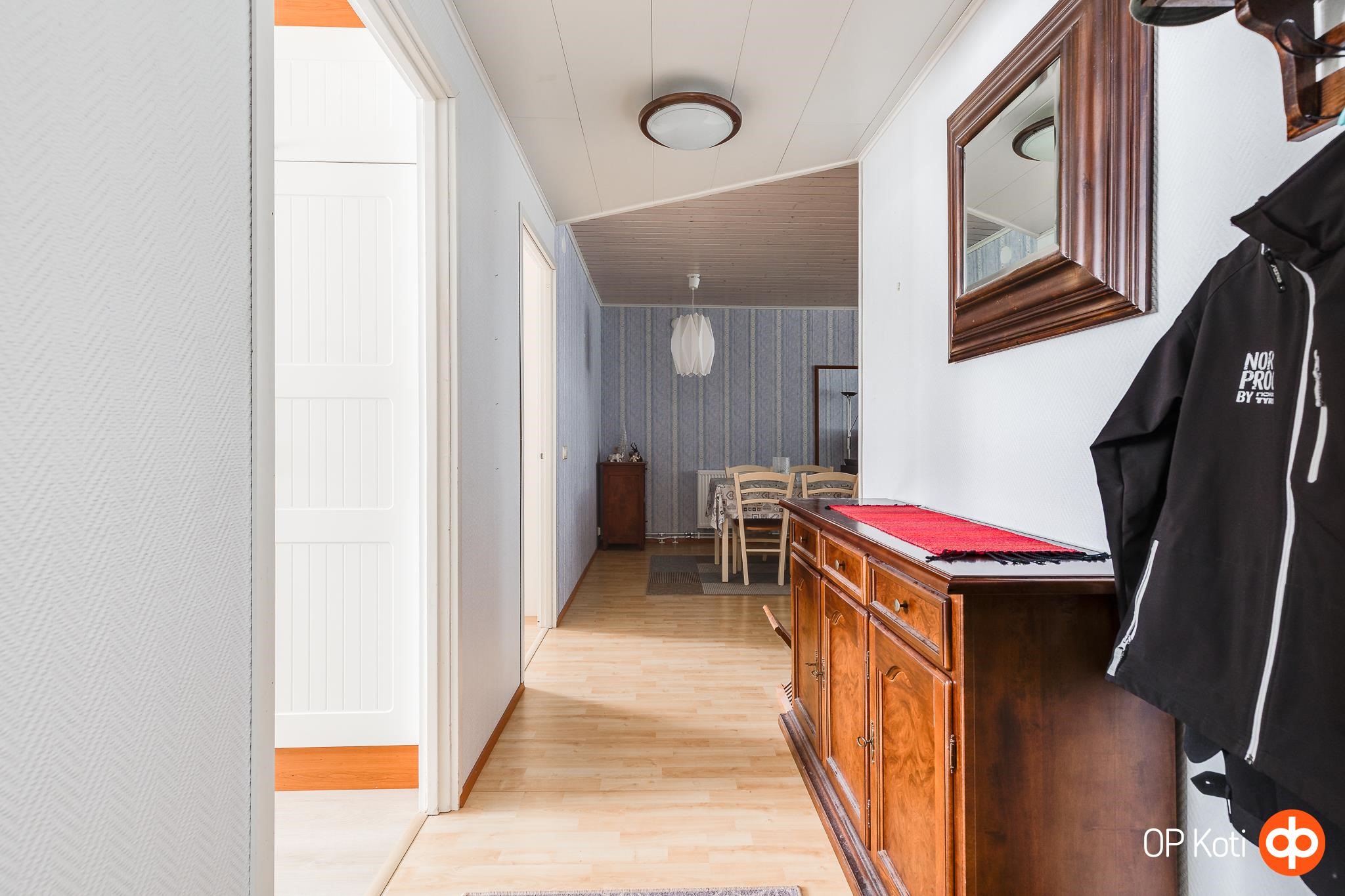 Keittiö: laminaattilattia, maalatut seinät. Olohuone: laminaattilattia, tapetoidut seinät. Makuuhuone 1: laminaattilattia, tapetoidut seinät. Sauna: laattalattia, puupanelointi. Kylpyhuone: laattalattia, kaakeliseinät. Eteinen: laminaattilattia, tapetoidut seinät.