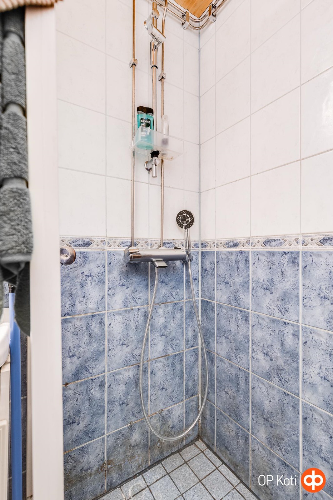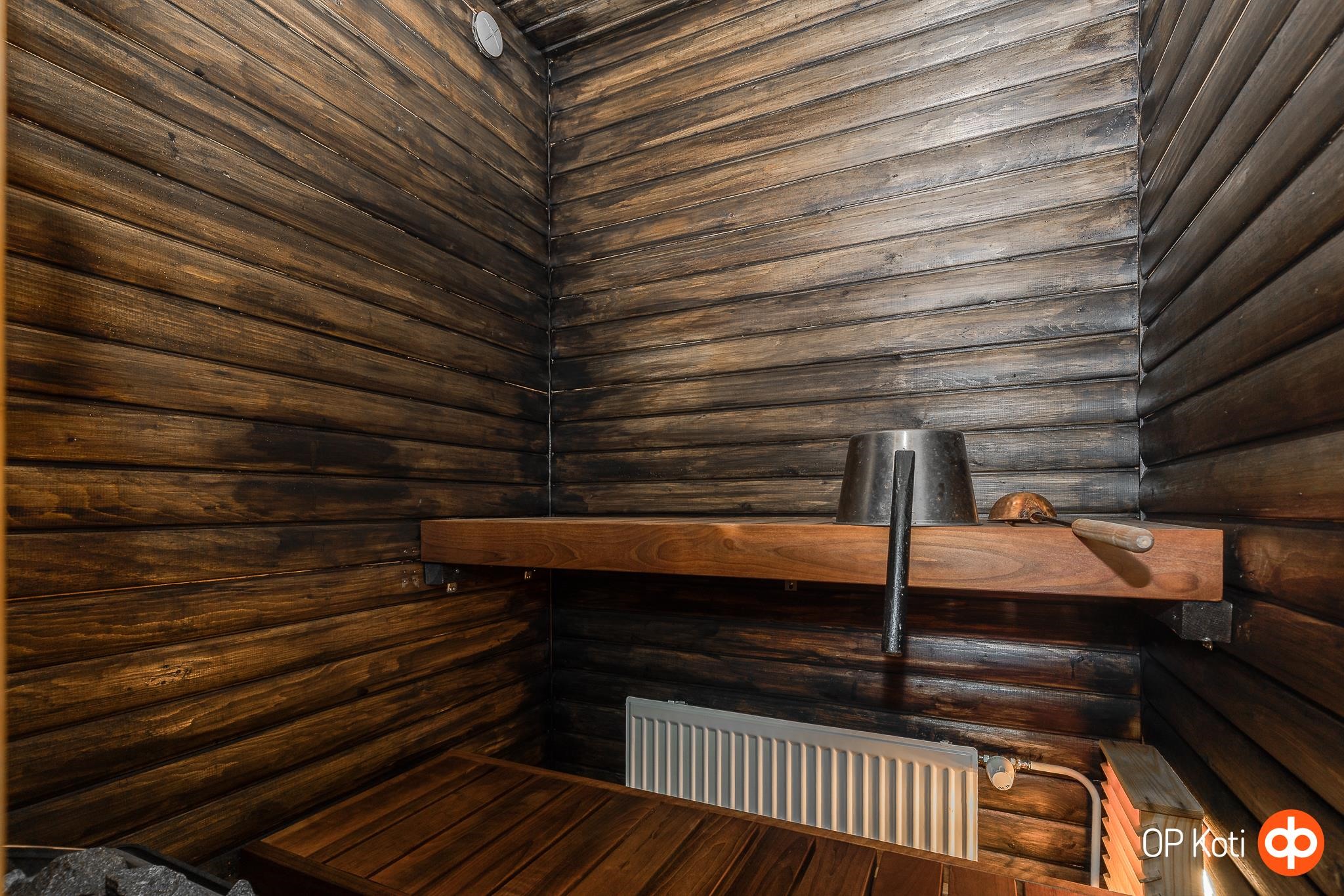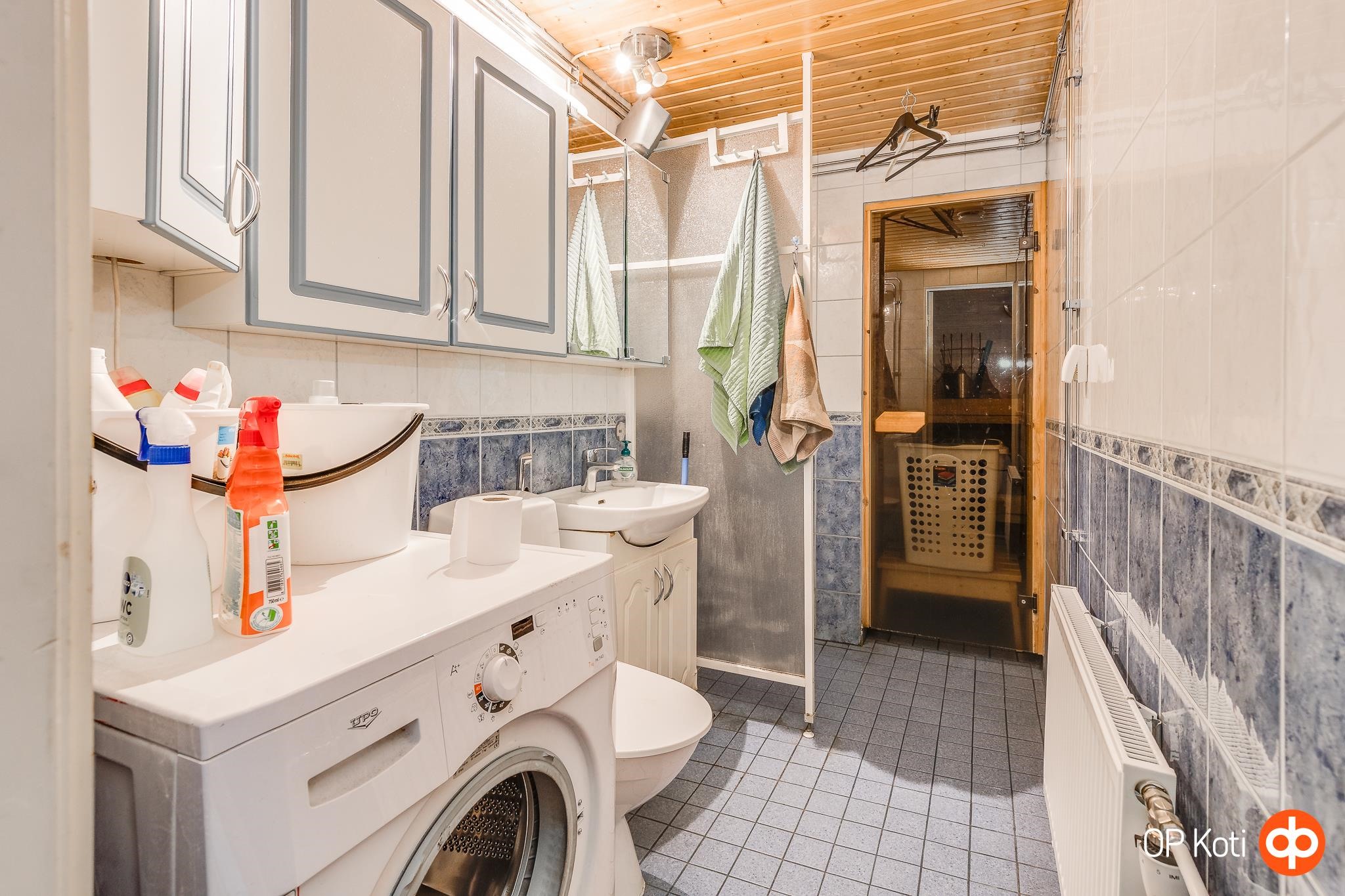 - Sauna, sähkökiuas, kylpyhuone, suihku, suihkuseinä, peilikaappi, kaapit, allaskaappi, pesukoneliitäntä, kiinteät valaisimet. Sauna remontoitu 07/2025, kiuas ja lauteet uusittu, seinät ja katto käsitelty. Kylpyhuone remontoitu 2000-luvun alussa