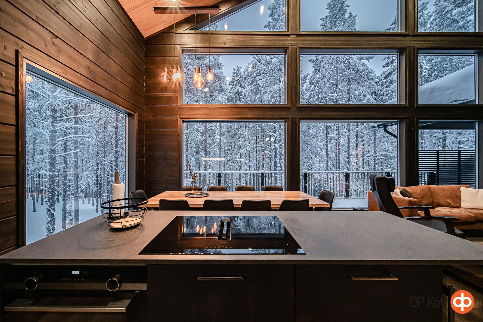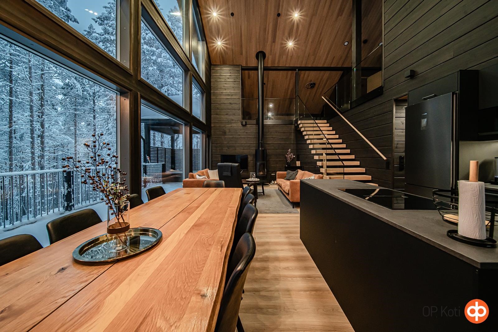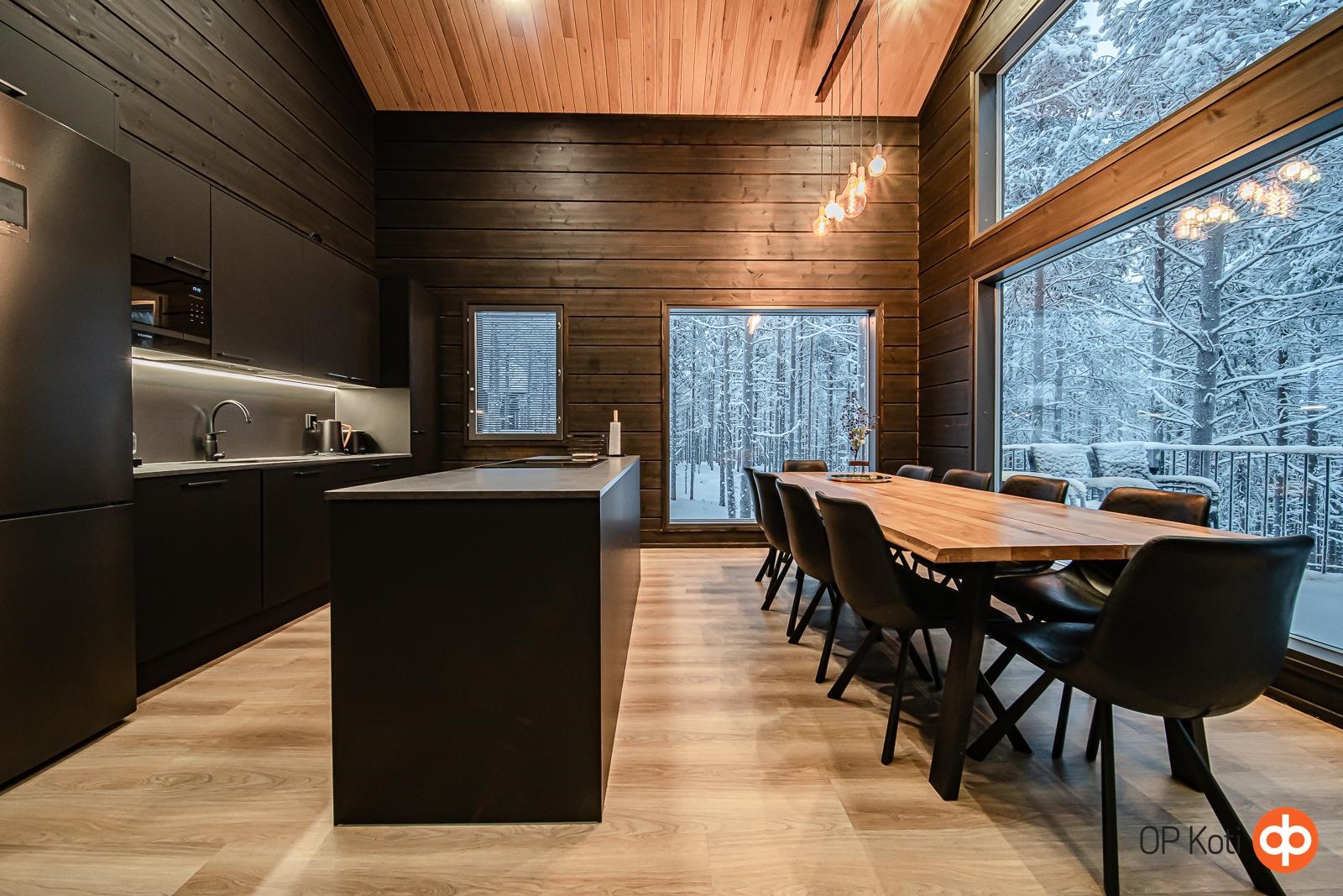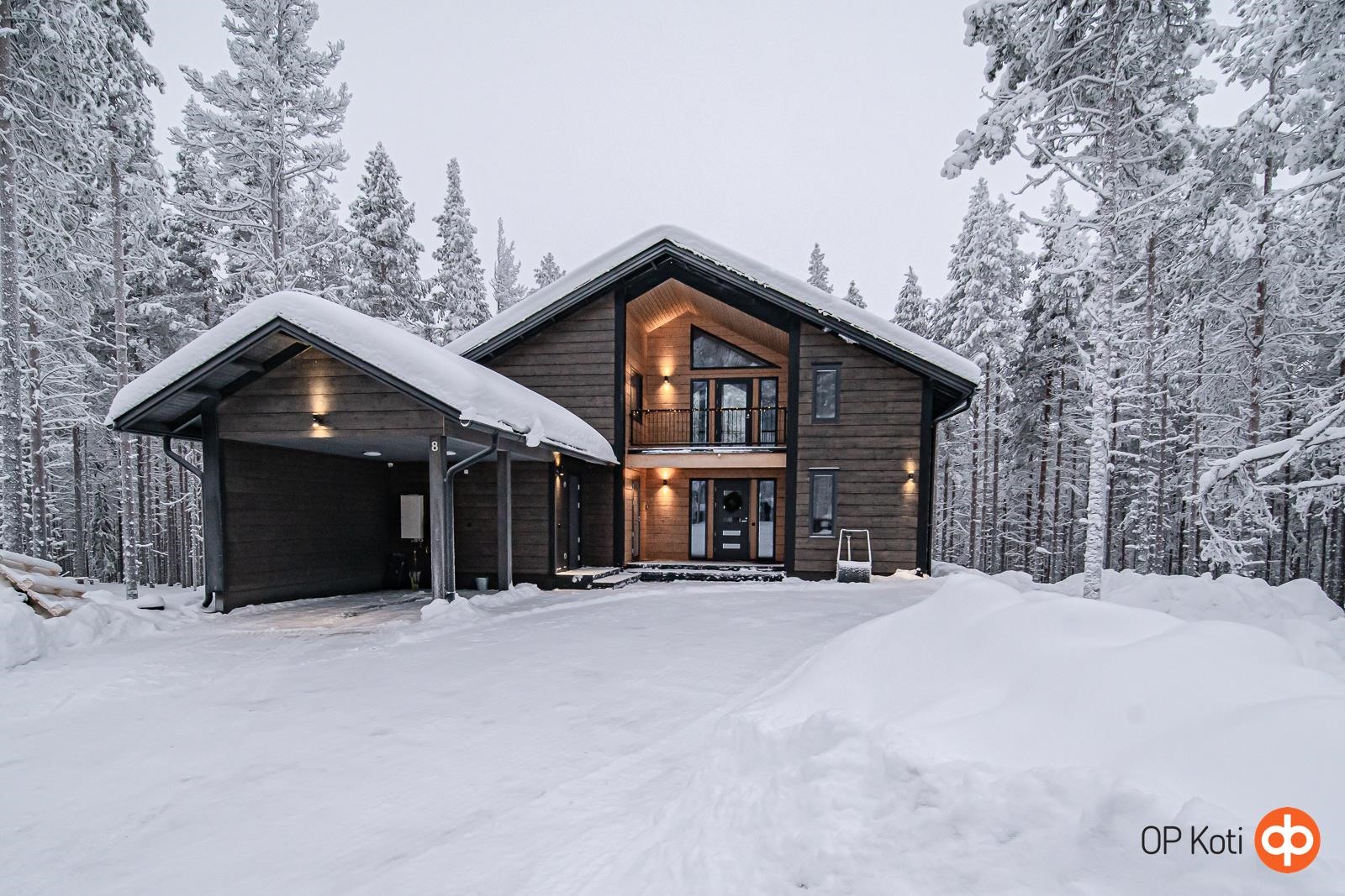 Lapin lumoavassa maisemassa sijaitseva vapaa-ajan koti tarjoaa täydelliset puitteet rentouttavalle lomailulle. Neljä makuuhuonetta jakautuvat kahteen kerrokseen, ja molemmissa kerroksissa on myös erillinen wc. Alakerran ilmava olohuone tulisijoineen avautuu suurien ikkunoiden kautta rauhoittavaan metsämaisemaan. Avara oleskelutila jatkuu saarekkeella varustettuun keittiöön ja ruokailutilaan, jossa ruokapöydän äärellä on tilaa suuremmallekin porukalle. Hyvin varusteltu kodinhoitohuone kaapistoineen ja kahden kuivauskaapin kera tekee vaatehuollosta vaivatonta. Kylpyhuoneessa on kaksi suihkua, ja saunassa on tilaa useammalle löylyttelijälle. Alakerran terassilla odottaa poreallas, jossa voi nauttia kylpemisestä tähtitaivaan alla.