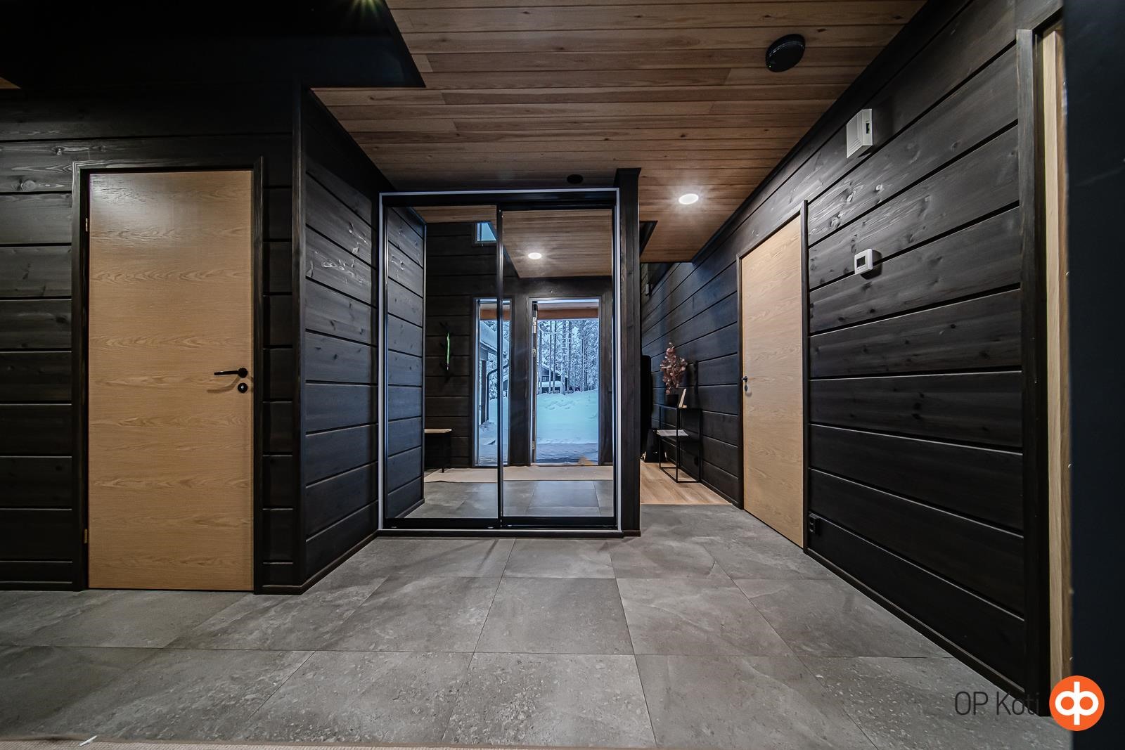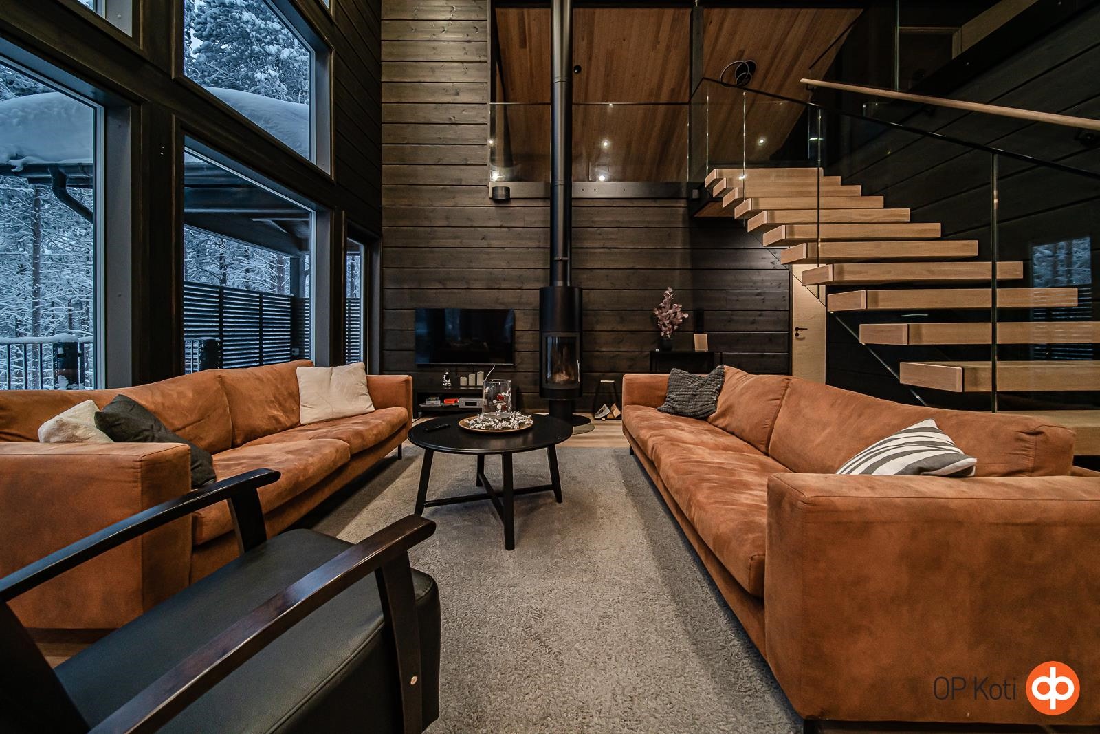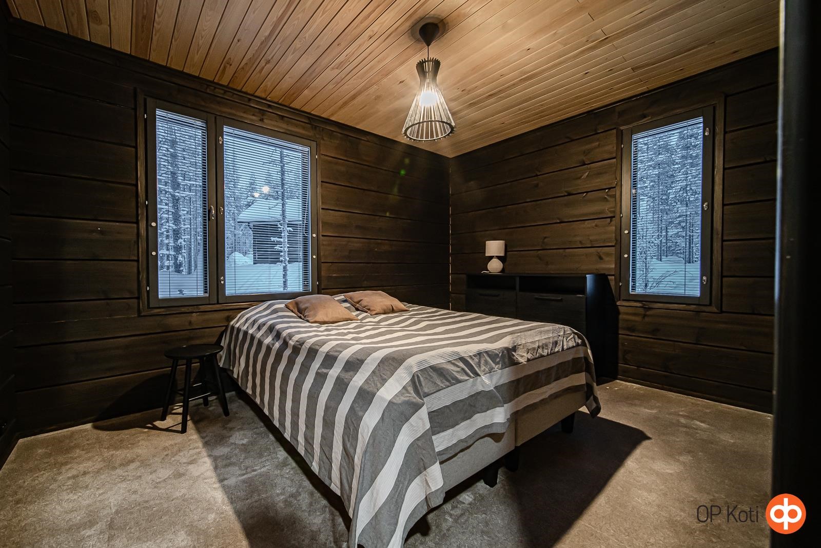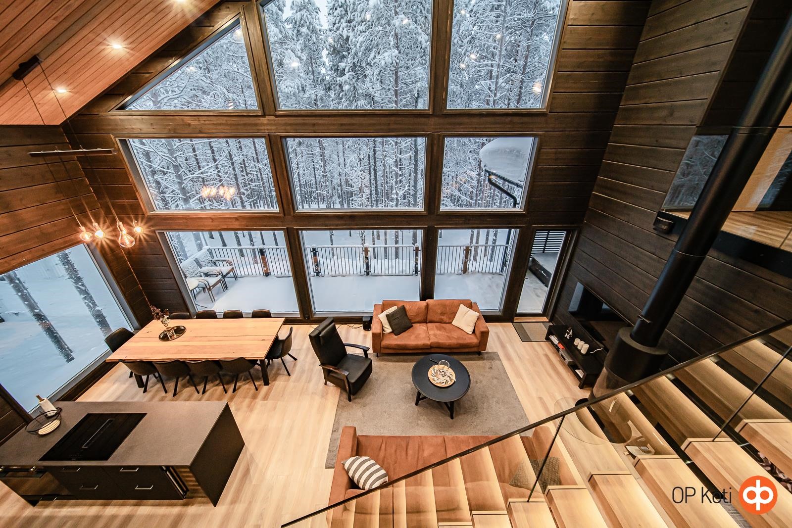 Lapin lumoavassa maisemassa sijaitseva vapaa-ajan koti tarjoaa täydelliset puitteet rentouttavalle lomailulle. Neljä makuuhuonetta jakautuvat kahteen kerrokseen, ja molemmissa kerroksissa on myös erillinen wc. Alakerran ilmava olohuone tulisijoineen avautuu suurien ikkunoiden kautta rauhoittavaan metsämaisemaan. Avara oleskelutila jatkuu saarekkeella varustettuun keittiöön ja ruokailutilaan, jossa ruokapöydän äärellä on tilaa suuremmallekin porukalle. Hyvin varusteltu kodinhoitohuone kaapistoineen ja kahden kuivauskaapin kera tekee vaatehuollosta vaivatonta. Kylpyhuoneessa on kaksi suihkua, ja saunassa on tilaa useammalle löylyttelijälle. Alakerran terassilla odottaa poreallas, jossa voi nauttia kylpemisestä tähtitaivaan alla.