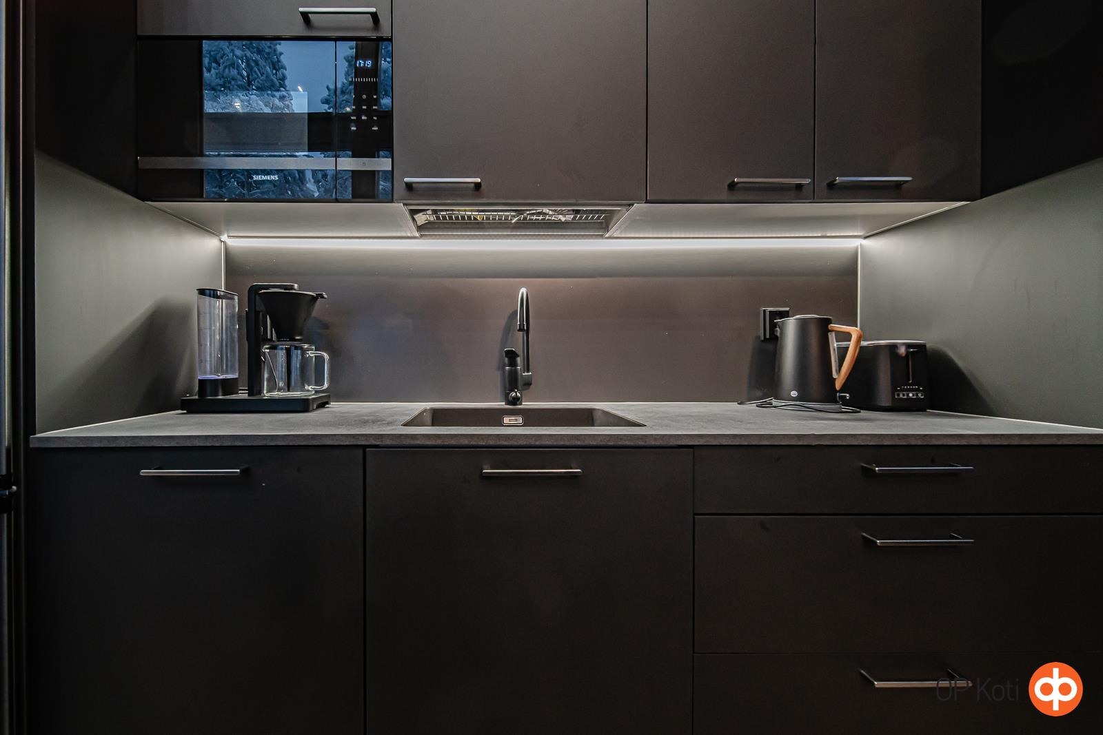 - Jääviileäkaappi, erillisuuni, liesitaso (induktio), mikroaaltouuni, astianpesukone, kaapistot, irralliset saarekkeet, kiinteät valaisimet, pöytätasojen materiaali laminaatti.
