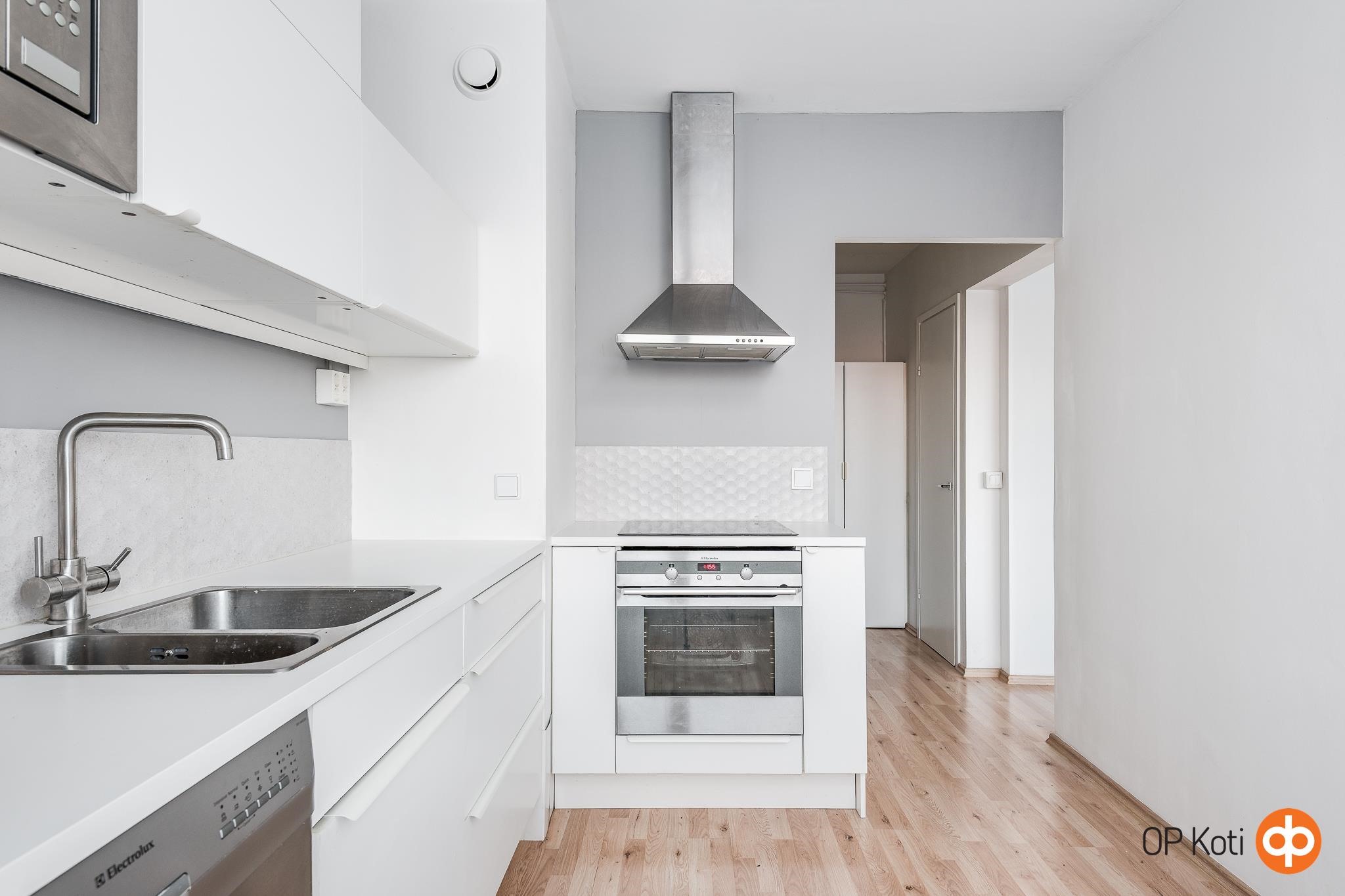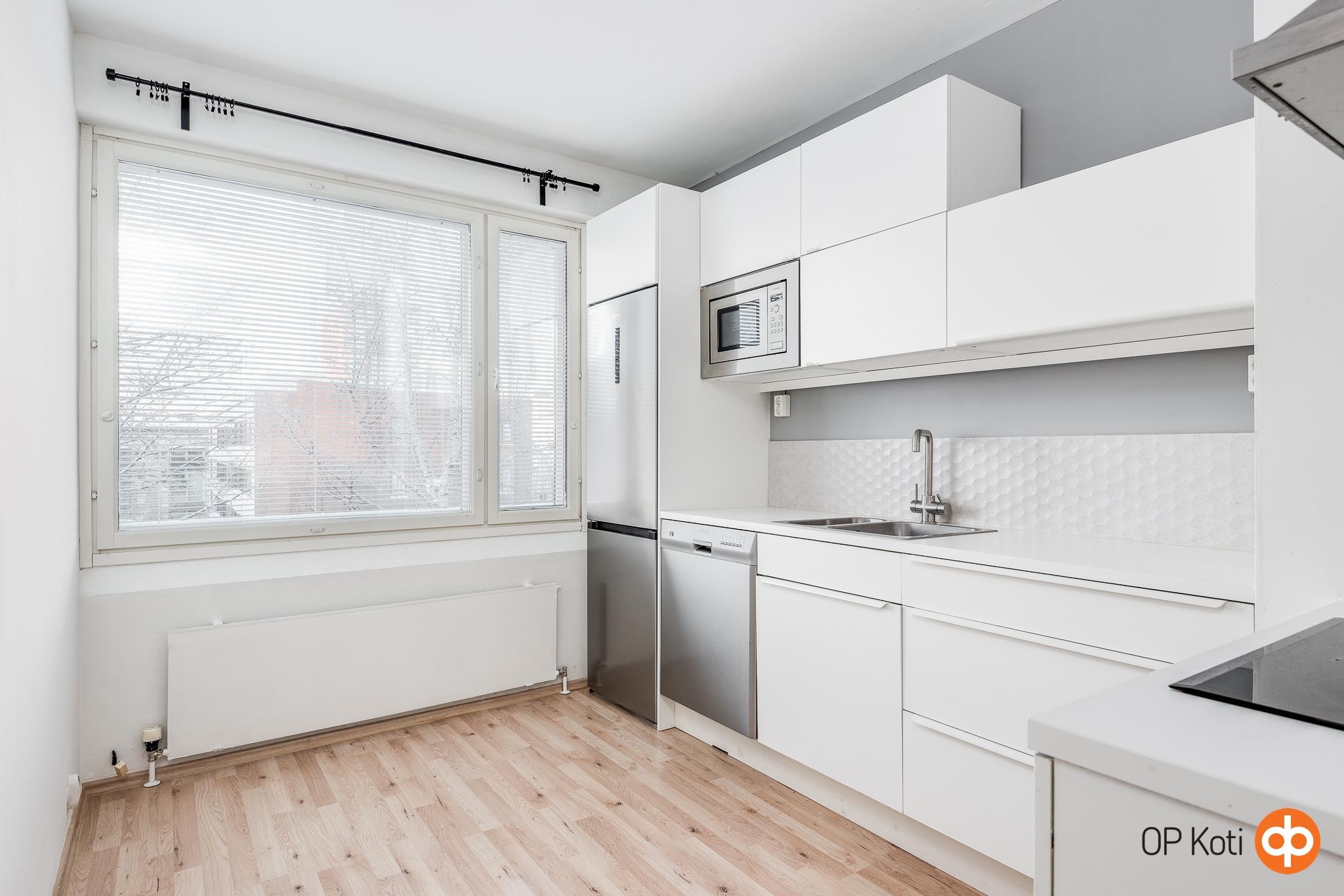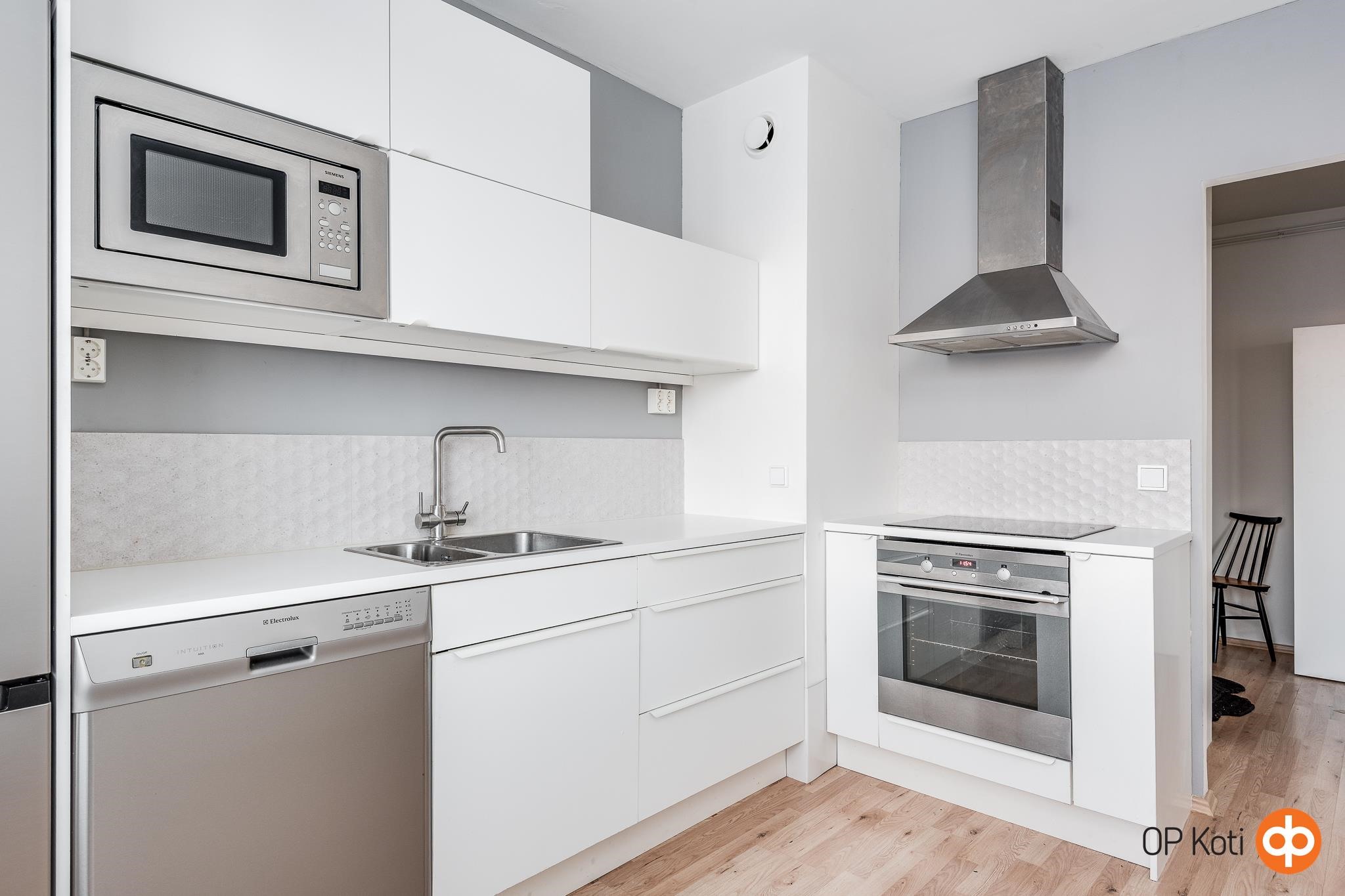 - Jääkaappipakastin, liesitaso, induktioliesi, liesituuletin, mikroaaltouuni, astianpesukone, kaapistot, kiinteät valaisimet.