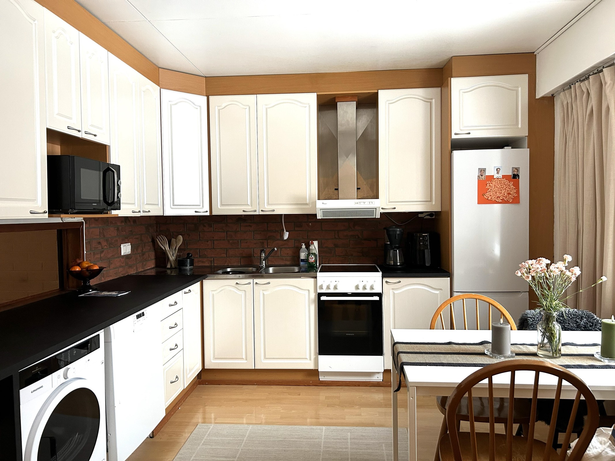 - Jääkaappipakastin, sähköliesi, liesituuletin, astianpesukone, kaapistot, kiinteät valaisimet. Tilava keittiö jossa hyvin kaappitilaa.
