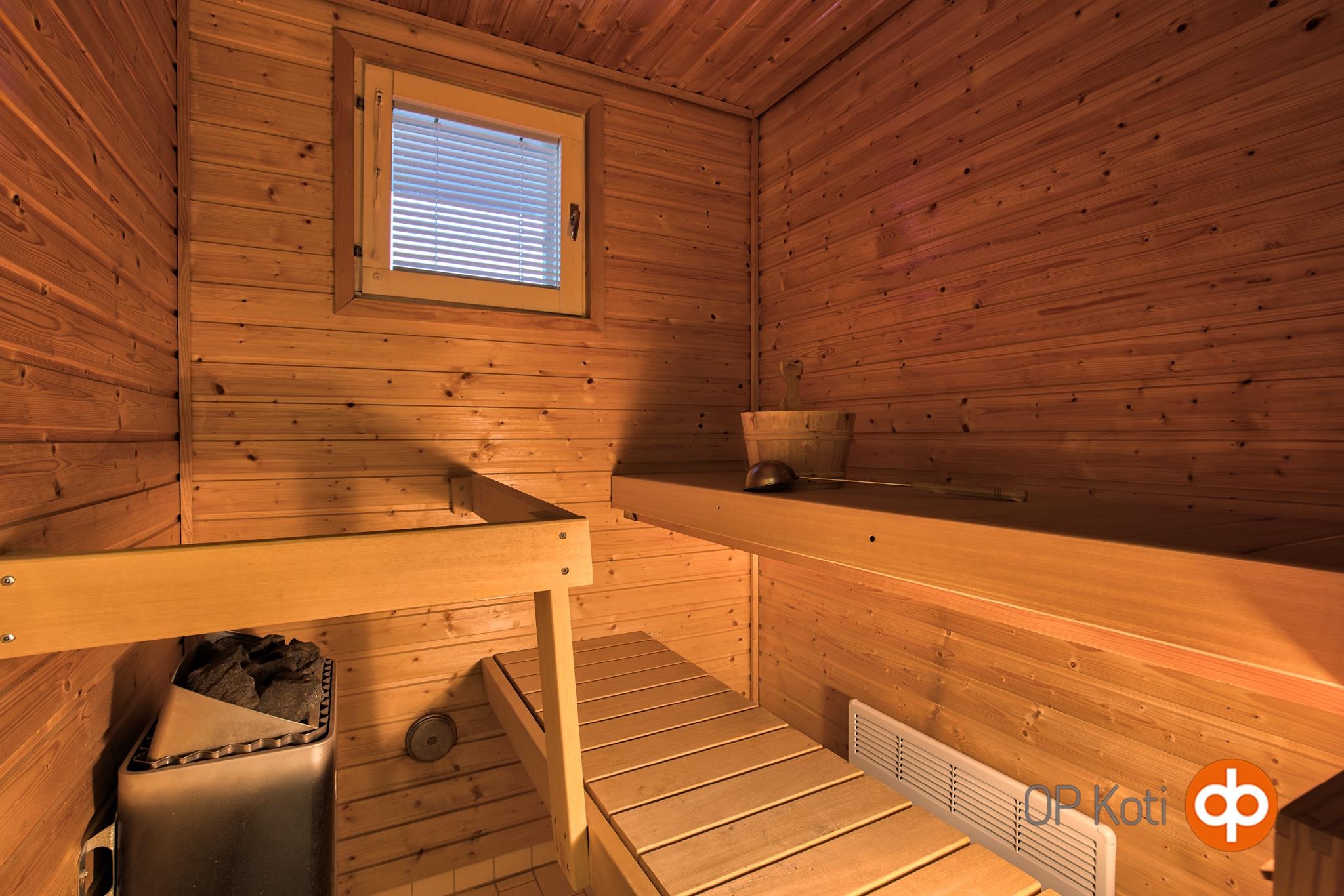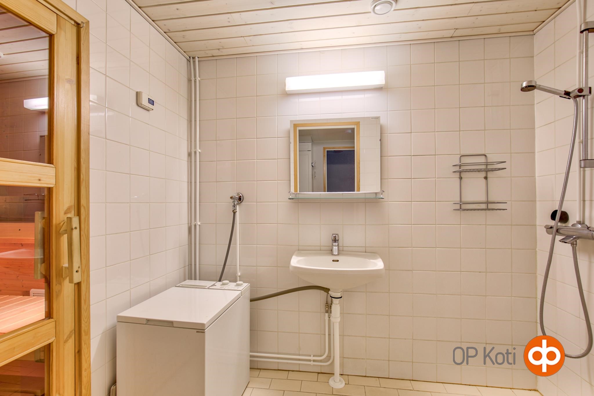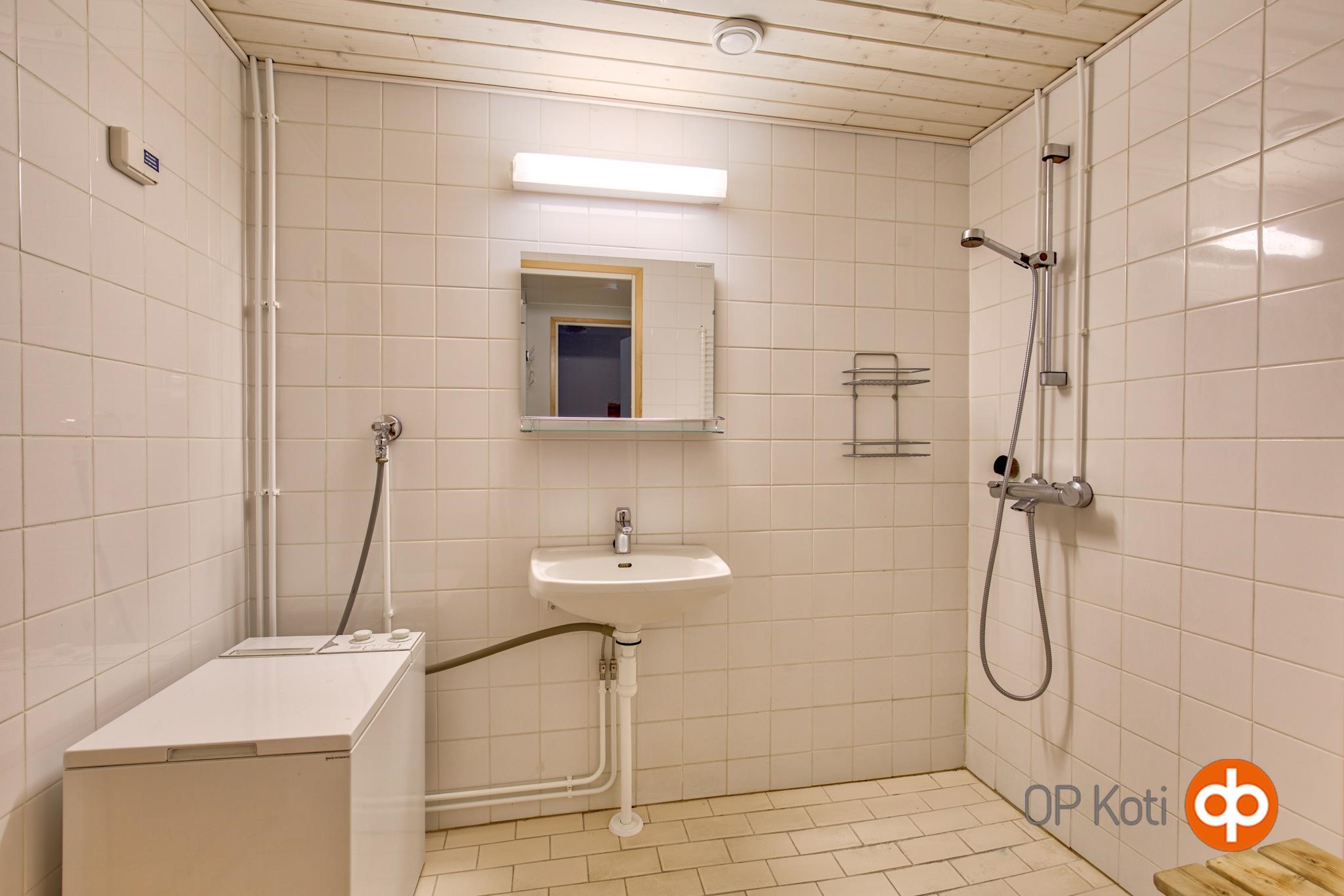 - Sauna, sähkökiuas, kylpyhuone, suihku, pesukoneliitäntä, kiinteät valaisimet.