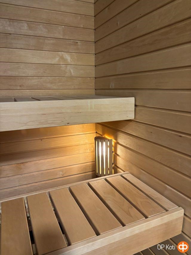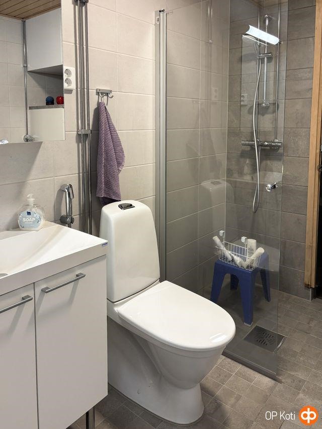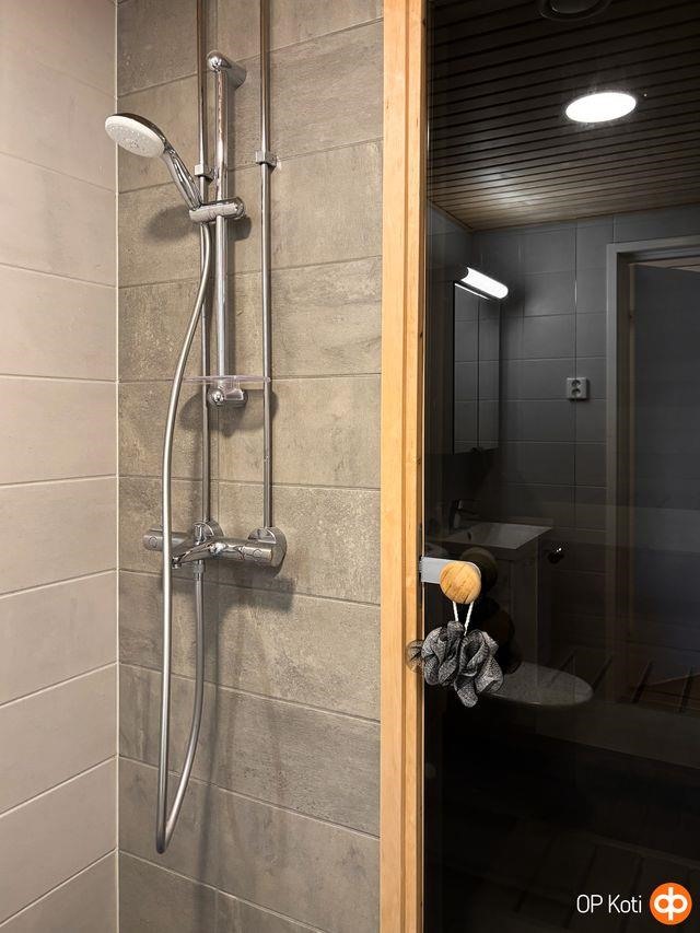 - Sauna, kylpyhuone, suihku, suihkuseinä, peilikaappi, allaskaappi, pesukoneliitäntä, lattialämmitys.