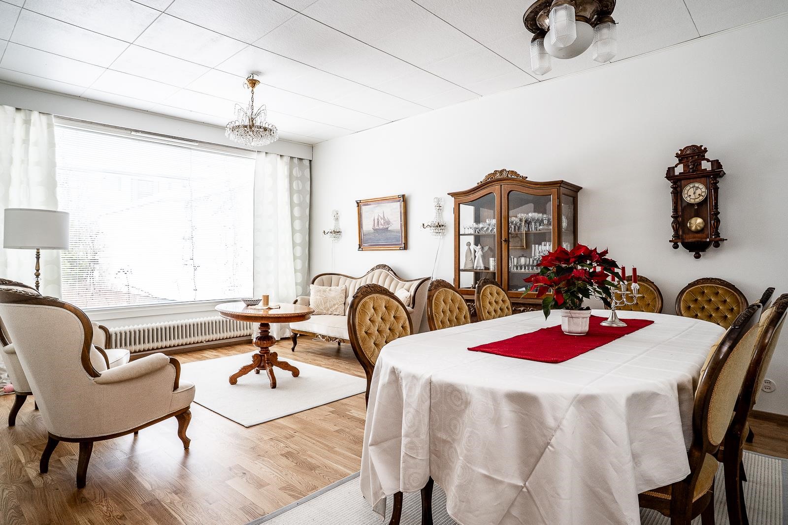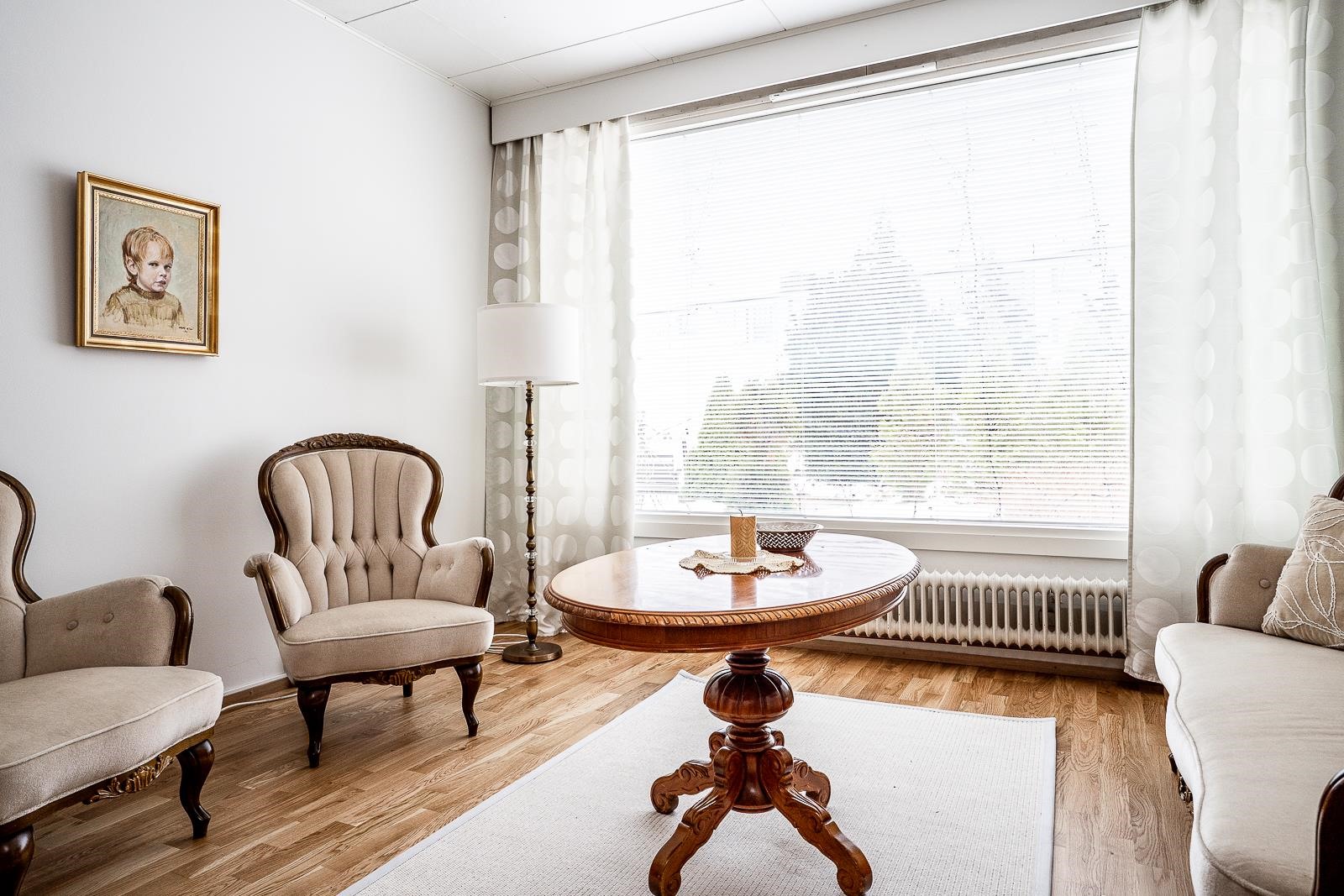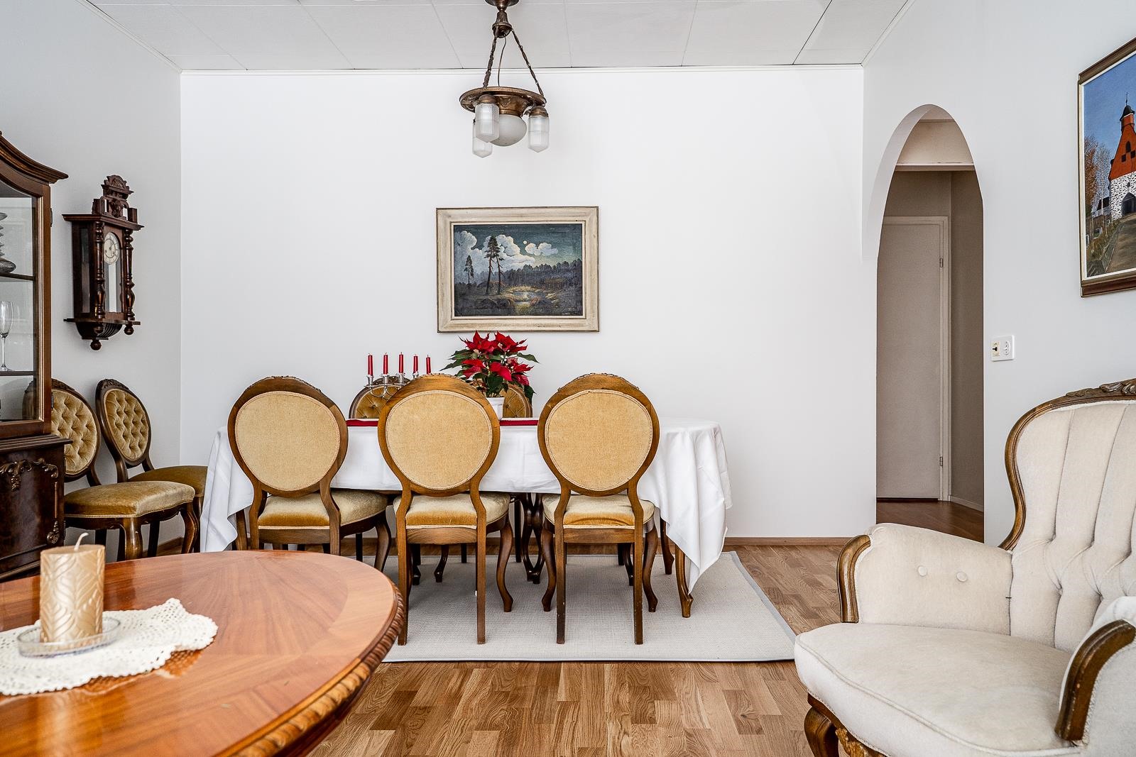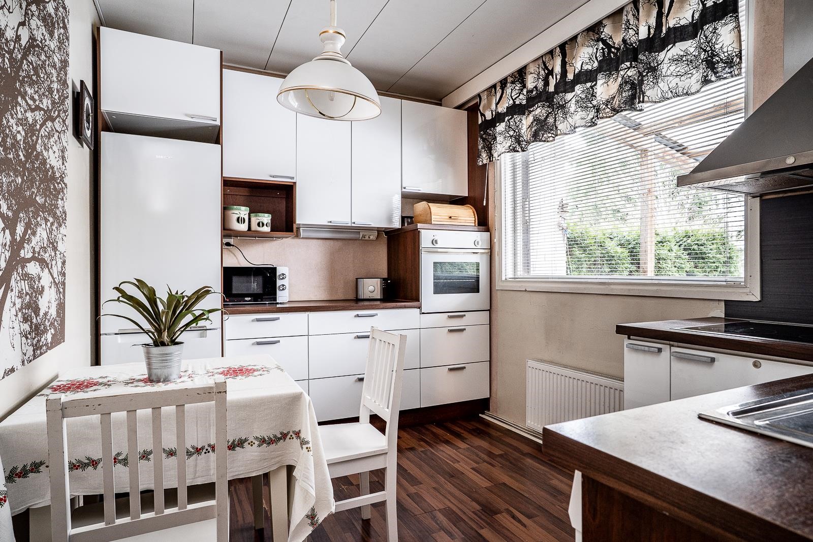 102,5 neliön kodissa on kolme makuuhuonetta, avara olohuone sekä tunnelmallinen takkahuone, joka muuntuu helposti työtilaksi tai rakkaan harrastuksen paikaksi. Keittiö palvelee arjen ruoanlaittoa mutkattomasti ja säilytystilat on suunniteltu käytännöllisesti. Vaatehuone ja ulkovarasto auttavat pitämään kodin järjestyksessä. Kylpyhuone ja sauna on remontoitu 2010 luvulla ja rentouttavat hetket kruunaa erillinen wc. Olohuoneesta avautuvat näkymät itään ja suojaisalla takapihalla kasvavat marjapensaat sekä omenapuu tuovat pihaan oman, lempeän tunnelmansa.