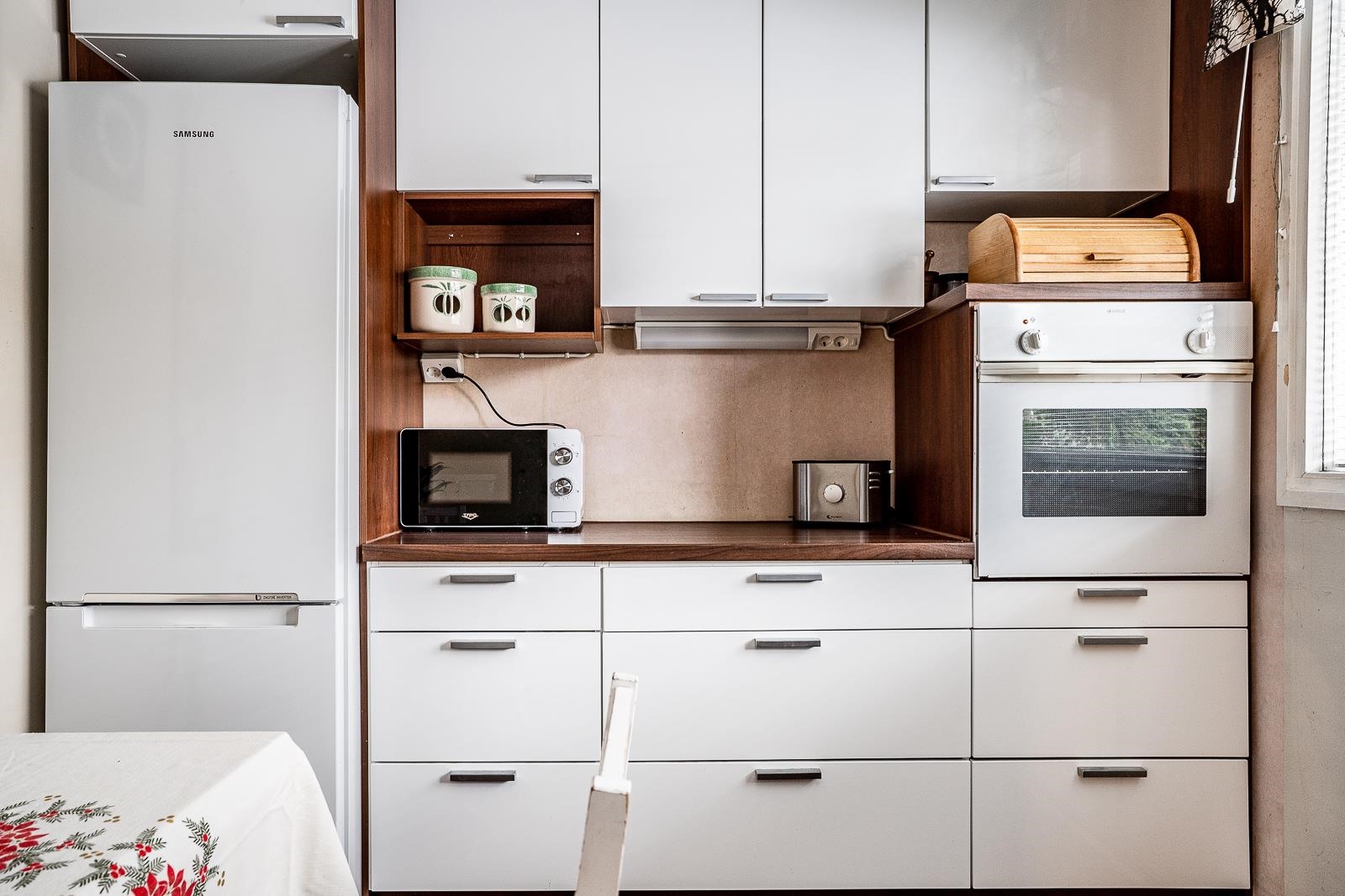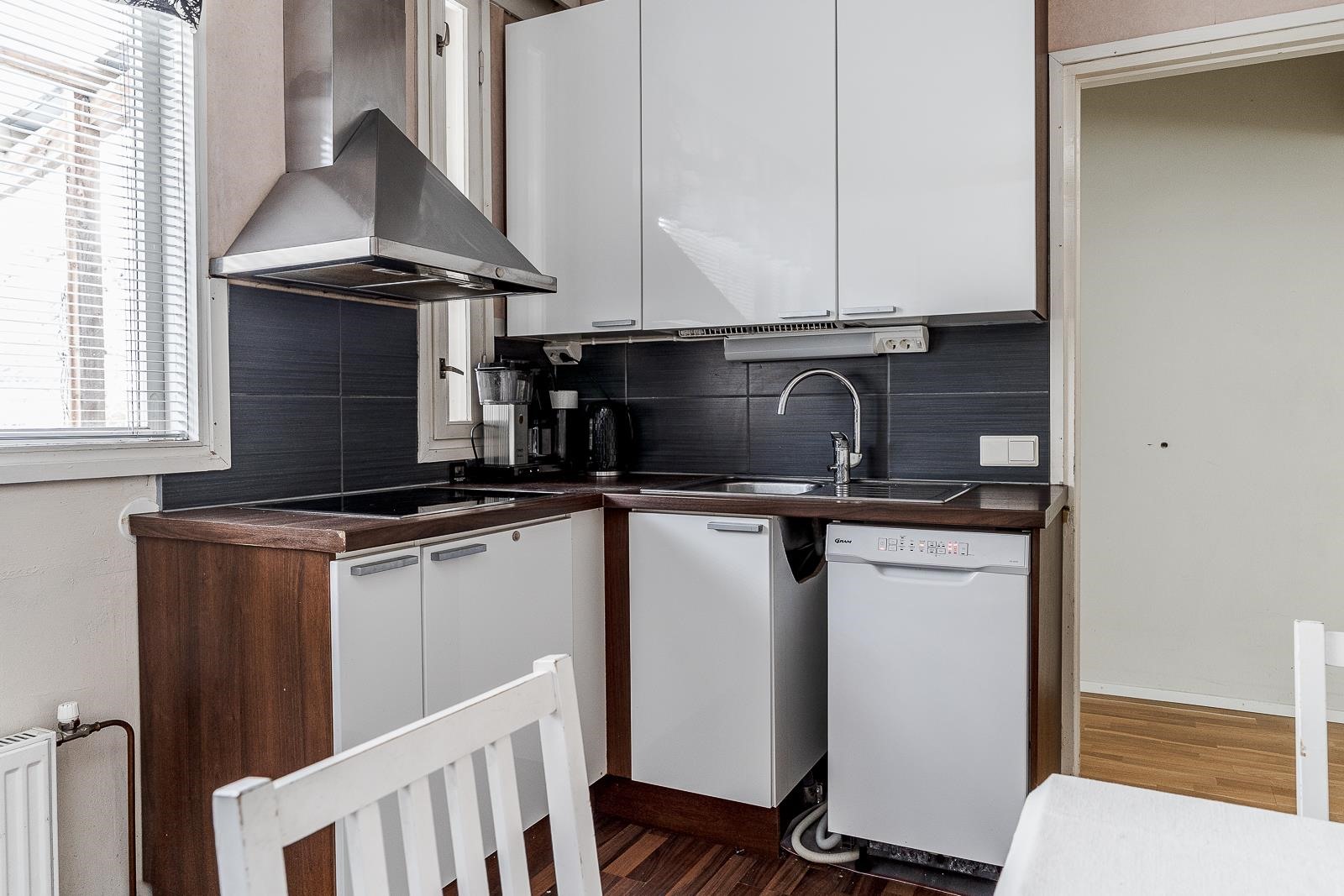 - Jääkaappipakastin, erillisuuni, keraaminen liesi, liesituuletin, astianpesukone, kaapistot, kiinteät valaisimet.