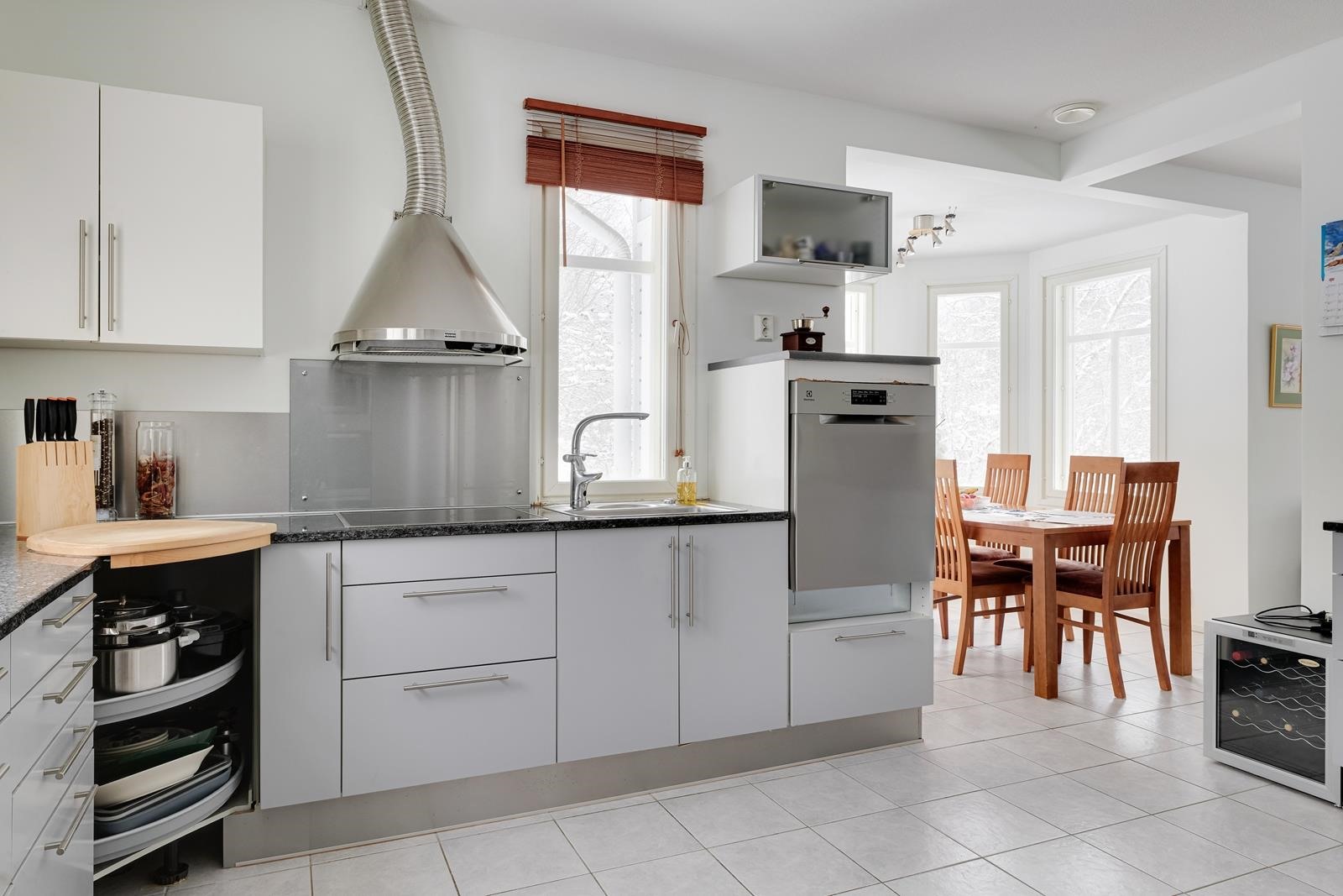 - Jääviileäkaappi 2022, jääkaappipakastin, keraaminen liesi liesituuletin, mikroaaltouuni, astianpesukone 2022. Kaapistot HTH-keittiö, kiinteät valaisimet, pöytätasojen materiaali kivitasot (Ylämaan kivi).
