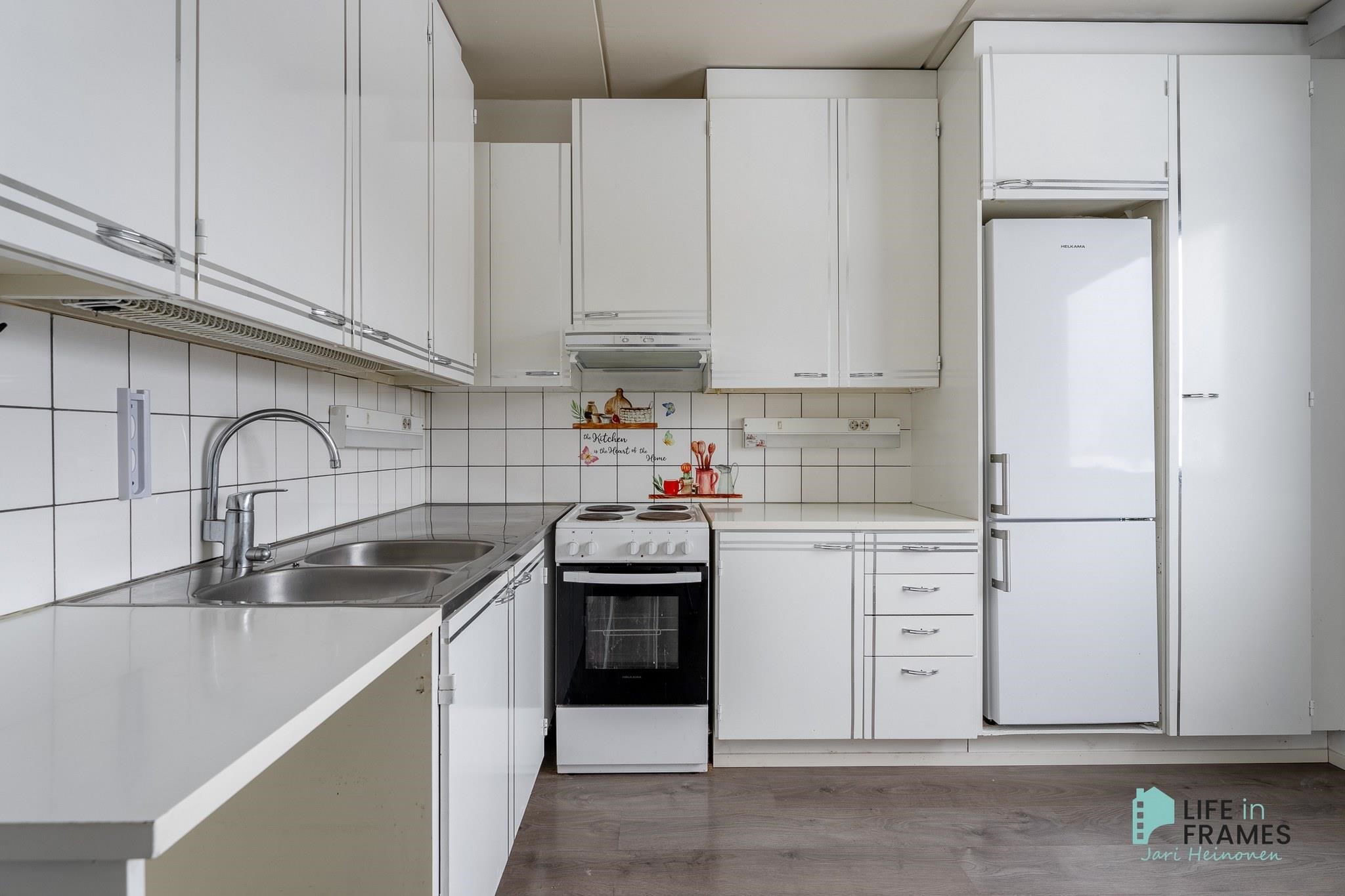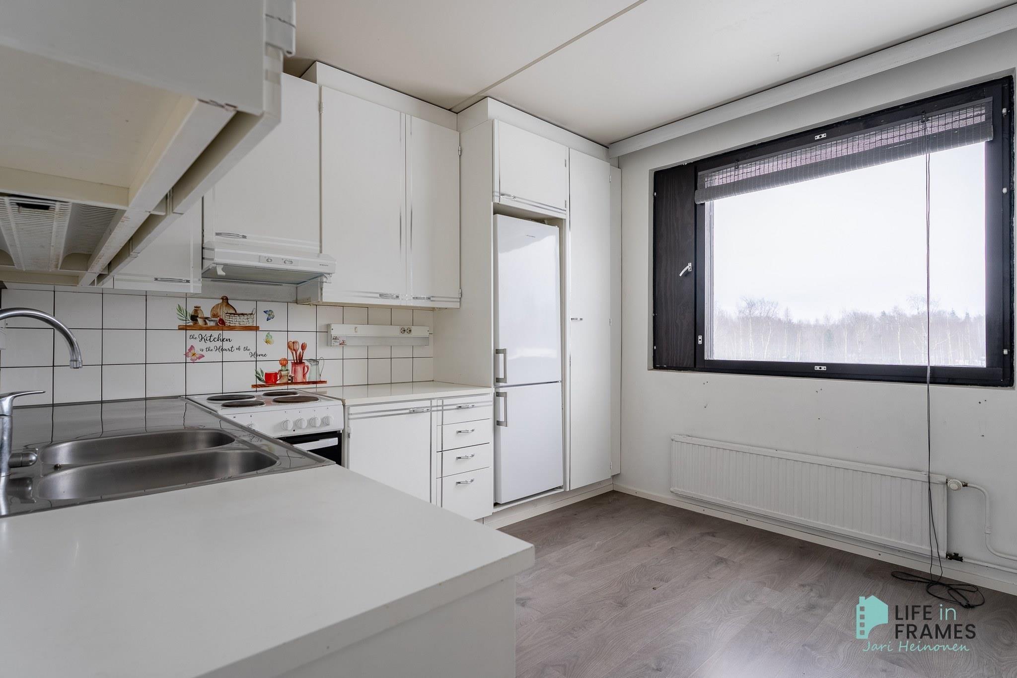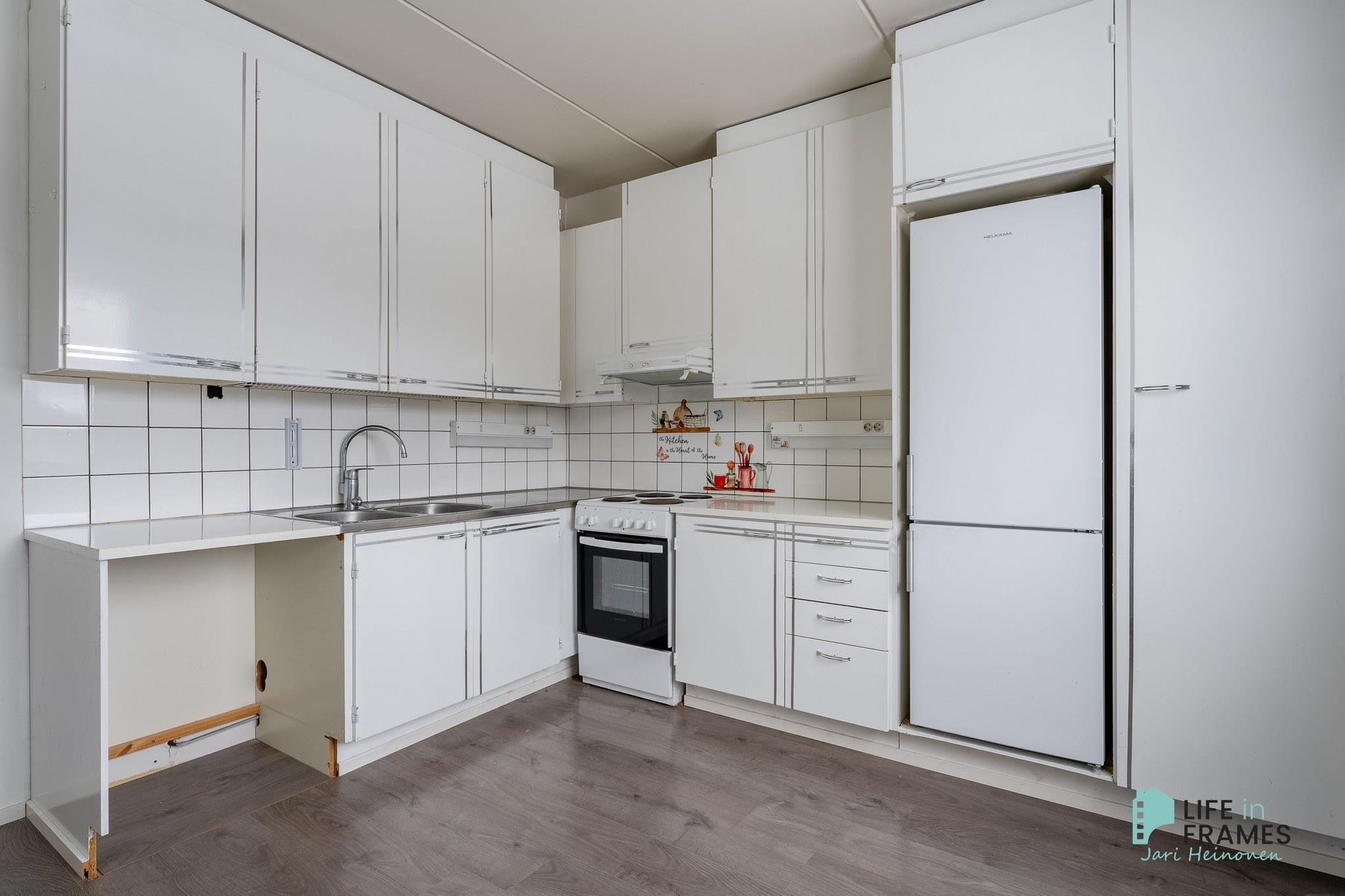 - Jääkaappipakastin, lattialiesi, liesituuletin (aktiivihiili), astianpesukone, kaapistot, kiinteät valaisimet.