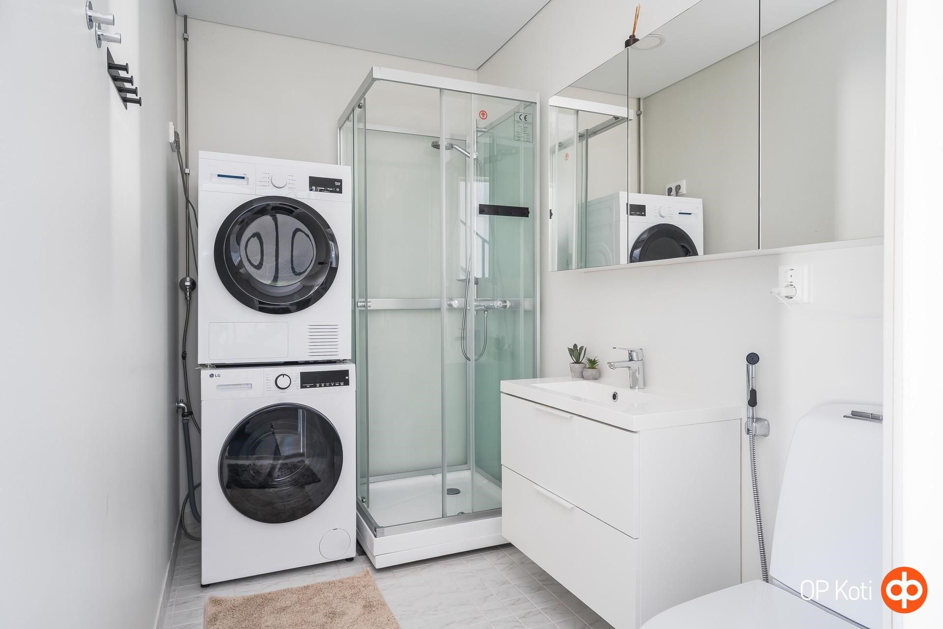 - Sauna, sähkökiuas, kylpyhuone, erillinen wc alakerrassa, suihku, suihkukaappi alakerrassa, peilit, peilikaappi, kaapit, allaskaappi, pesukoneliitäntä alakerrassa, lattialämmitys kaikkialla, kiinteät valaisimet.