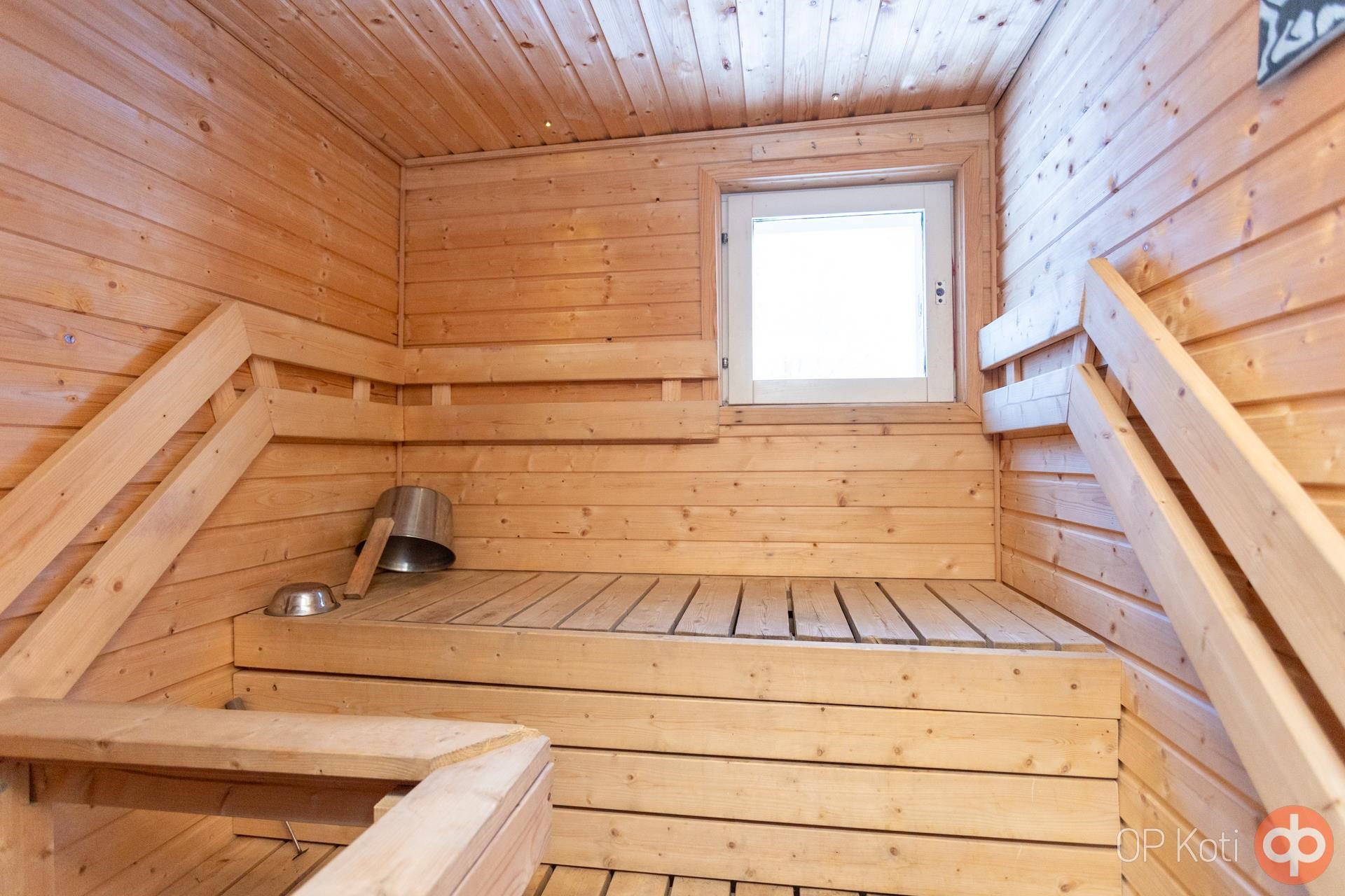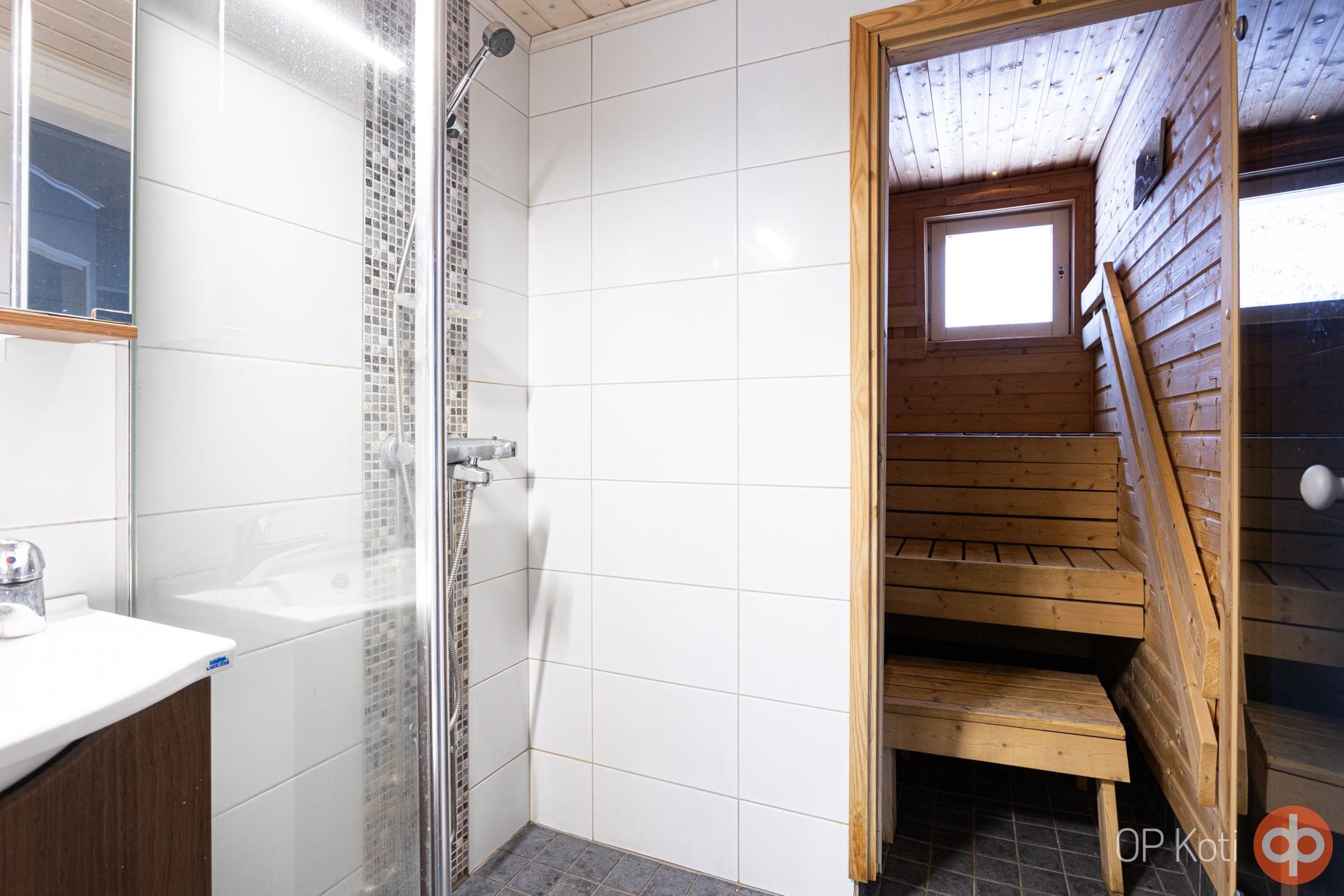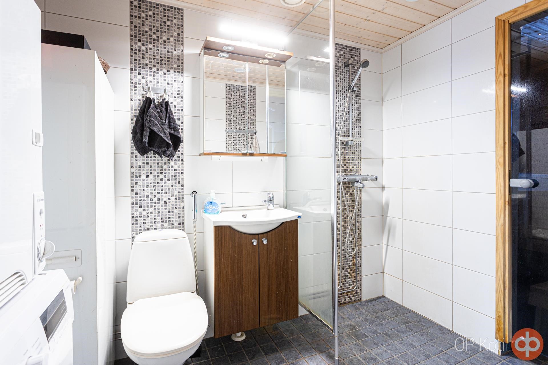 - Sauna, sähkökiuas, kylpyhuone, suihku, peilikaappi, allaskaappi, pesukoneliitäntä, lattialämmitys, kiinteät valaisimet.