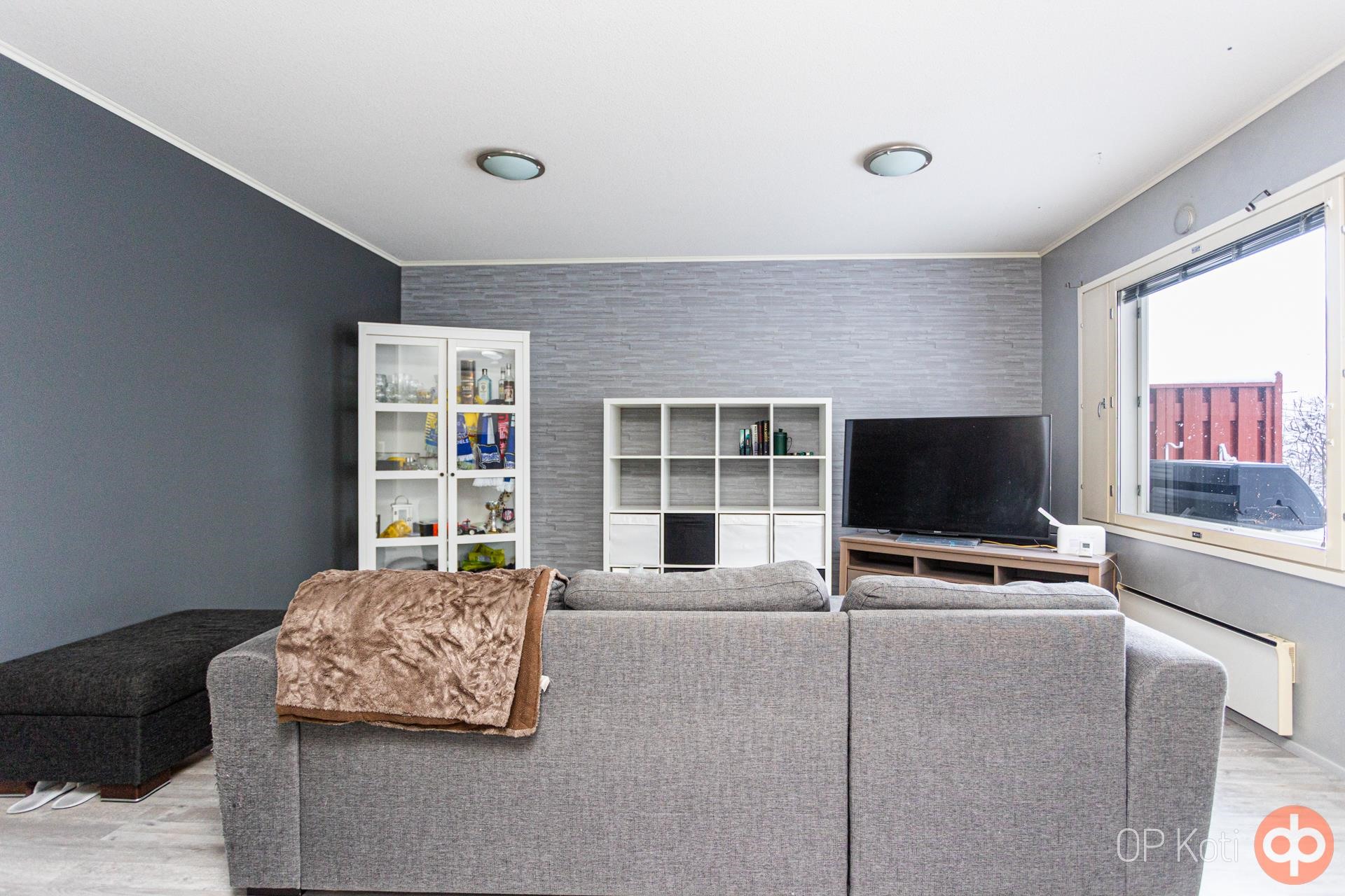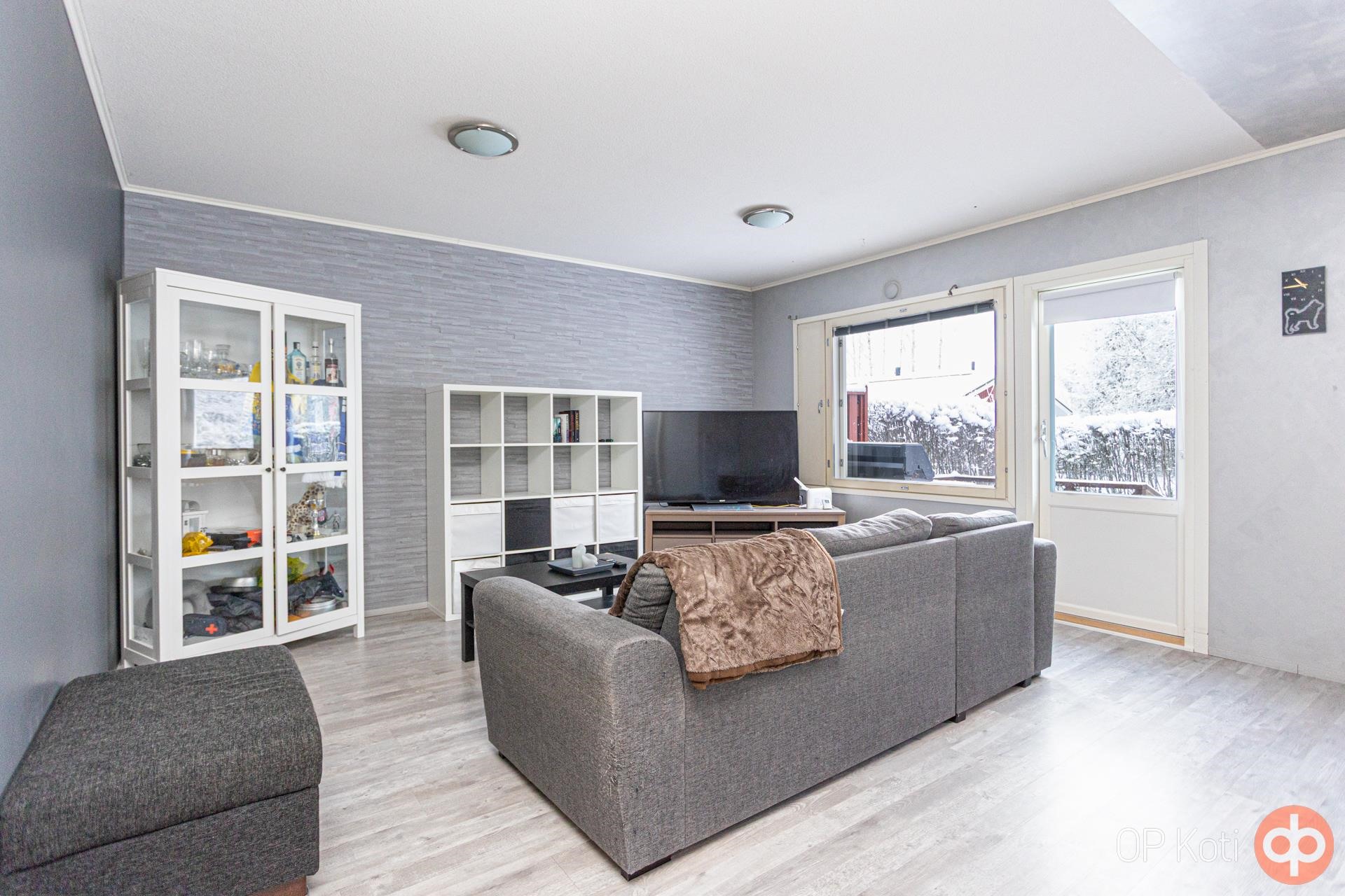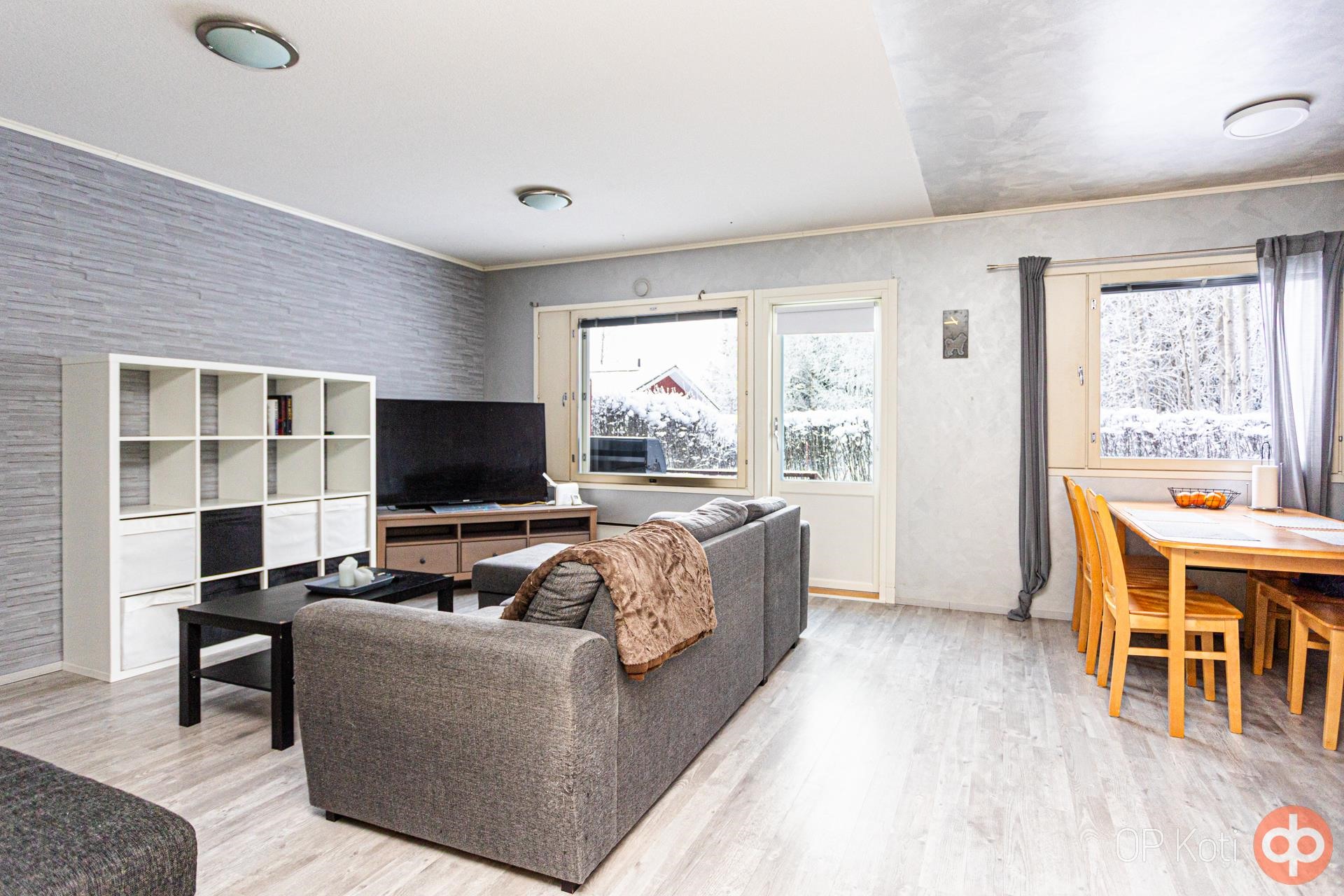 Kodissa on toimiva ja selkeä pohjaratkaisu. Tilava olohuone tarjoaa mukavasti oleskelutilaa ja yhdistyy luontevasti keittiöön. Keittiö on hyvin varusteltu ja arkea helpottavat mm. astianpesukone.