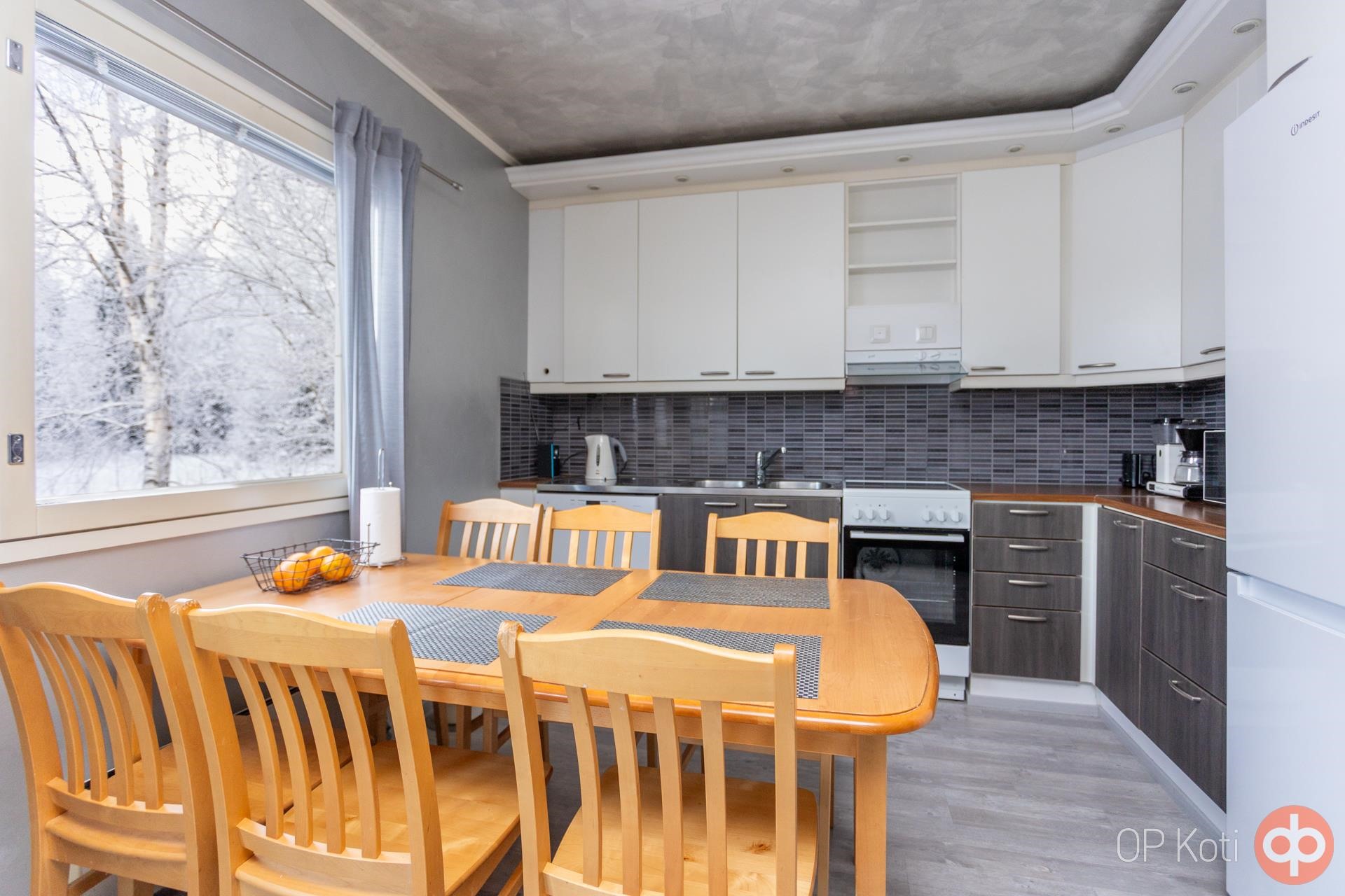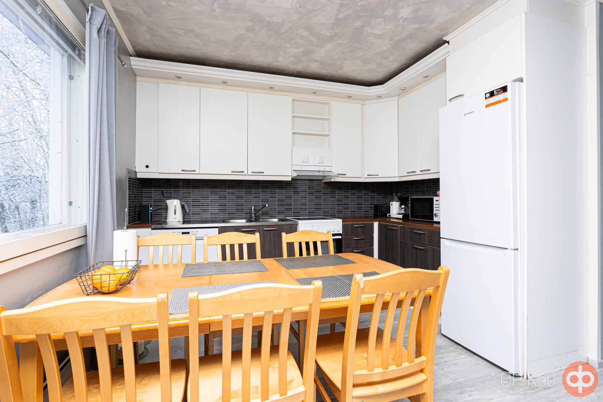 - Jääkaappipakastin, keraaminenliesi, liesituuletin, astianpesukone, kaapistot, kiinteät valaisimet.