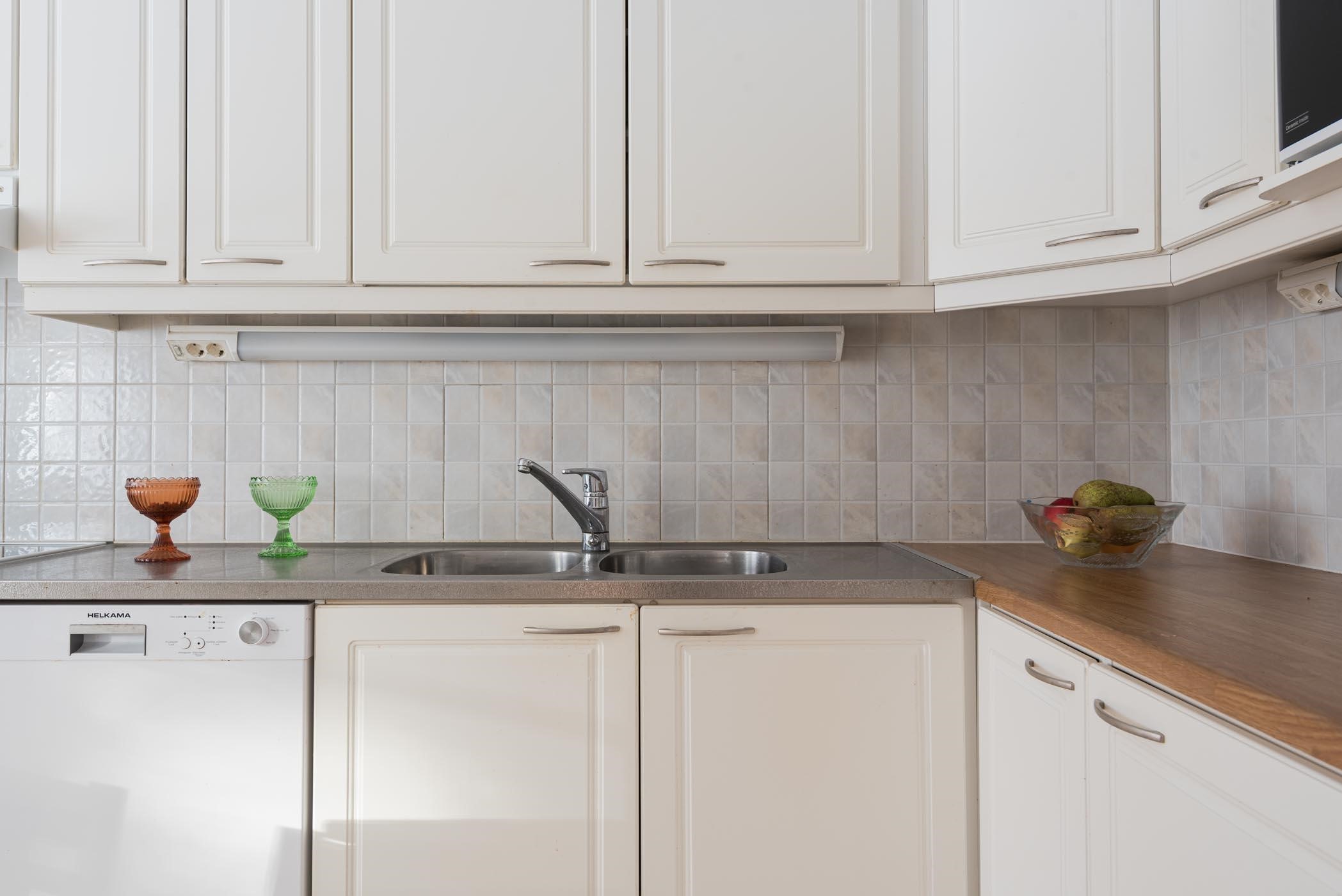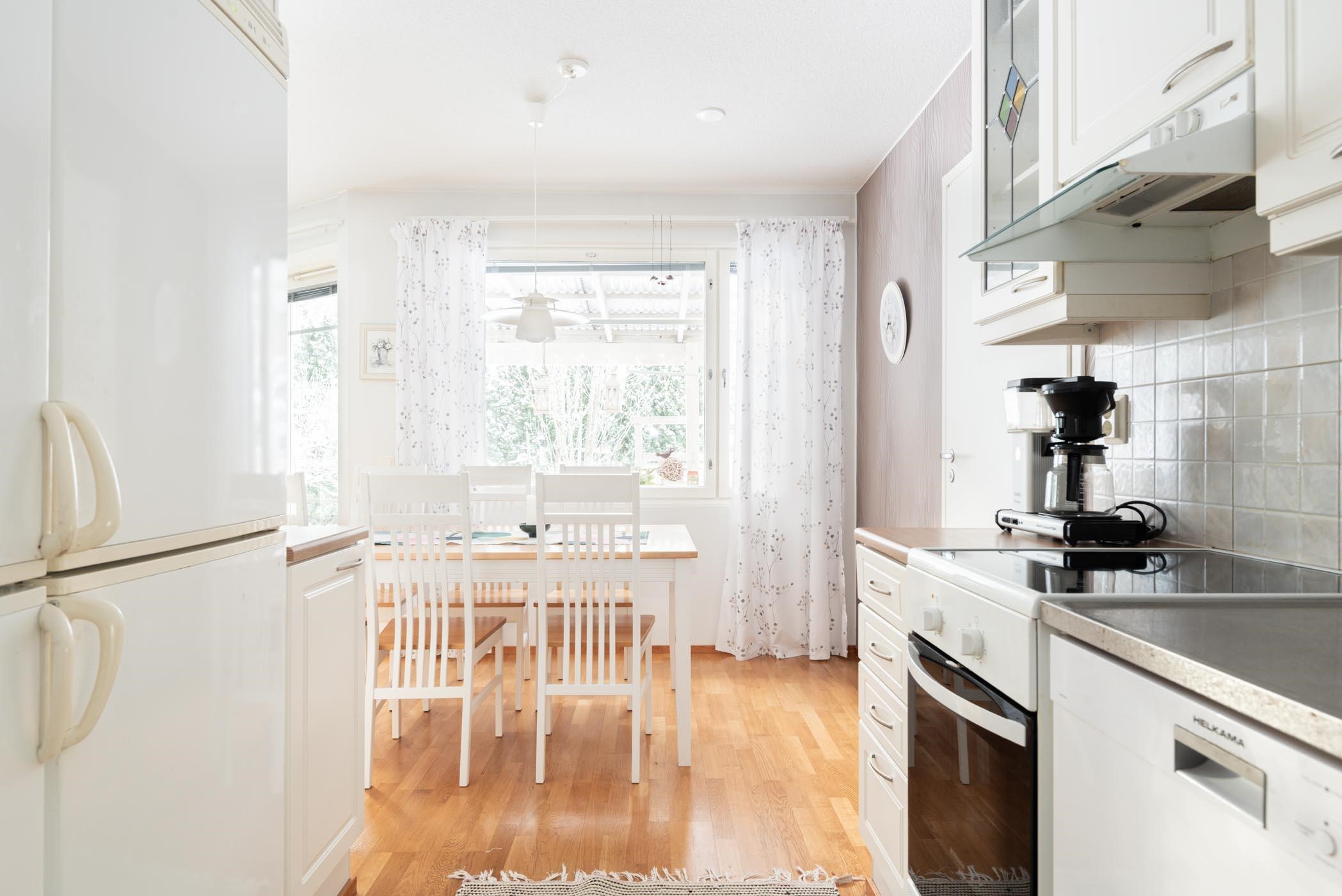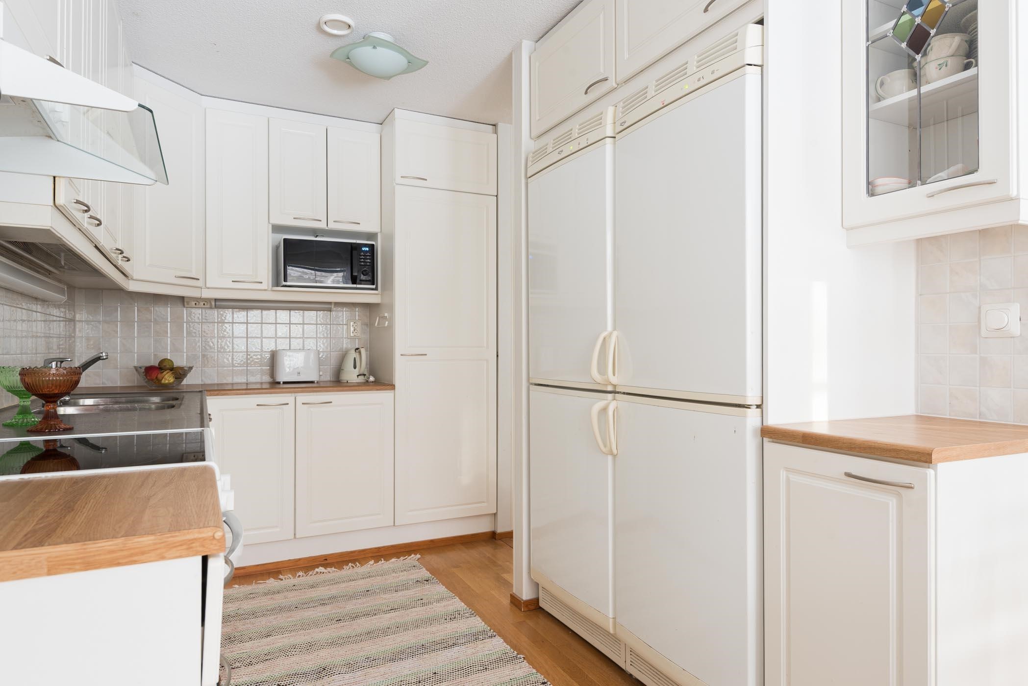 - Keittiössä jääkaappi (alkuperäinen), pakastekaappi (alkuperäinen), induktioliesi, liesituuletin, astianpesukone (uusittu 2018), kaapistot, sekä kiinteät valaisimet.