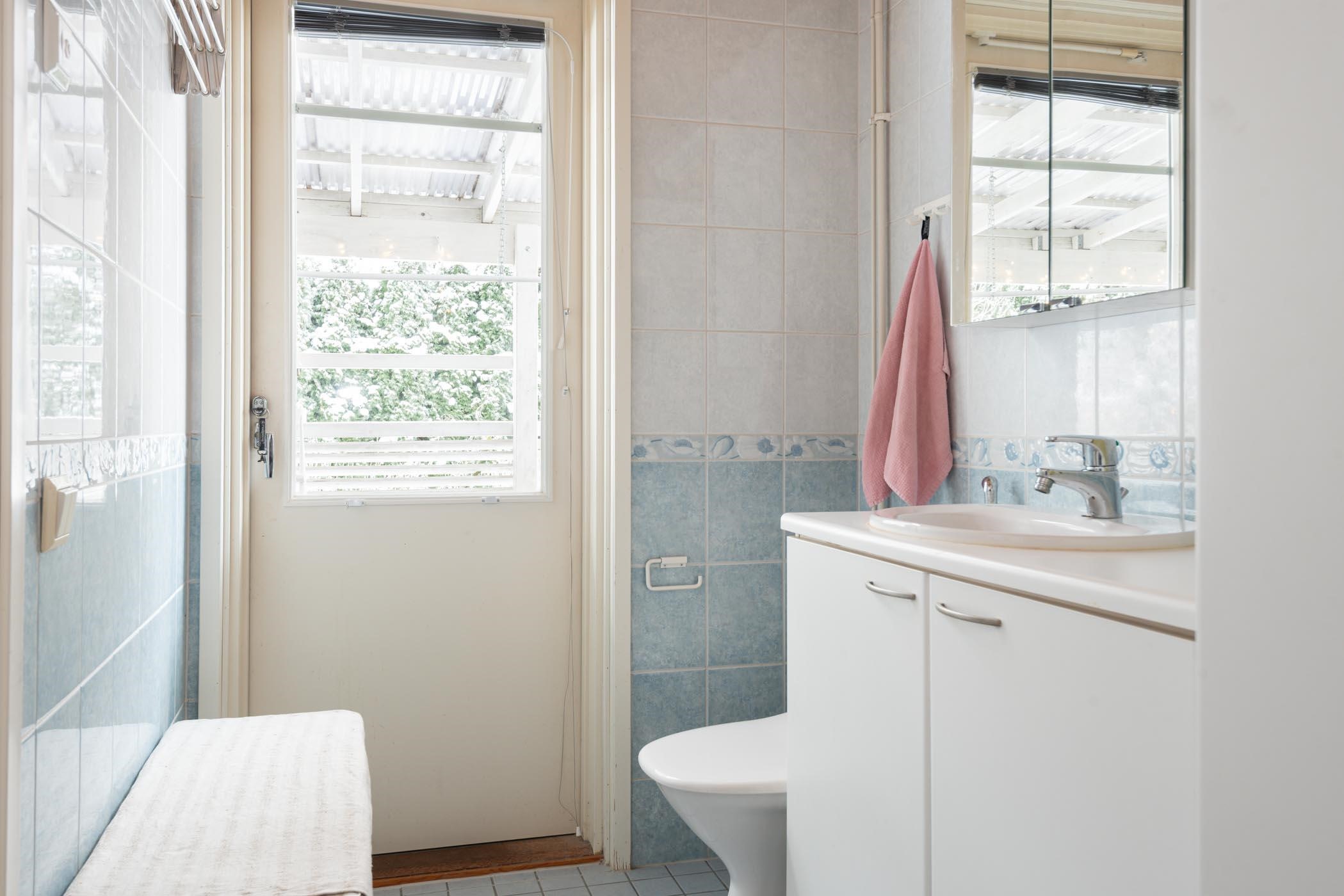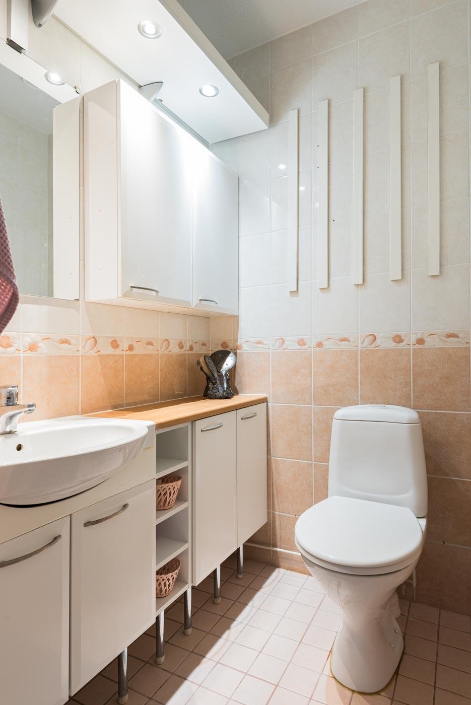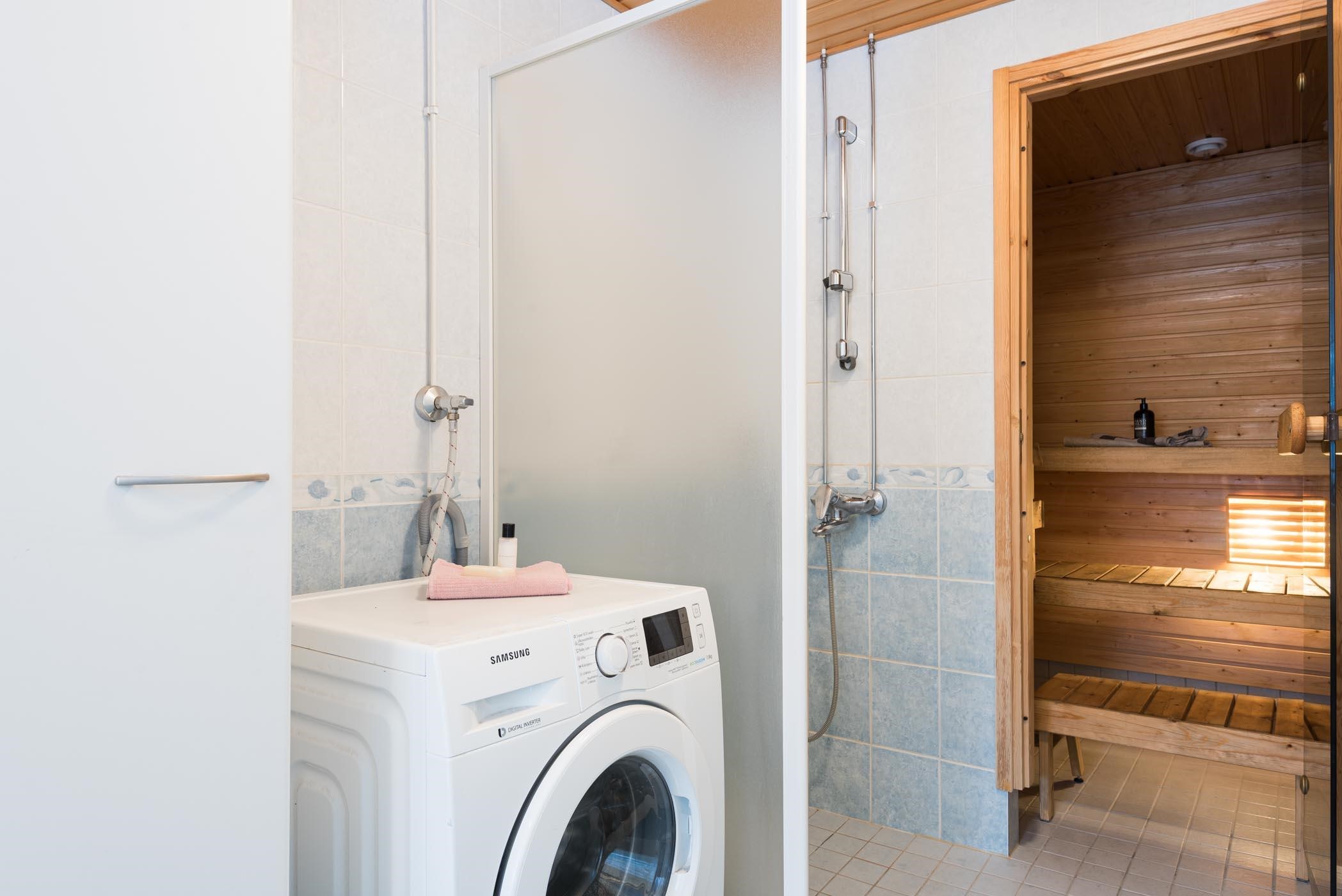 - Saunassa sähkökiuas Kylpyhuoneessa suihku, suihkuseinä, peilikaappi, allaskaappi, pesukoneliitäntä, lattialämmitys, sekä kiinteät valaisimet. Erillisessä WC:ssä allaskaappi, peilikaappi, lattialämmitys, sekä kiinteät valaisimet.