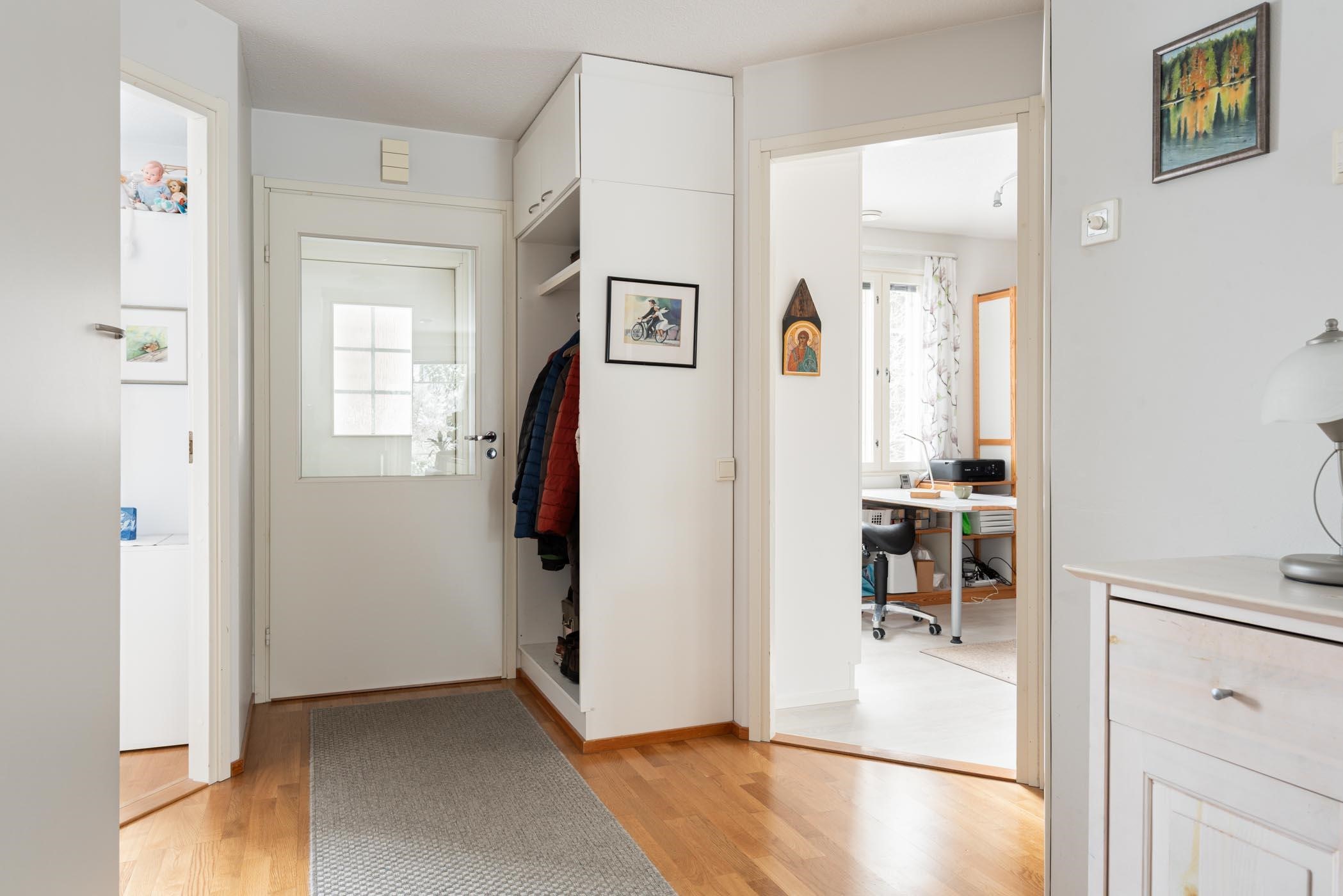 Keittiö: Lattiassa parketti, seinät tapetoidut. Olohuone: Lattiassa parketti, seinät tapetoidut. Makuuhuone 1: Lattiassa laminaatti, seinät tapetoidut. Makuuhuone 2: Lattiassa laminaatti, seinät tapetoidut. Makuuhuone 3: Lattiassa parketti, seinät tapetoidut. Kodinhoitohuone: Lattiassa, sekä seinissä laatat. Sauna: Saunassa laatat, seinät on paneloidut. Kylpyhuone: Lattiassa, sekä seinissä laatat. Eteinen: Lattiassa parketti, seinät tapetoidut. Wc: Lattiassa, sekä seinissä laatat.