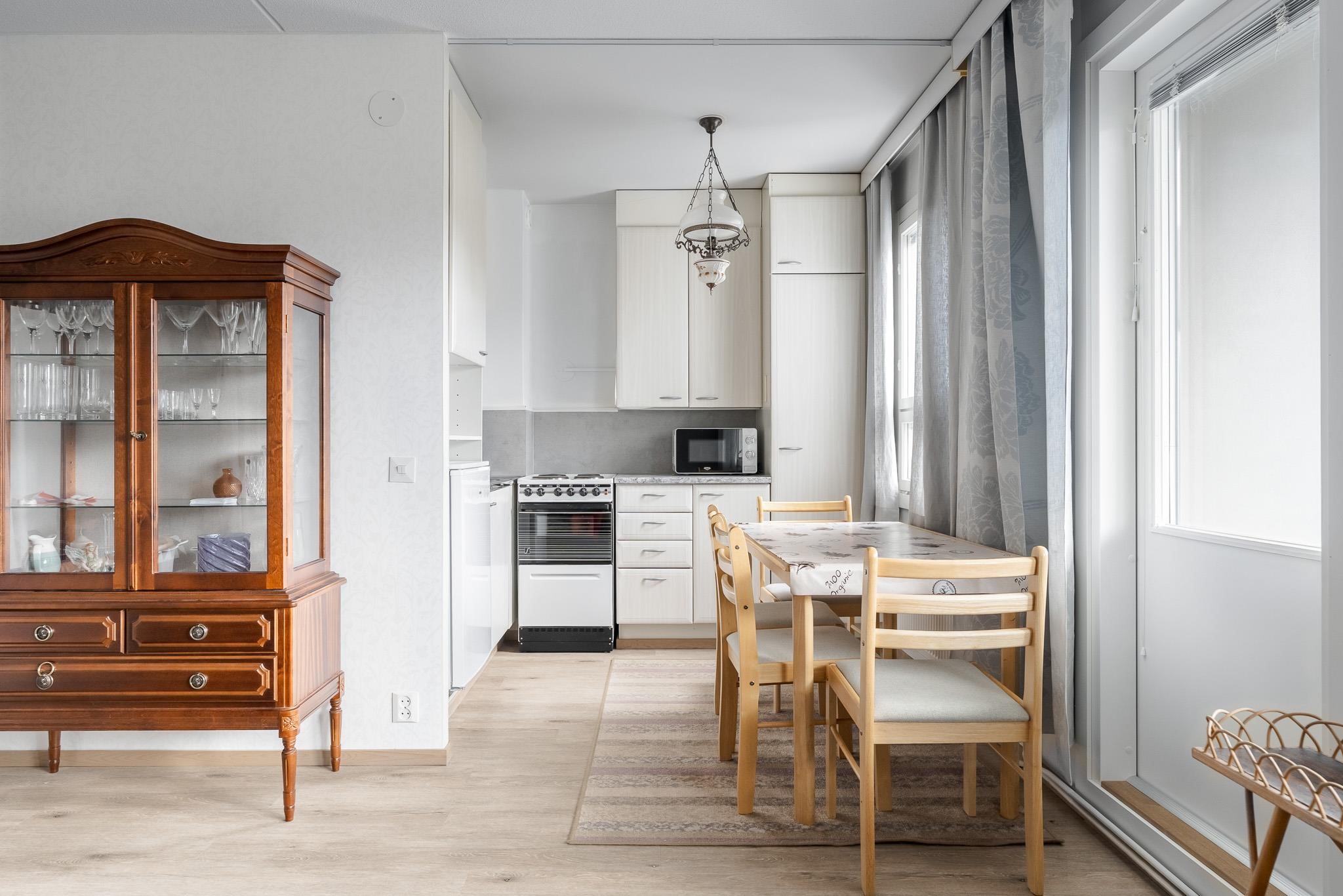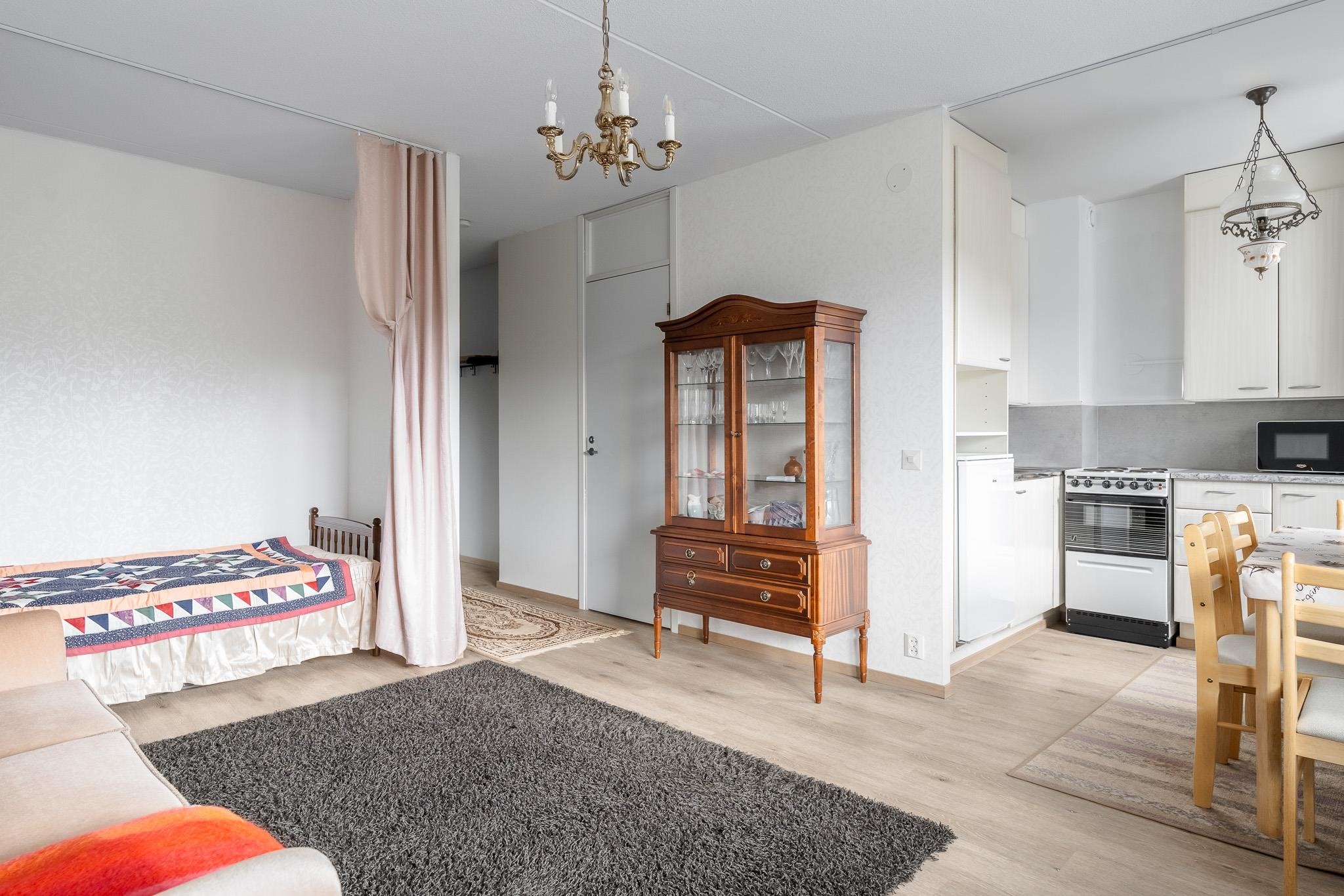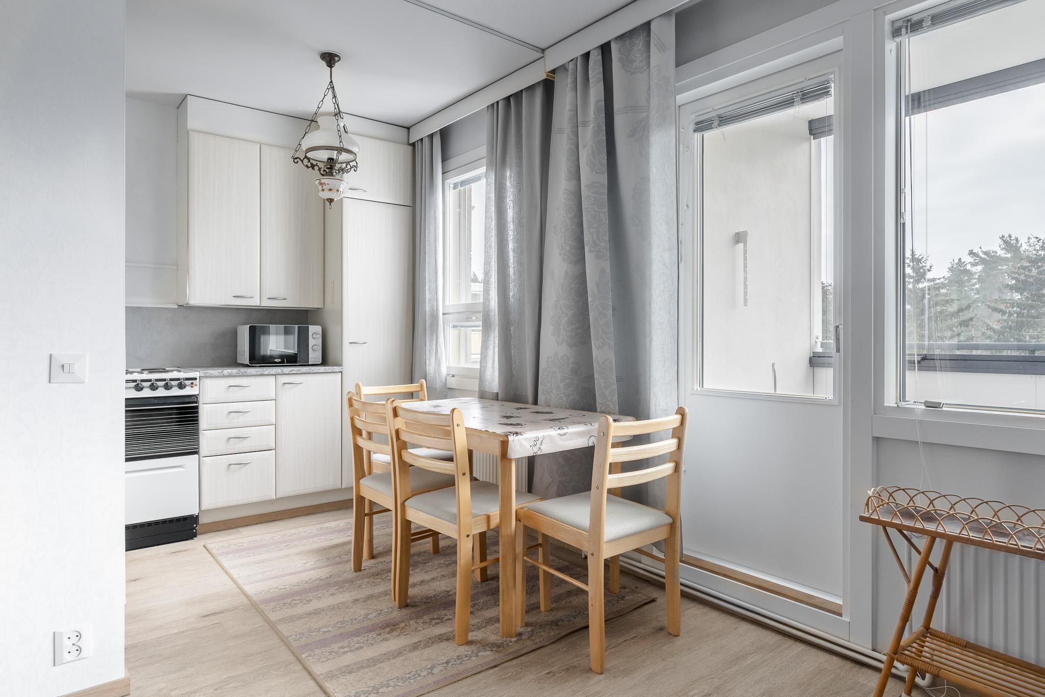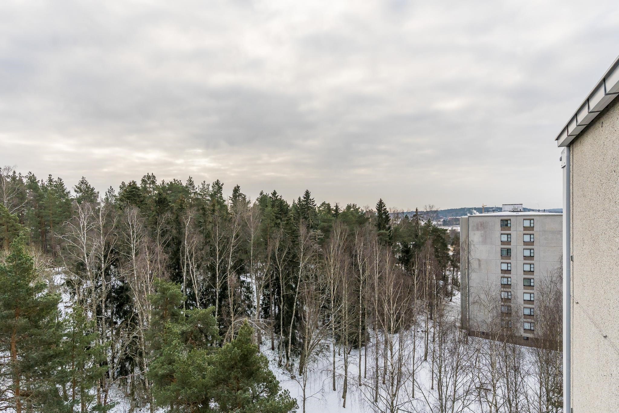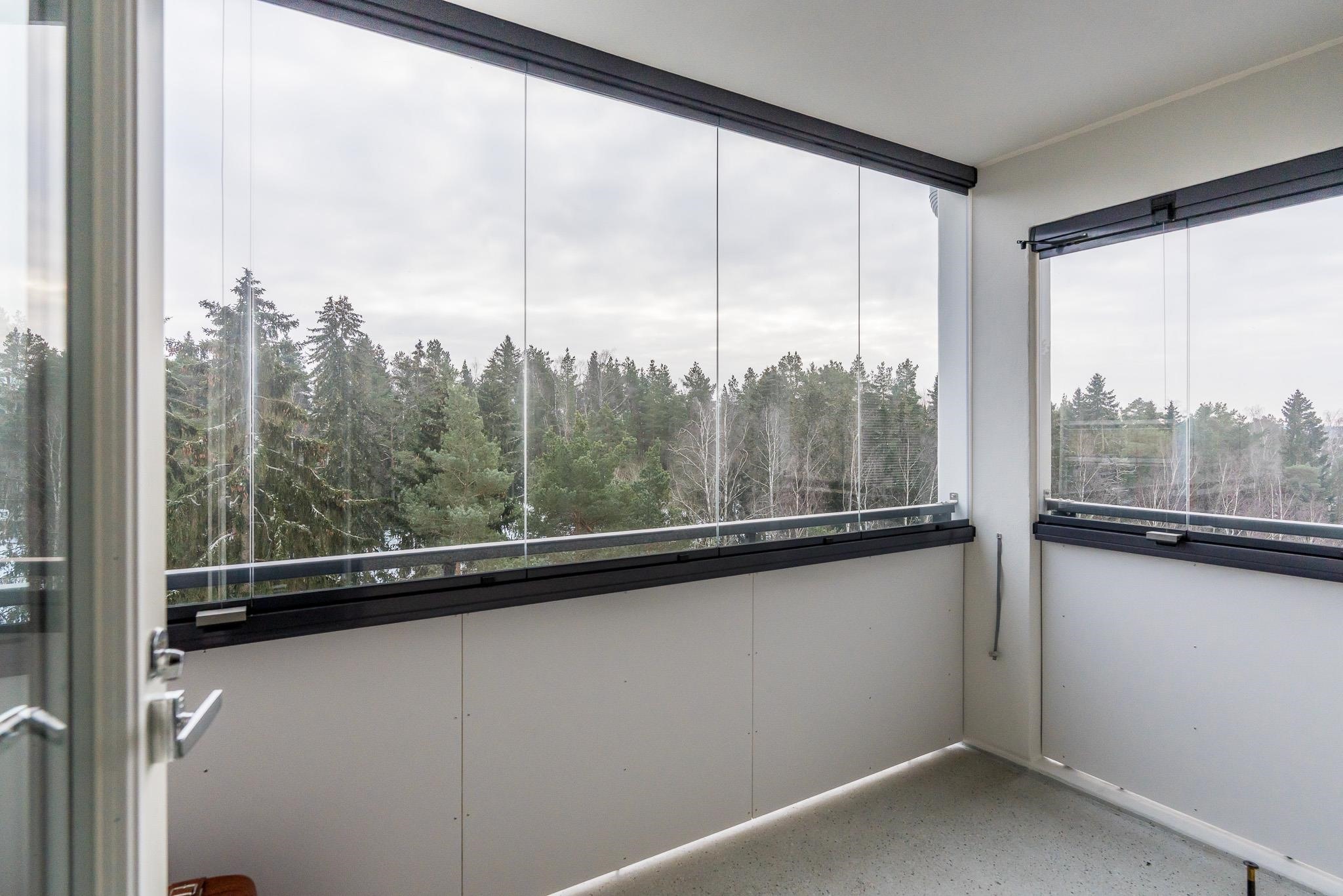 Eteisen yhteydessä sijaitsee hyvän kokoinen vaatehuone. Klpyhuoneessa on hyvin tilaa myös pyykinpesukoneelle. Avokeittiö luo tilantuntua ja järkevästi suunniteltu asunto on helppo kalustaa. Oleskelutilaan mahtuu niin pieni pöytäryhmä kuin sohvakin. Sängyn sijoitat kätevästi alkovin rauhaan. Kodin kruunaa oma sauna ja lasitettu parveke, josta on vehreät kahdeksannen kerroksen näkymät yli puiden latvojen.