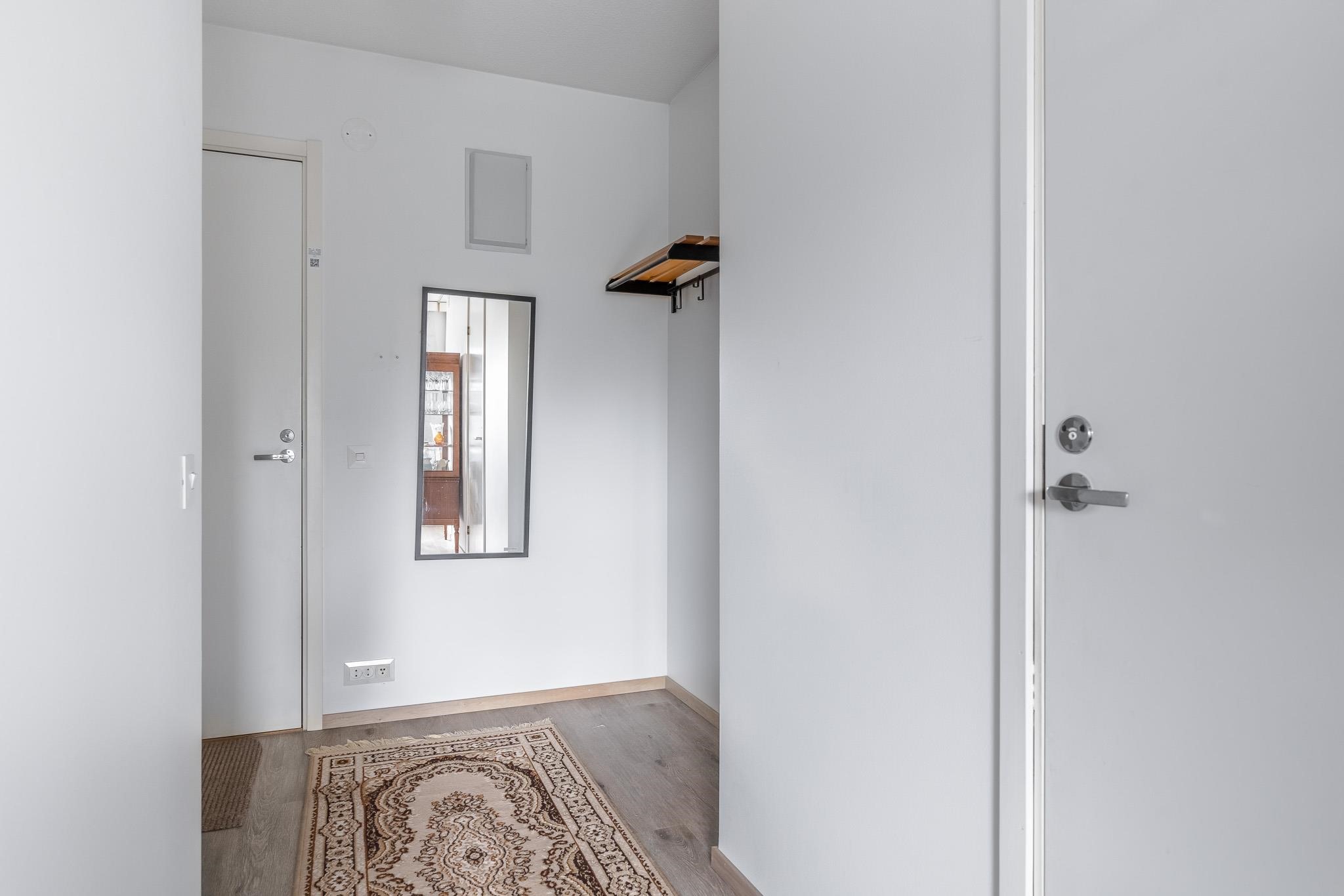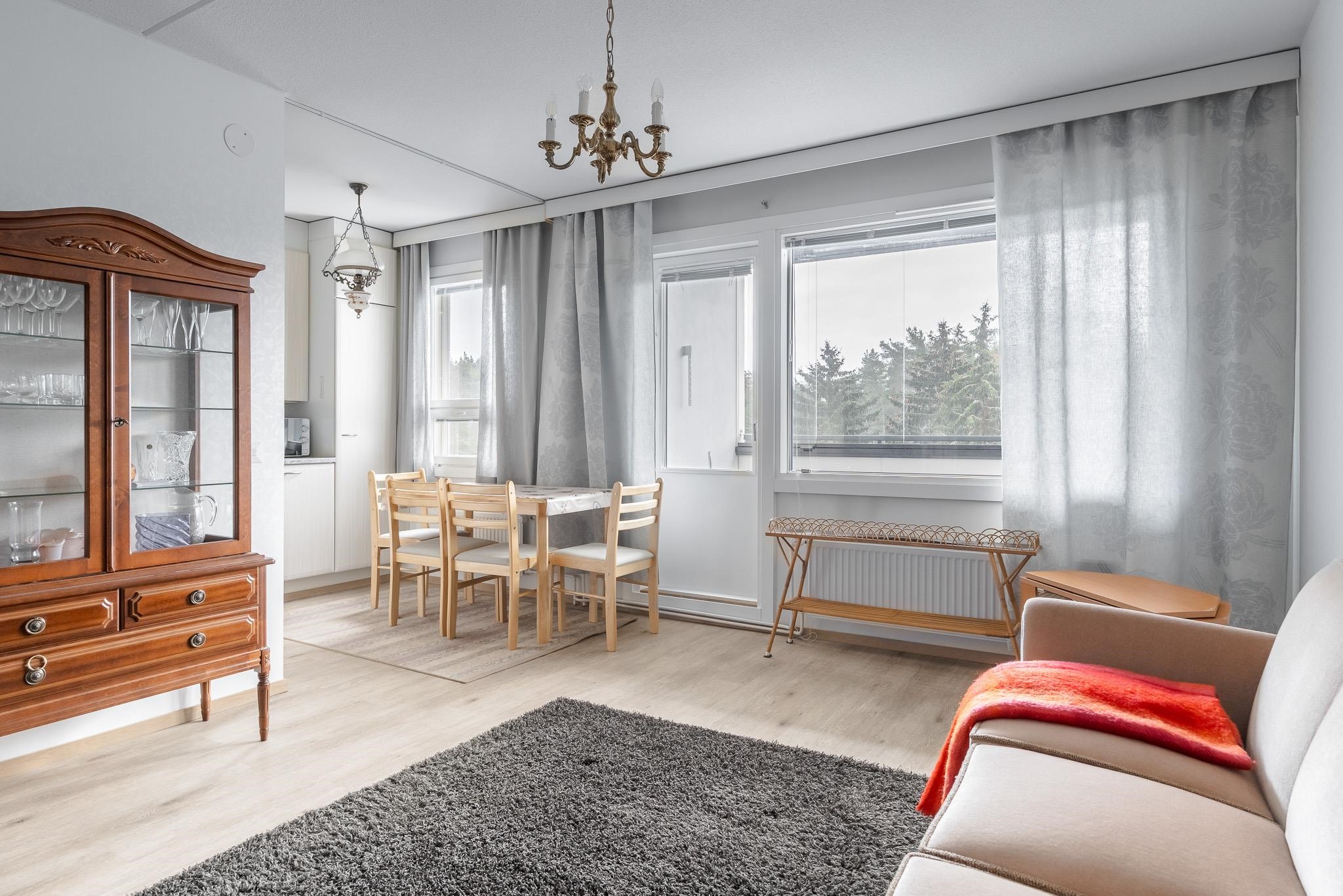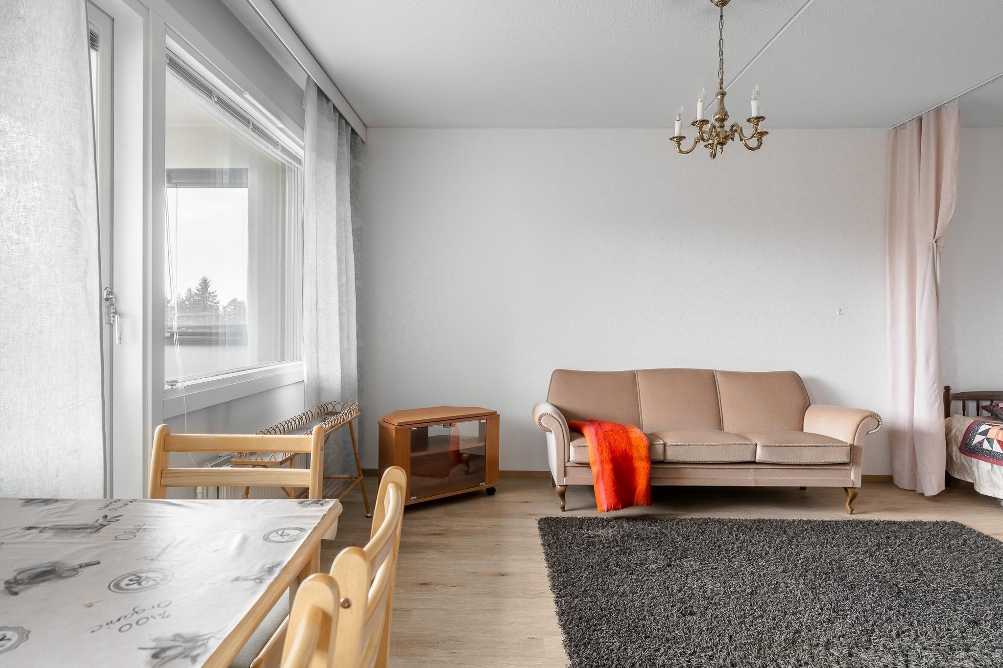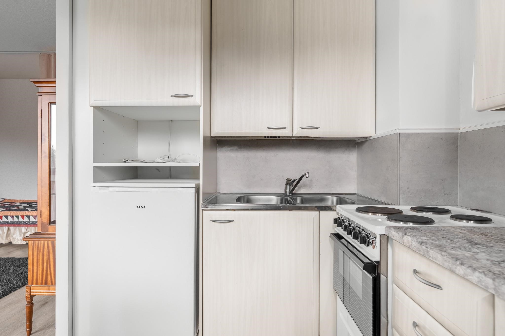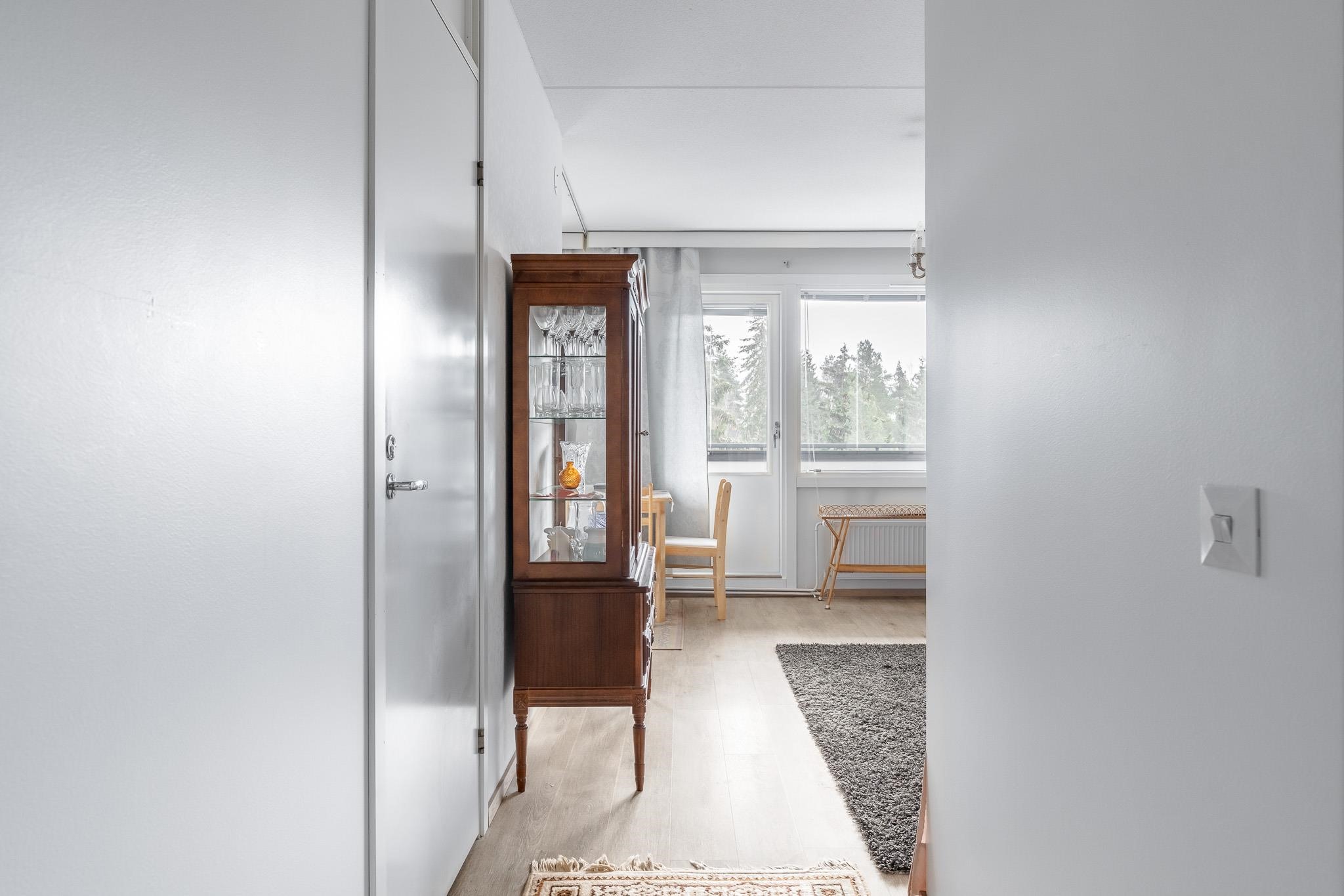 Eteisen yhteydessä sijaitsee hyvän kokoinen vaatehuone. Klpyhuoneessa on hyvin tilaa myös pyykinpesukoneelle. Avokeittiö luo tilantuntua ja järkevästi suunniteltu asunto on helppo kalustaa. Oleskelutilaan mahtuu niin pieni pöytäryhmä kuin sohvakin. Sängyn sijoitat kätevästi alkovin rauhaan. Kodin kruunaa oma sauna ja lasitettu parveke, josta on vehreät kahdeksannen kerroksen näkymät yli puiden latvojen.